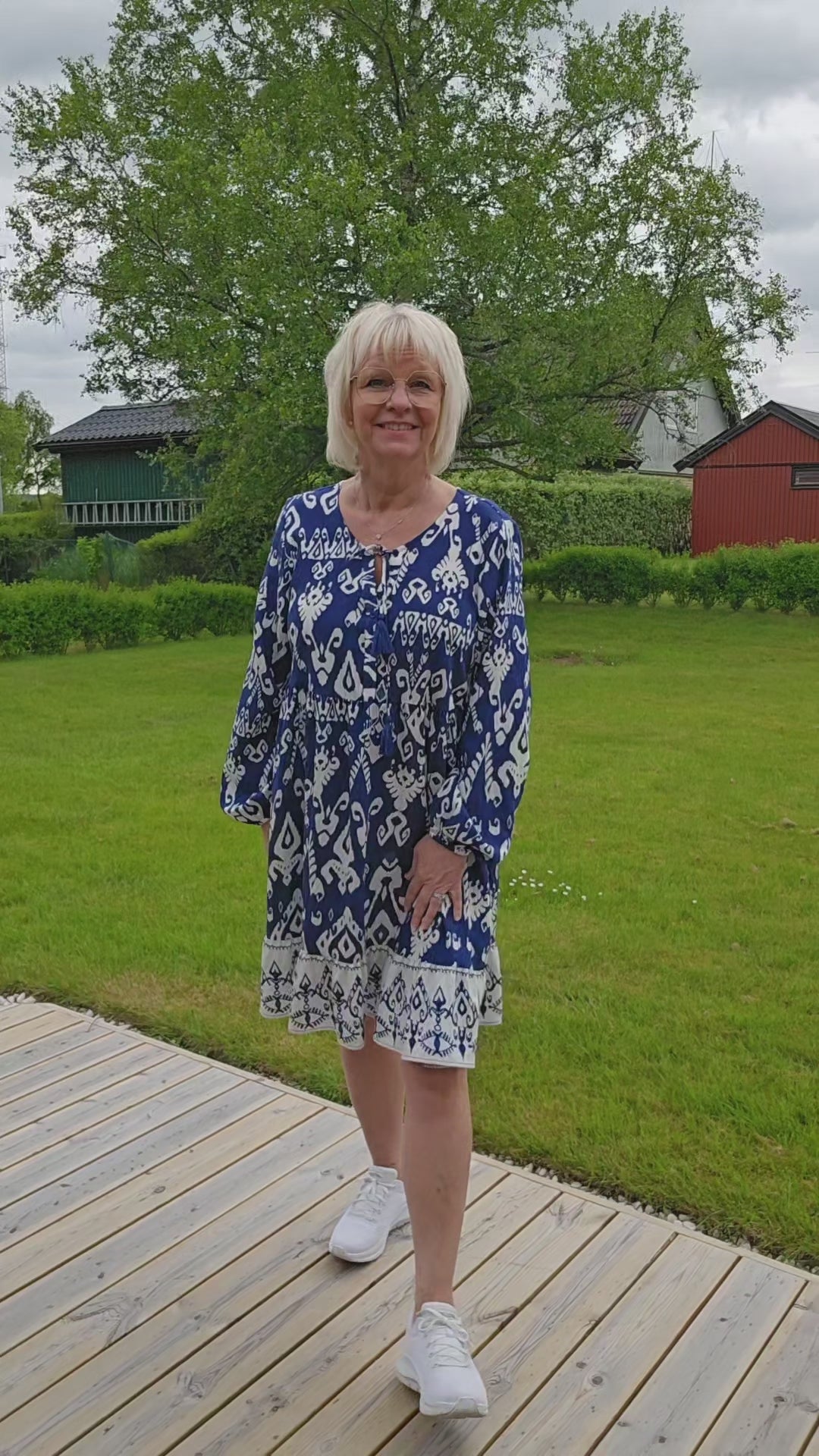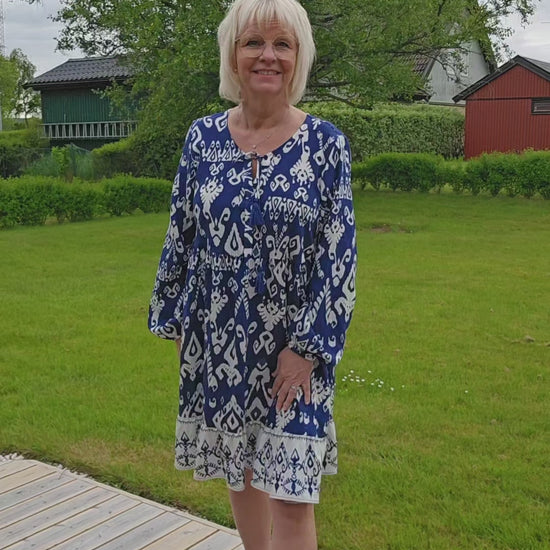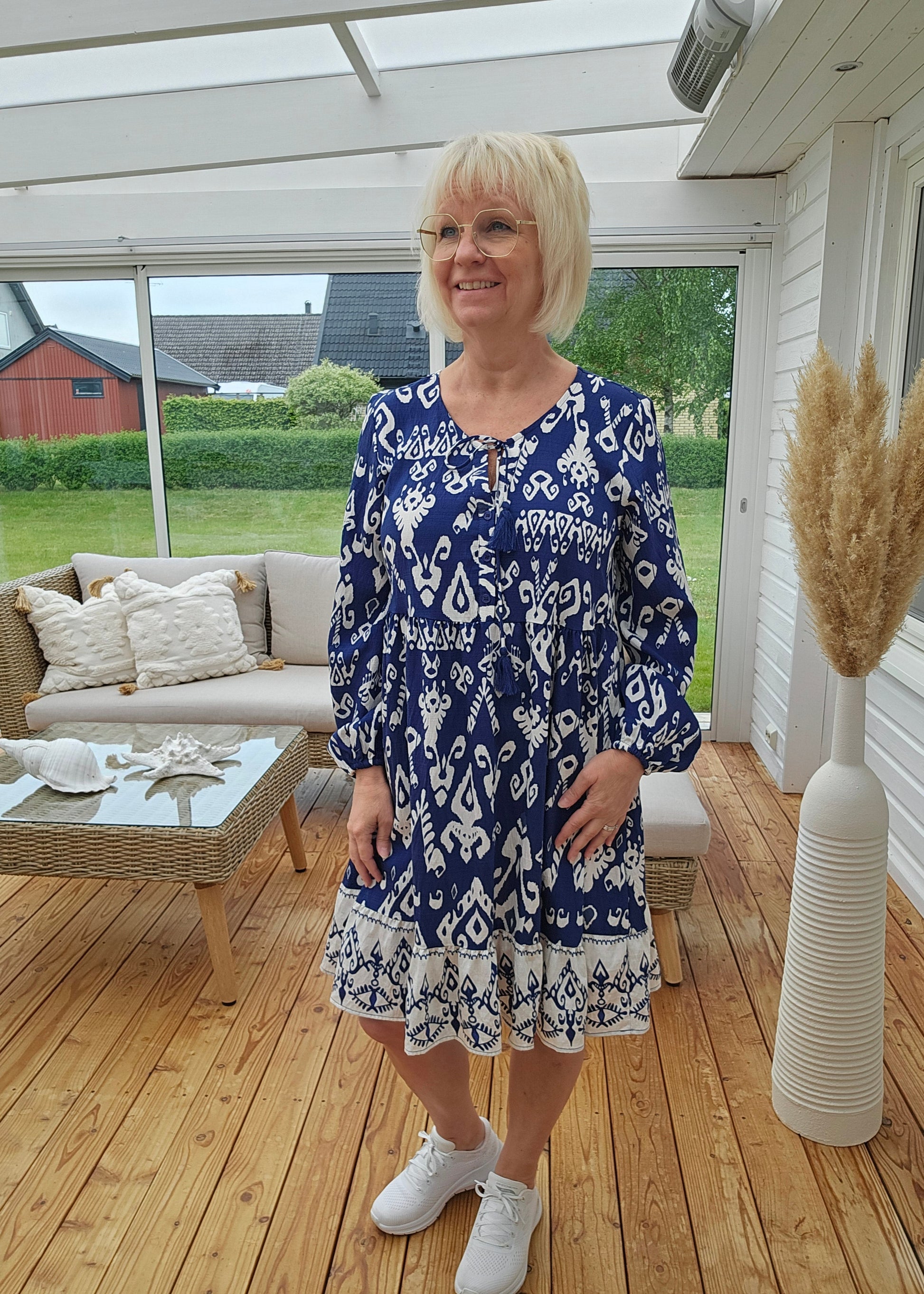 Produktbeskrivning: Mönstrad blå och vit färgad viskosklänning. Långärmad med resår i ärmslut. Rund hals och tre knappar fram och snören med tofsar. Klänningen är rymlig och har fin volang nertill. Knälång. Fin i sin kvalité
