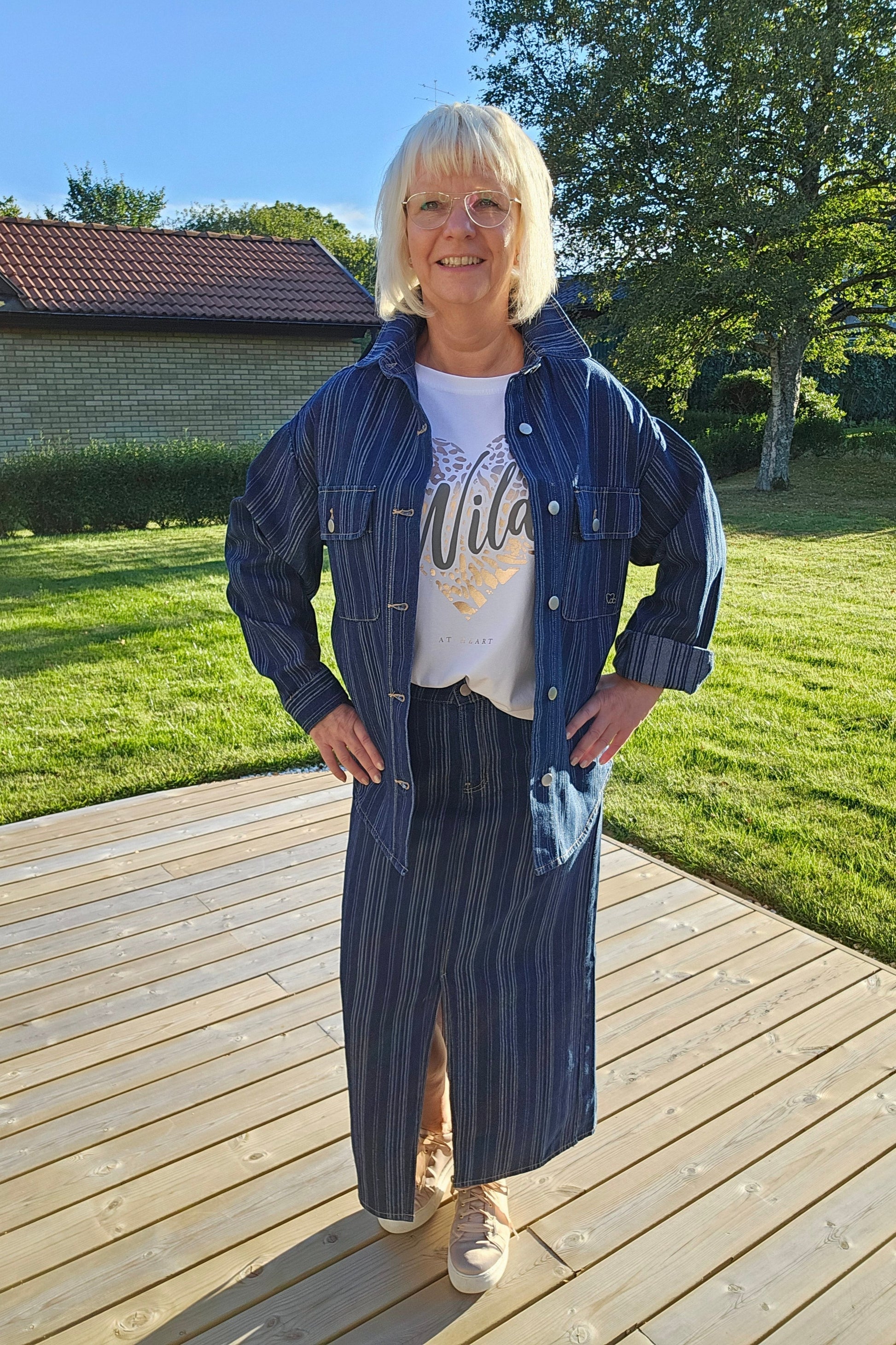Tips: Till hösten jättesnyggt med T-shirten som vi har här på bild med tryck "Wild" tillsammans med kjol i samma tyg som skjortjackan och ett par sneakers. Kjolen har fickor fram och bak. Slits fram och bak. När det blir lite kallare så kan du lätt ha en tjockare polotröja under skjortjackan, grova strumpbyxor under Alicia kjolen och ett par grövre kängor. Sätt till en grov halsduk och du kan använda den ute även om det blir lite kallare väder. Matcha med vår Alva väska i beige eller brunt om du vill ha en lite större väska eller vår bruna väska Wilma, vilket blir pricken över i:et.