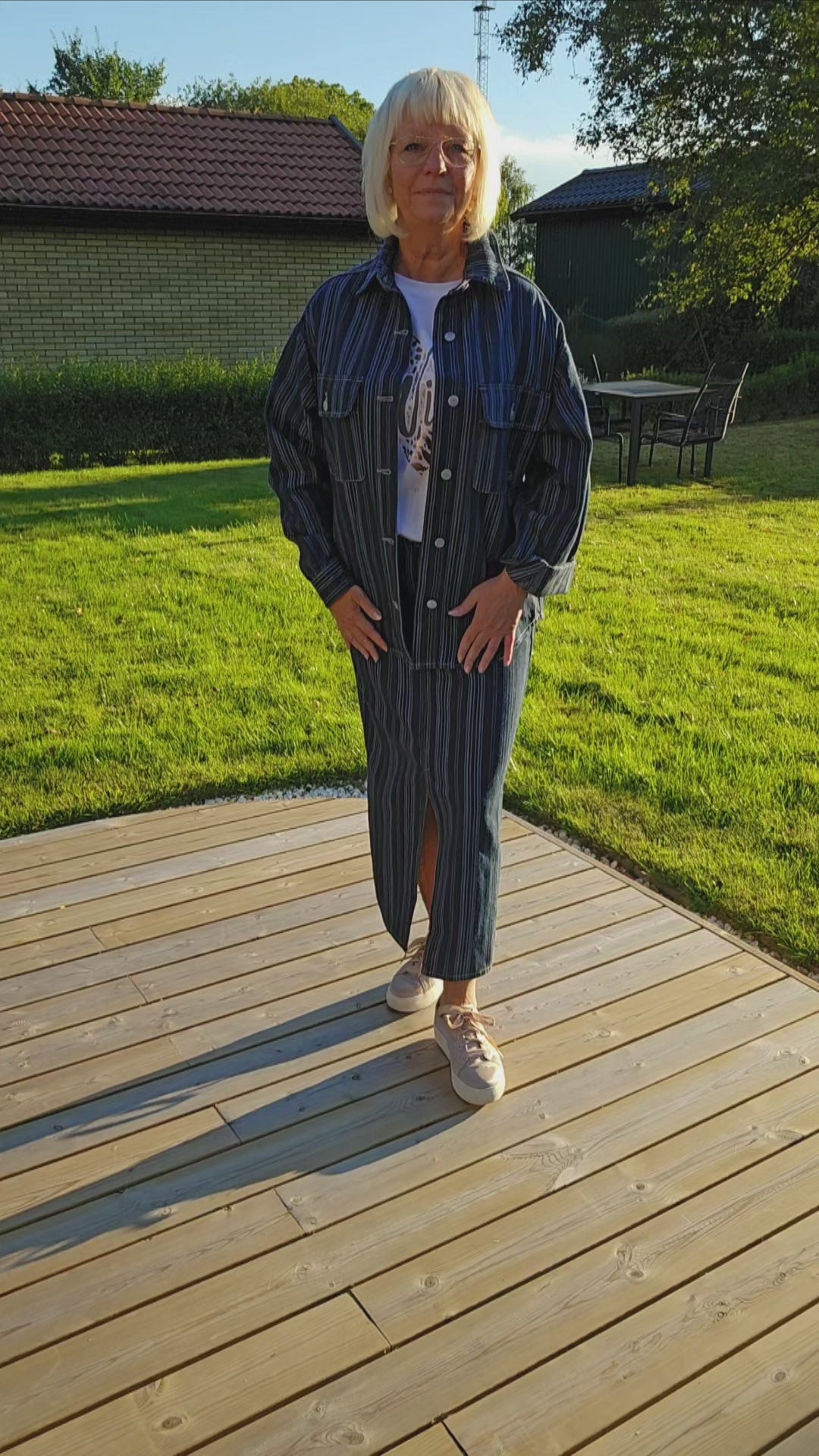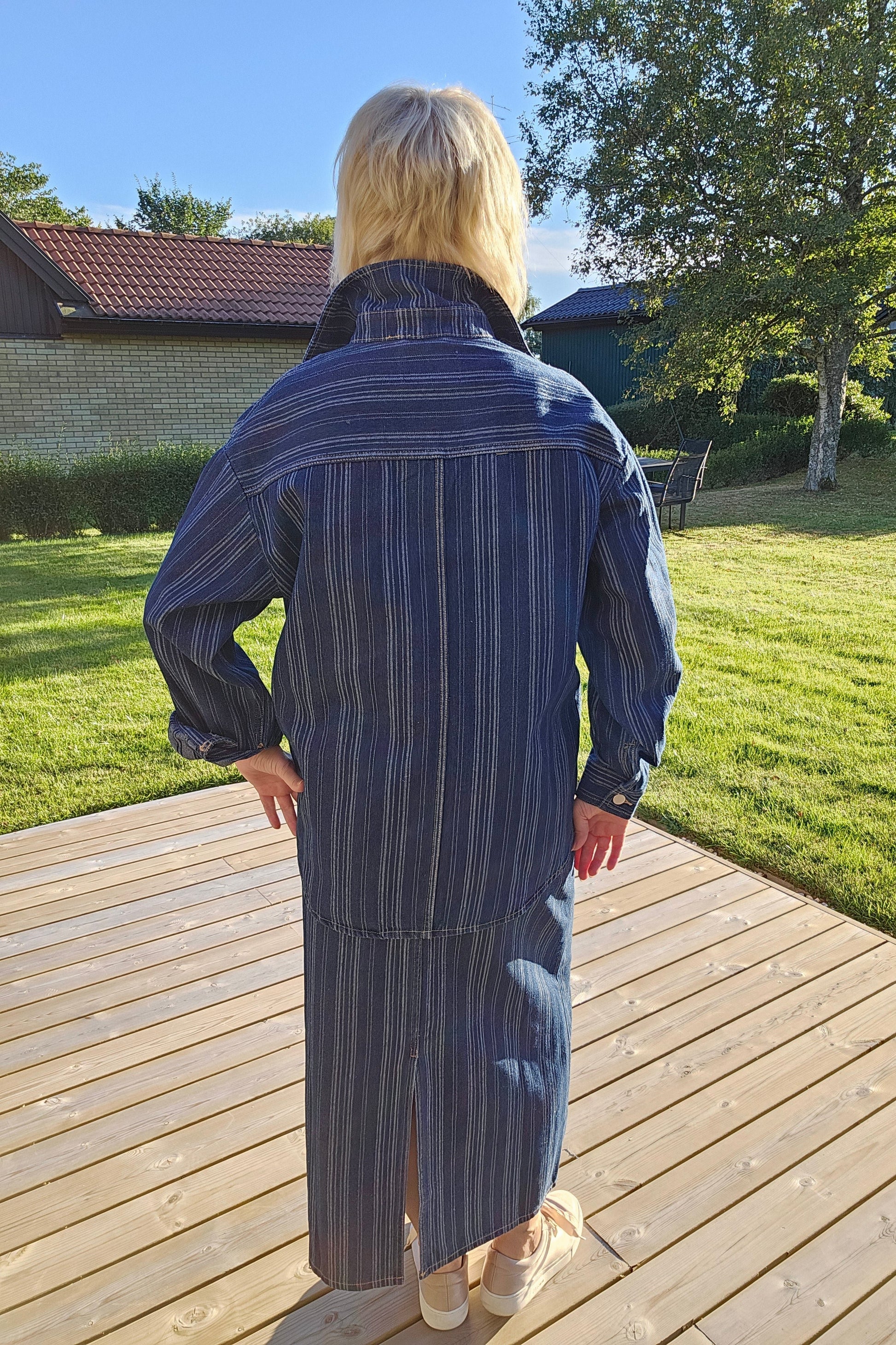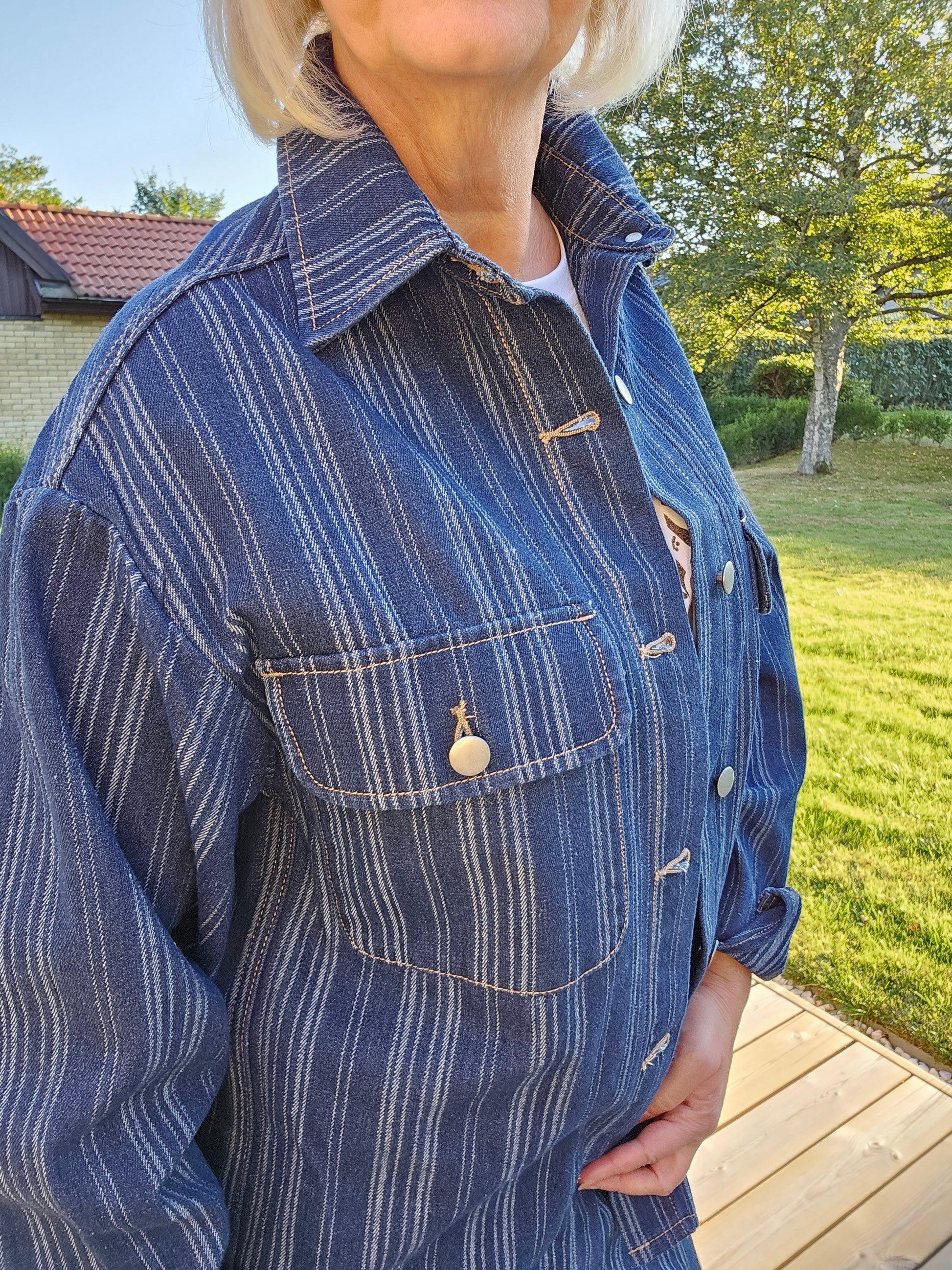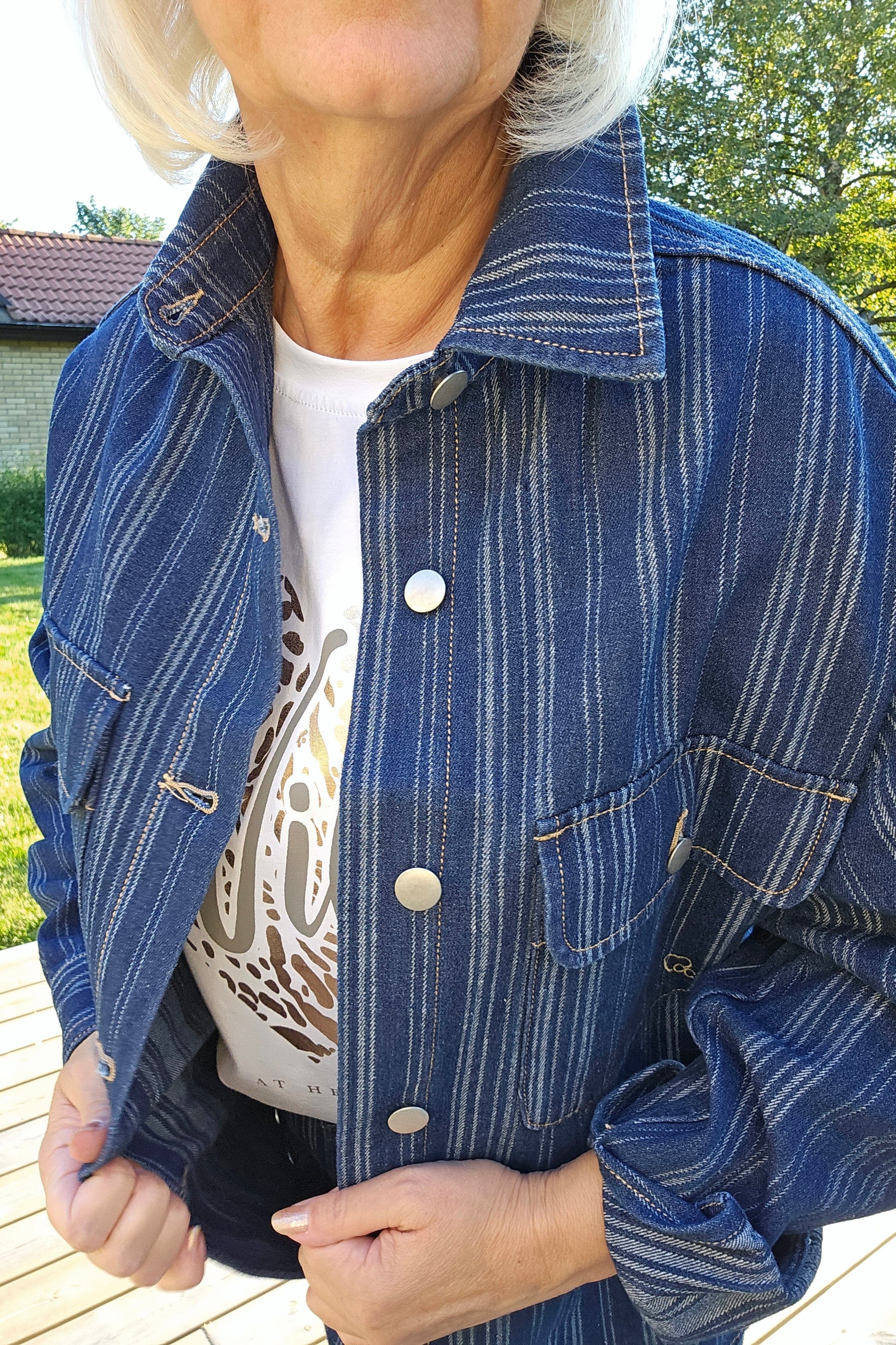 Produktbeskrivning: Lätt randig jeansblå skjortjacka med klassisk krage och metallknappar i hel knapprad. Två bröstfickor med metallknappar. Ärm slut med manschett och metallknapp. Mycket bra kvalite