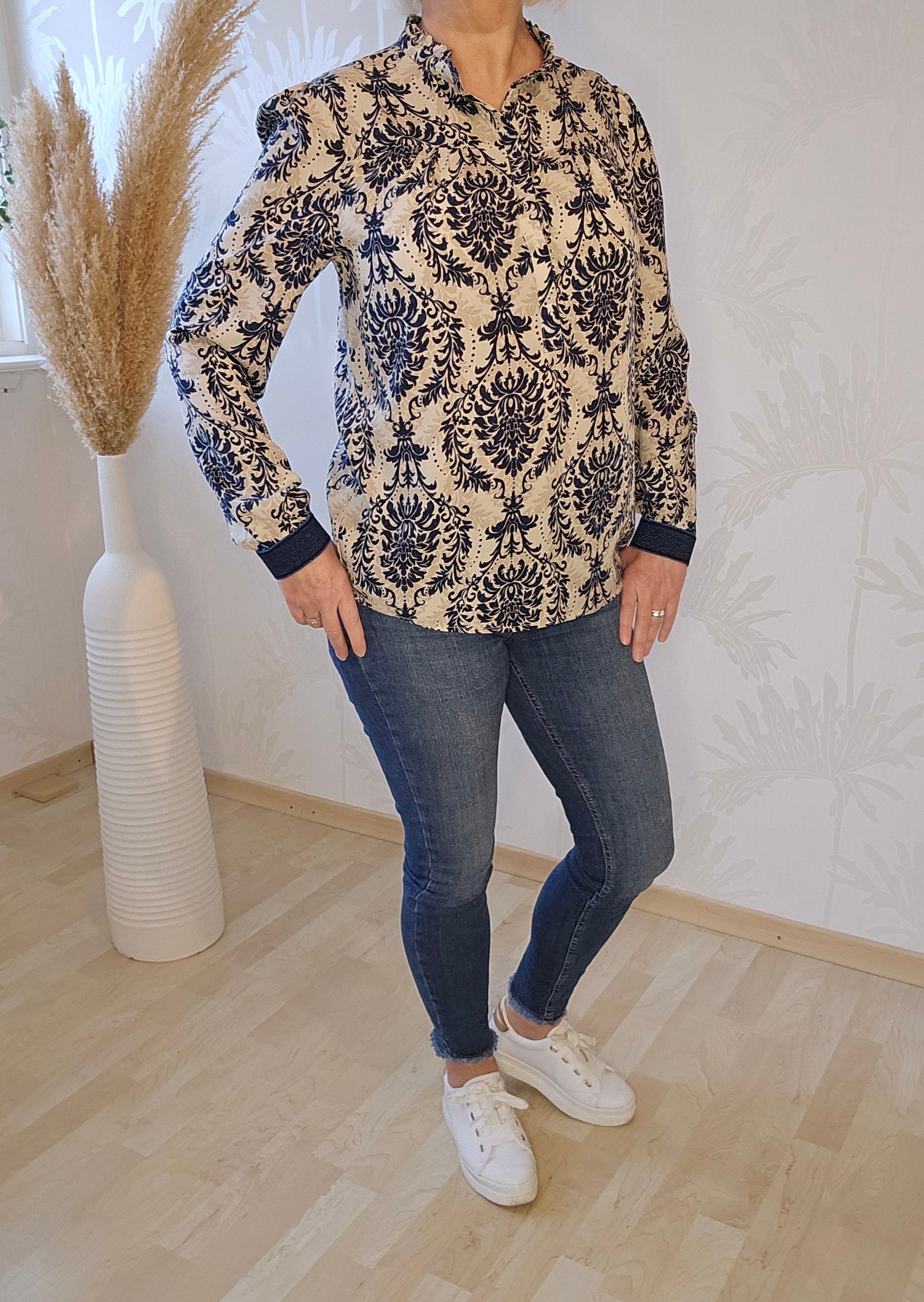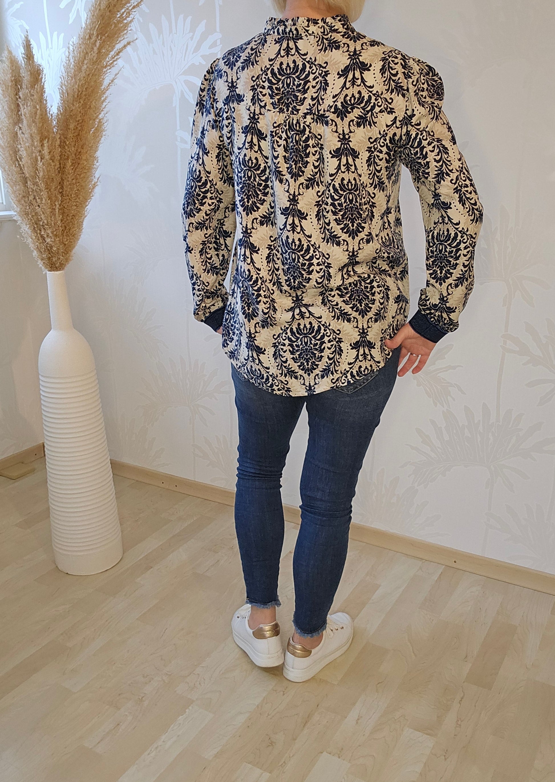Produktbeskrivning: Beige blus med blått mönster. Liten volang i kragen. En dold knapprad en bit ner på bröstet. På axeln lite rynkat i ärmen. En söm som är lite, lite rynkad fram ovanför bröstet. I ärm slutet ett snyggt mjukt brett löst sittande blått glitter resårband. Blusen ser lyxig ut.