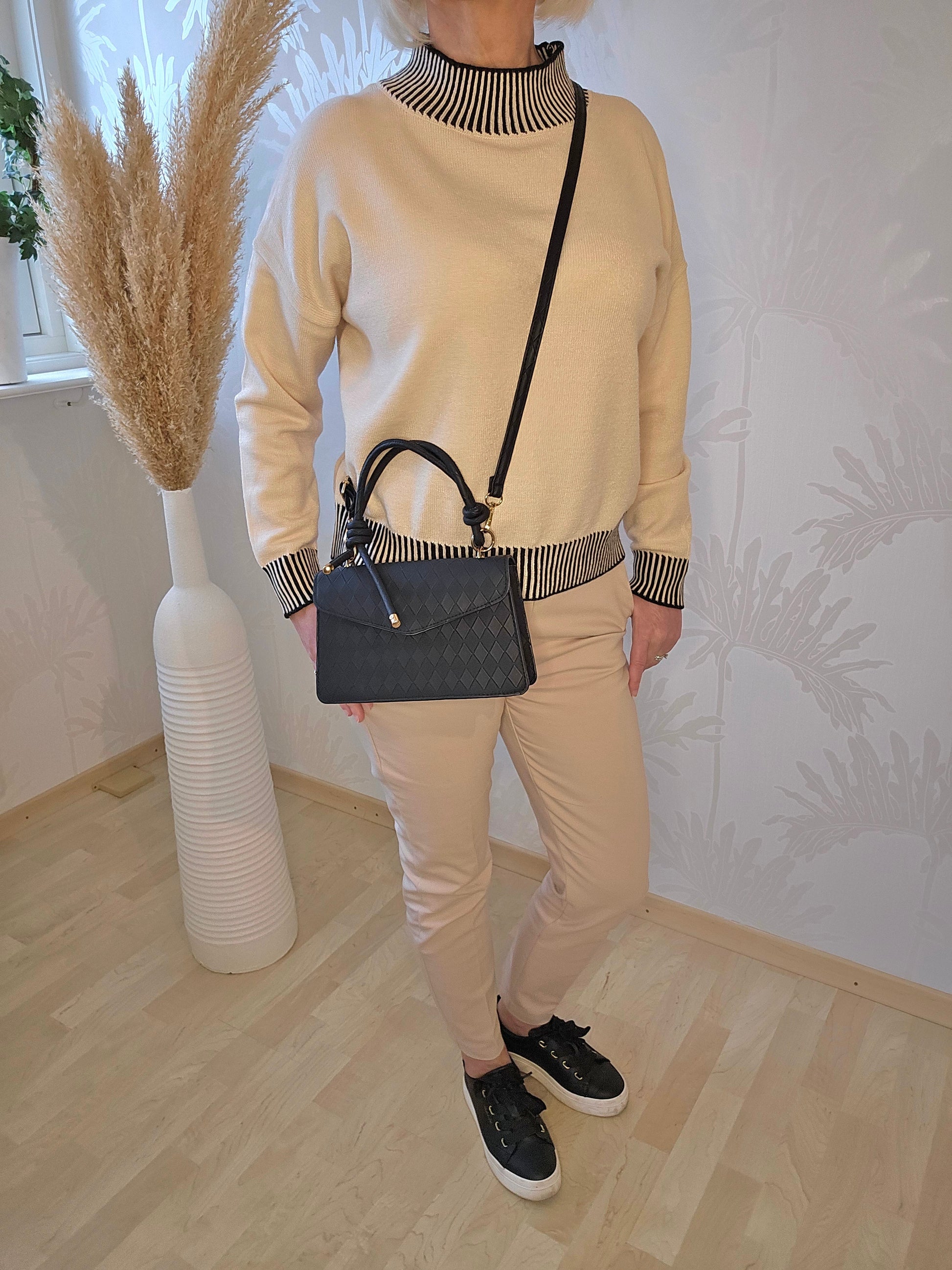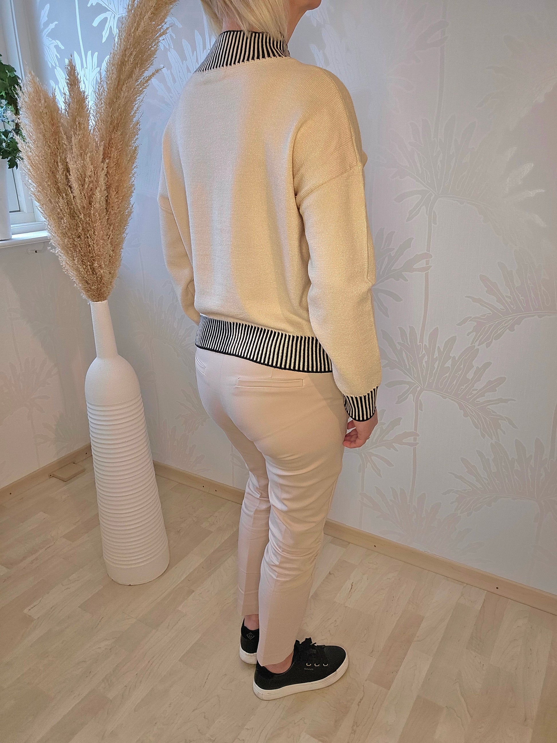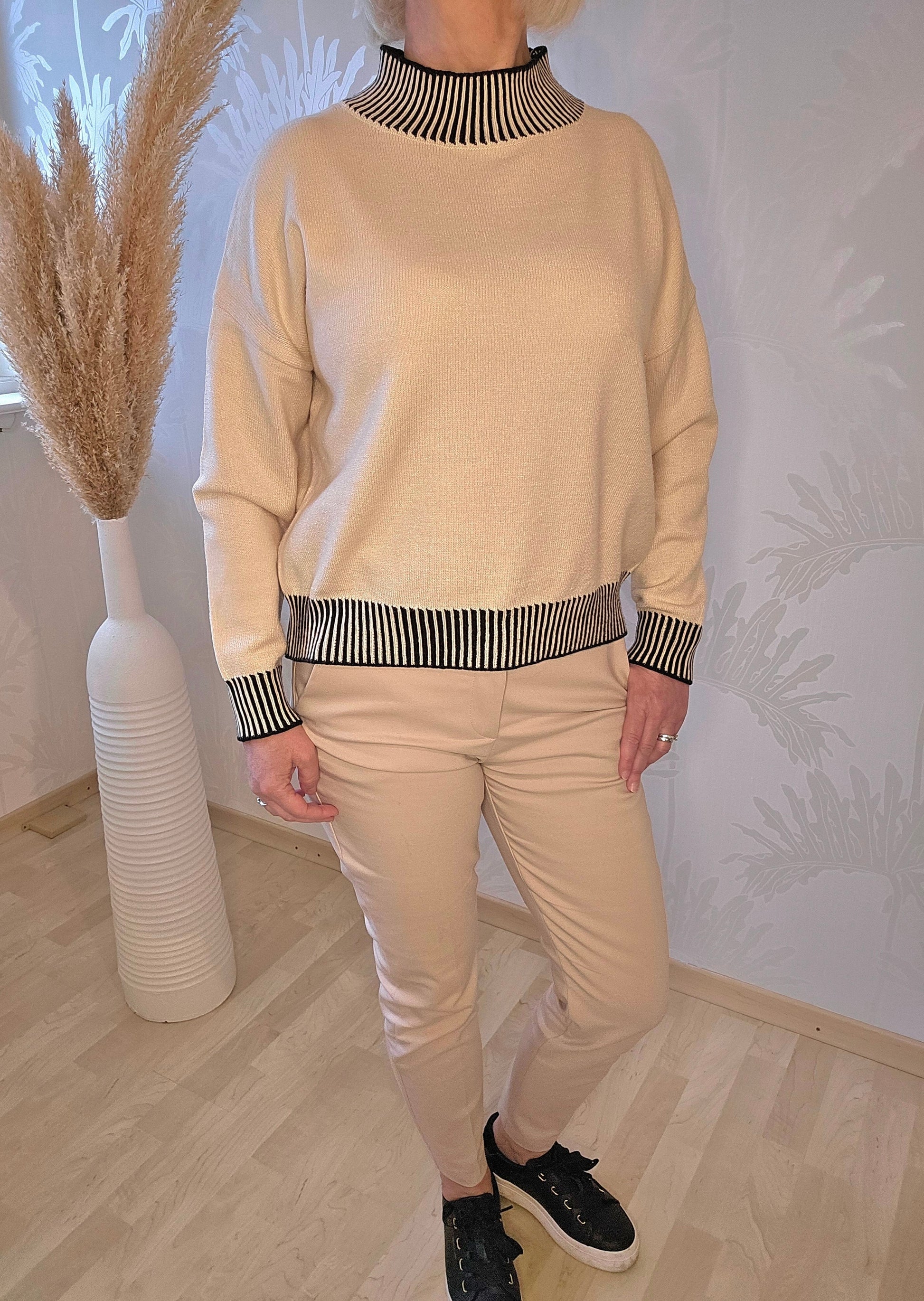 Produktbeskrivning: En mjuk beige tröja med liten polokrage som sitter löst och skönt i halsen. Du ser de snyggt små svarta ränderna i halsringning, midja och i ärm slutet. Fint stickad, väldigt fin kvalité i tröjan och känns lyxig att ha på sig.
