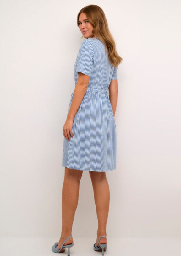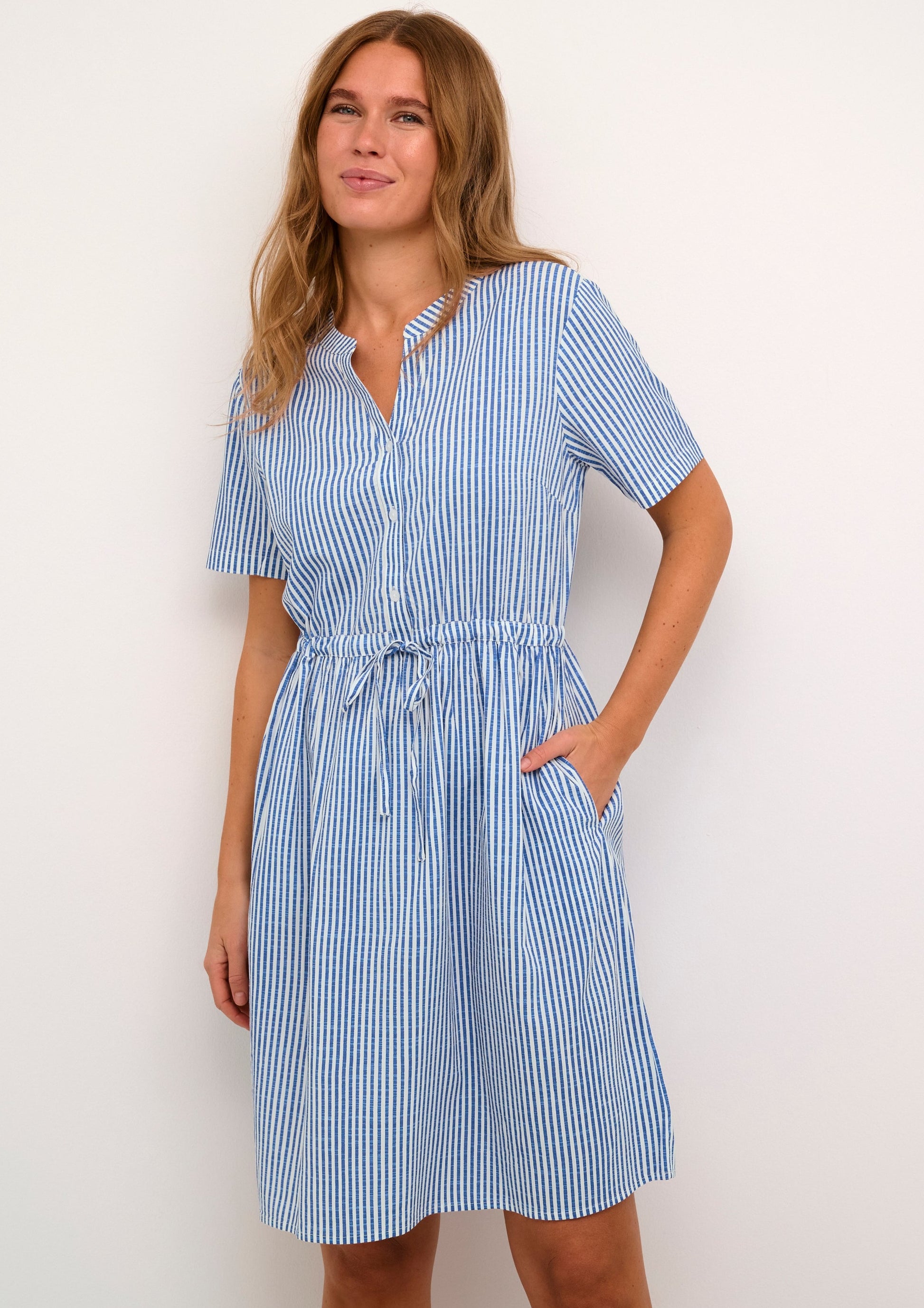 Produktbeskrivning: En kortärmad randig klänning i blått och vitt i havets tema. Klänningen har en ståkrage med knäppning fram ner till midjan med vita knappar. Snöre i midjan (snöret går att ta bort). Fickor på båda sidorna. Knälång. Kvaliteten är vävd och materialet gör den mjuk och behaglig att bära.