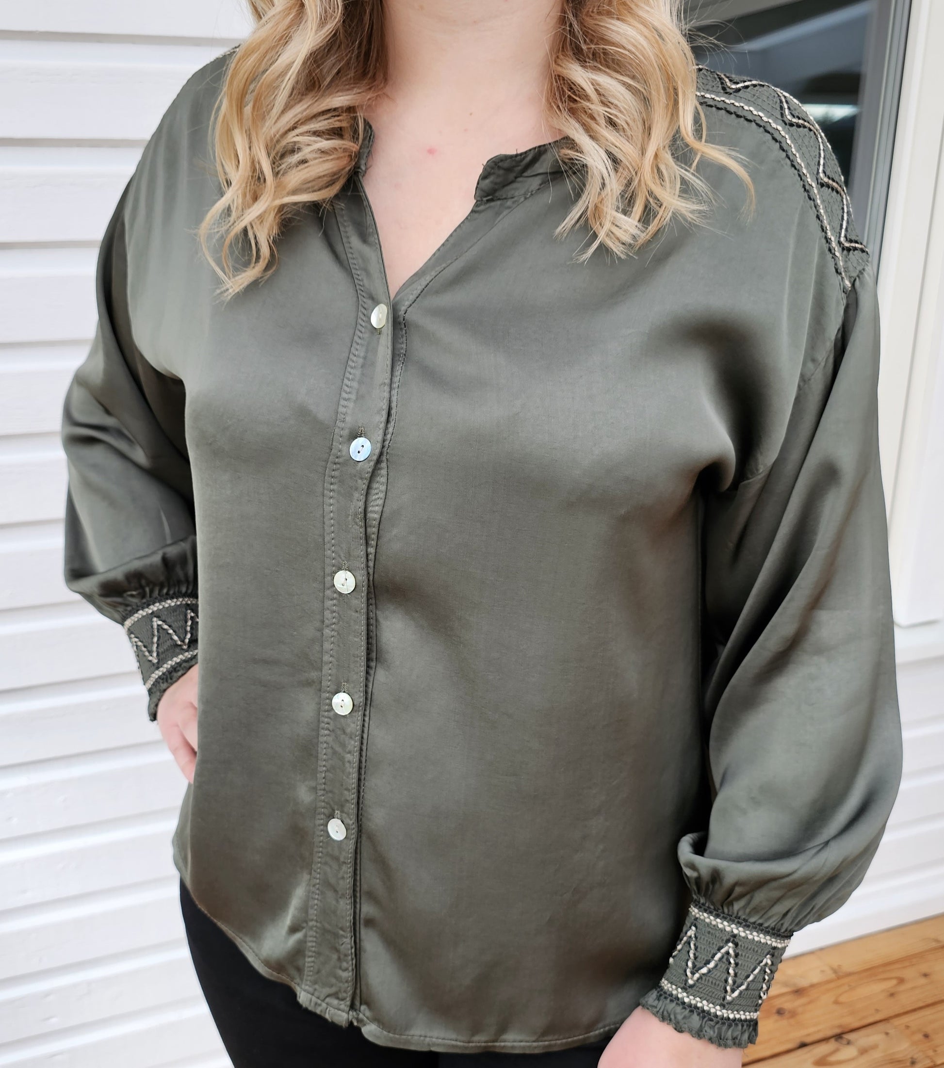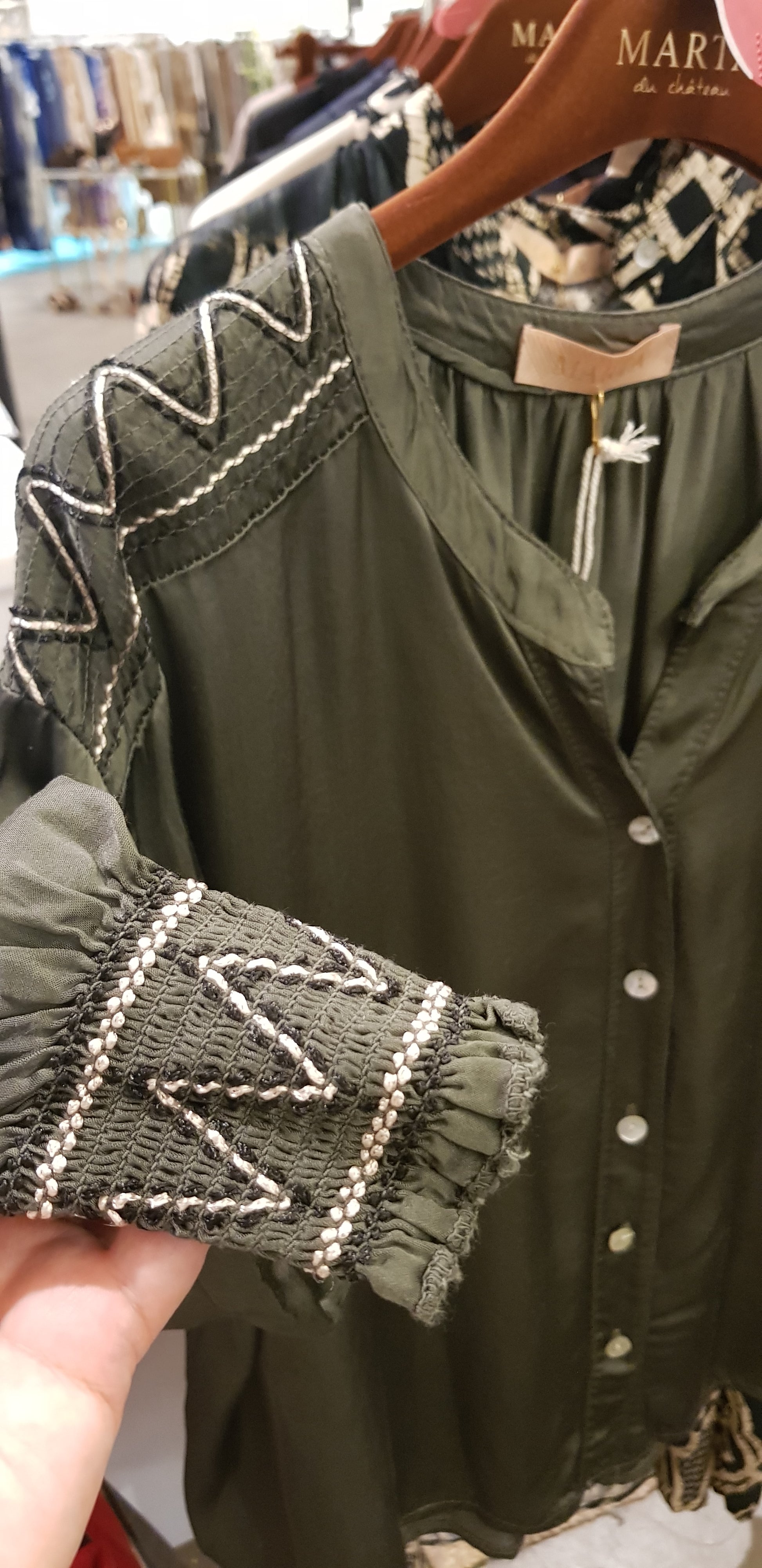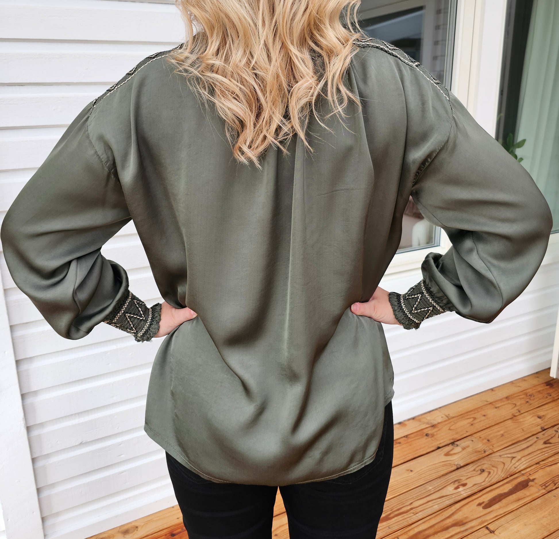Produktbeskrivning: Militärgrön blus med brodyr på axlar och i ärmslut. Brodyren går i färgerna svart och offwhite/beige. Ståkrage. Bred resår i ärmslut.