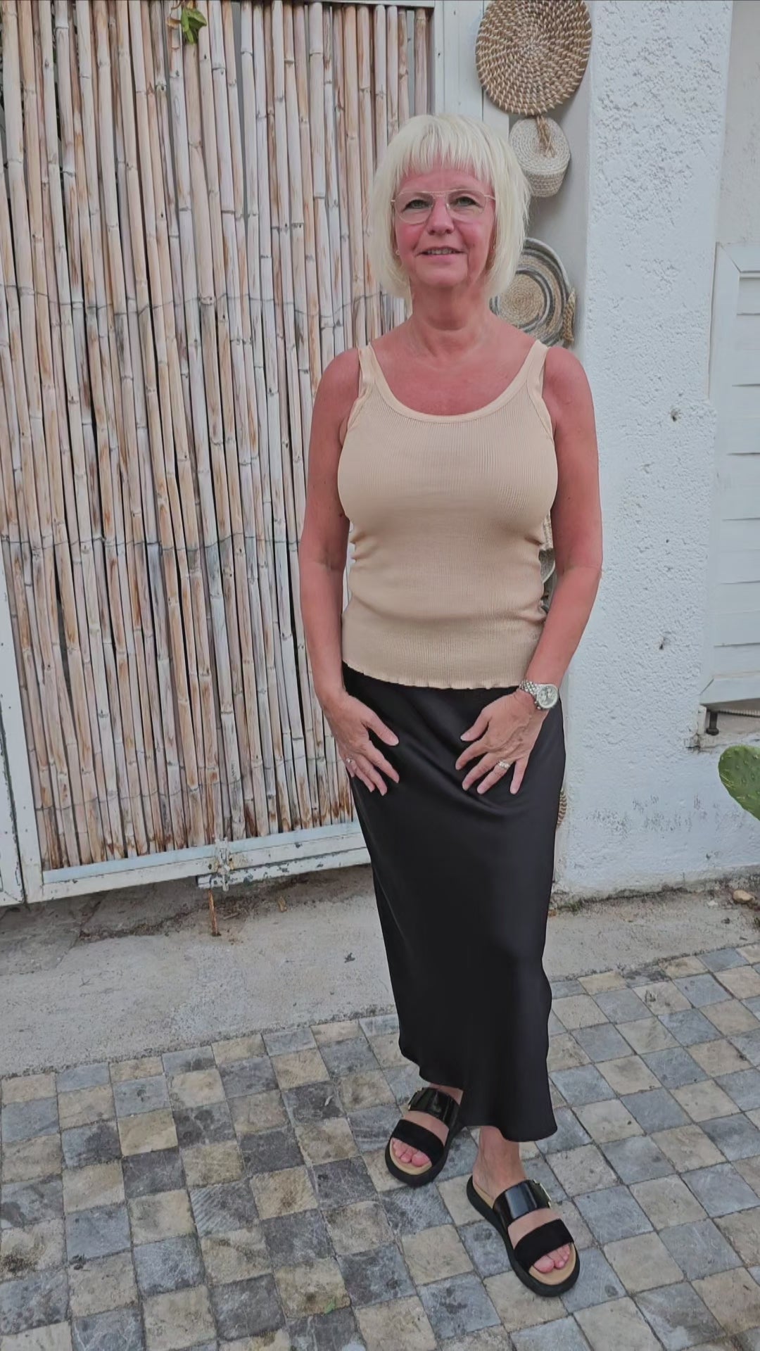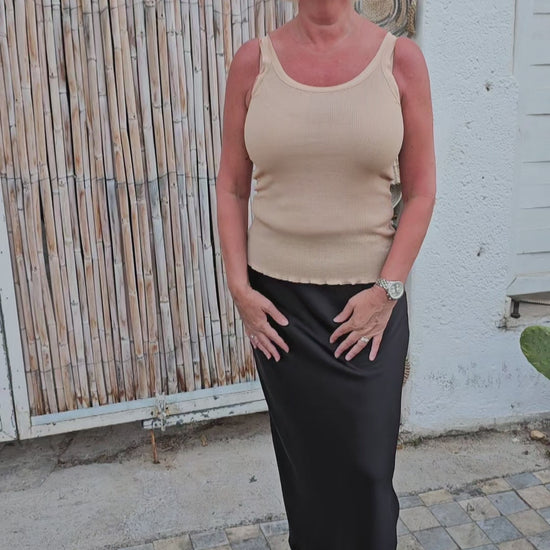Produktbeskrivning: Beigt linne. Något ribbad med en silkeskant i halsringning och axelbanden. Liten vågad kant nedtill.