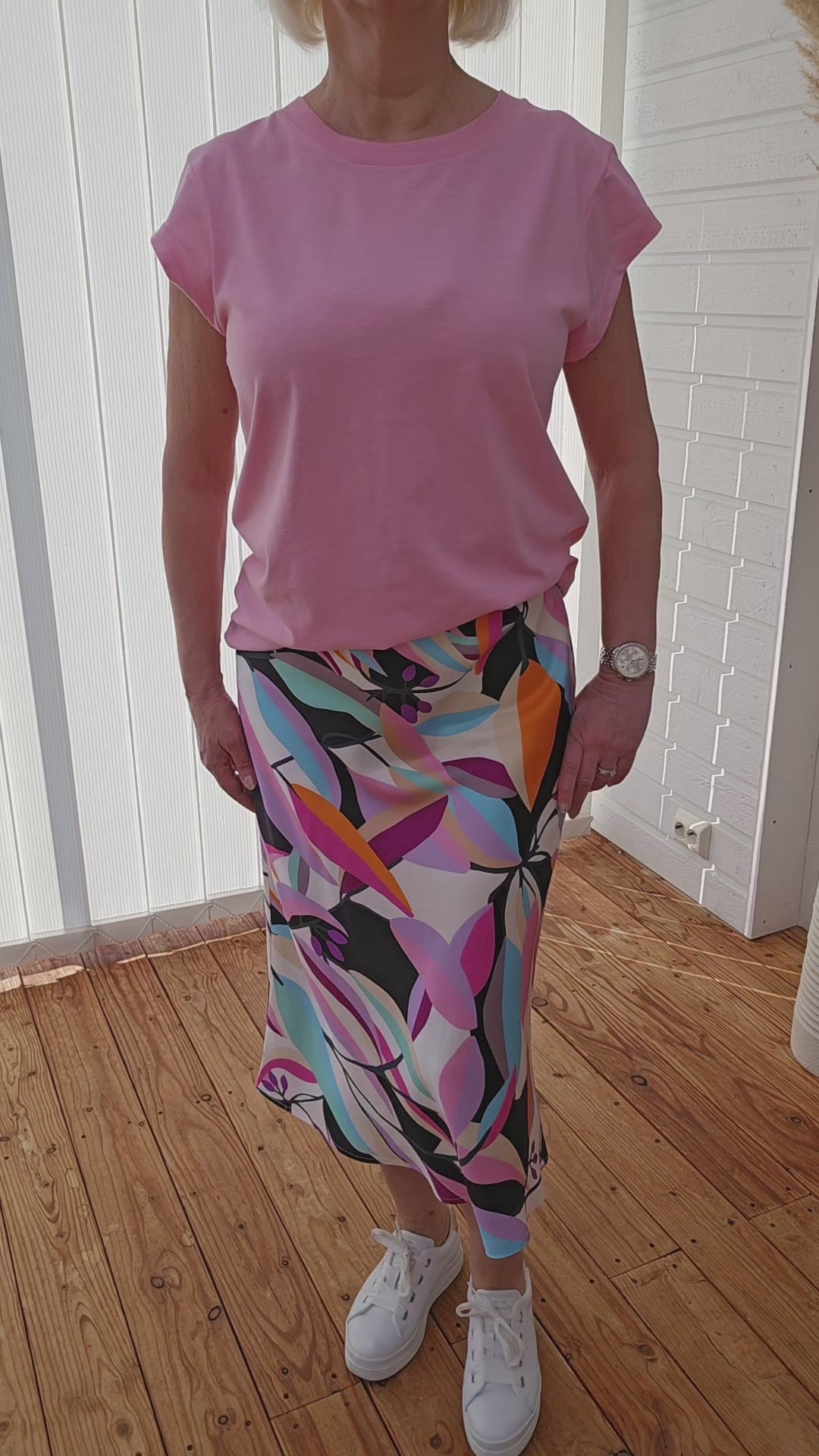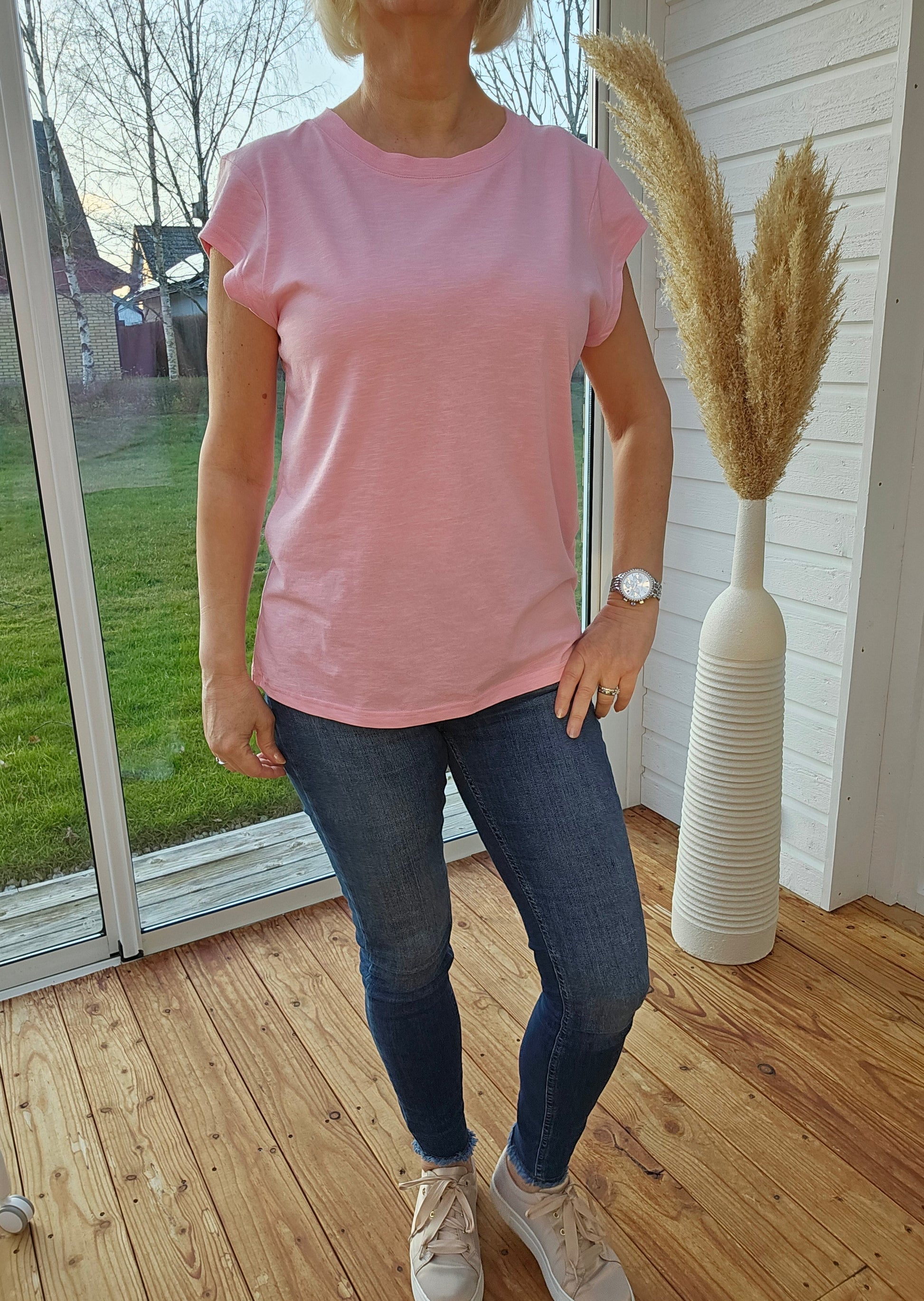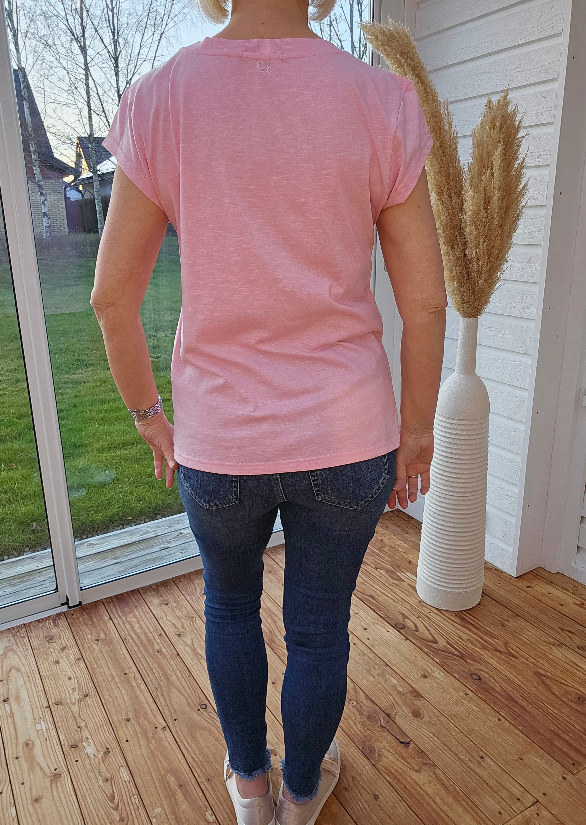 Produktbeskrivning: Härligt rosa färgad T-shirt med kortare ärm. Normal längd