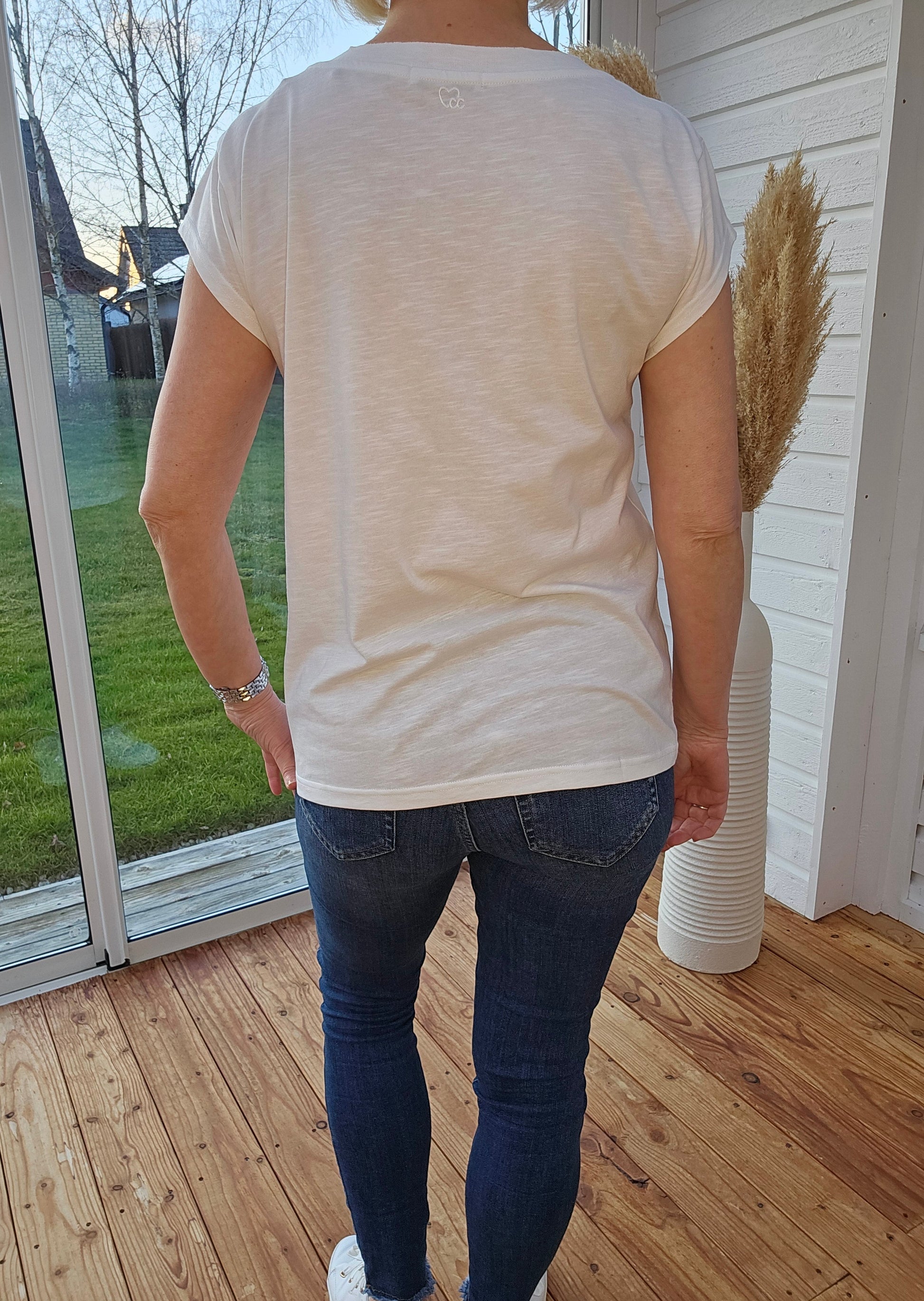 Produktbeskrivning: Vit T-shirt med kortare ärm. Normal längd