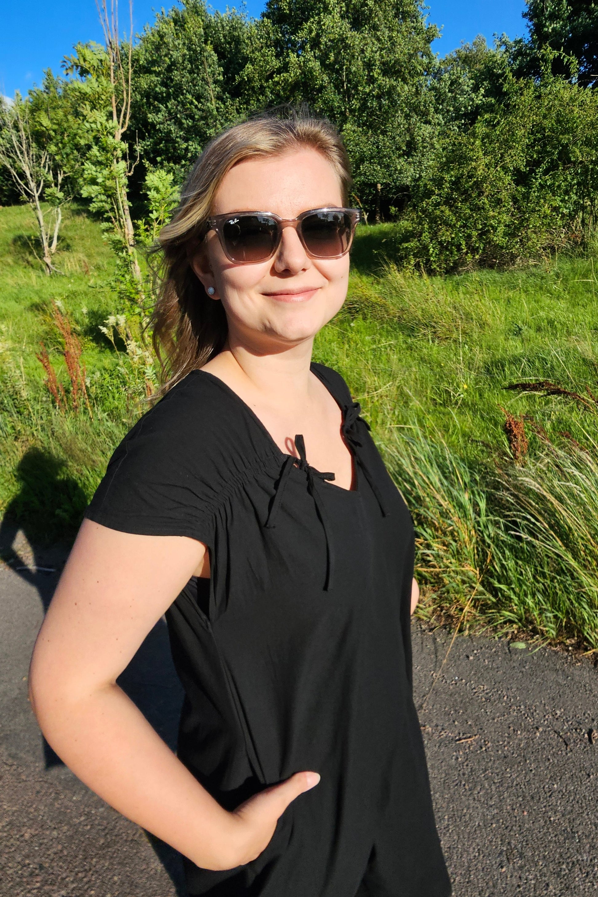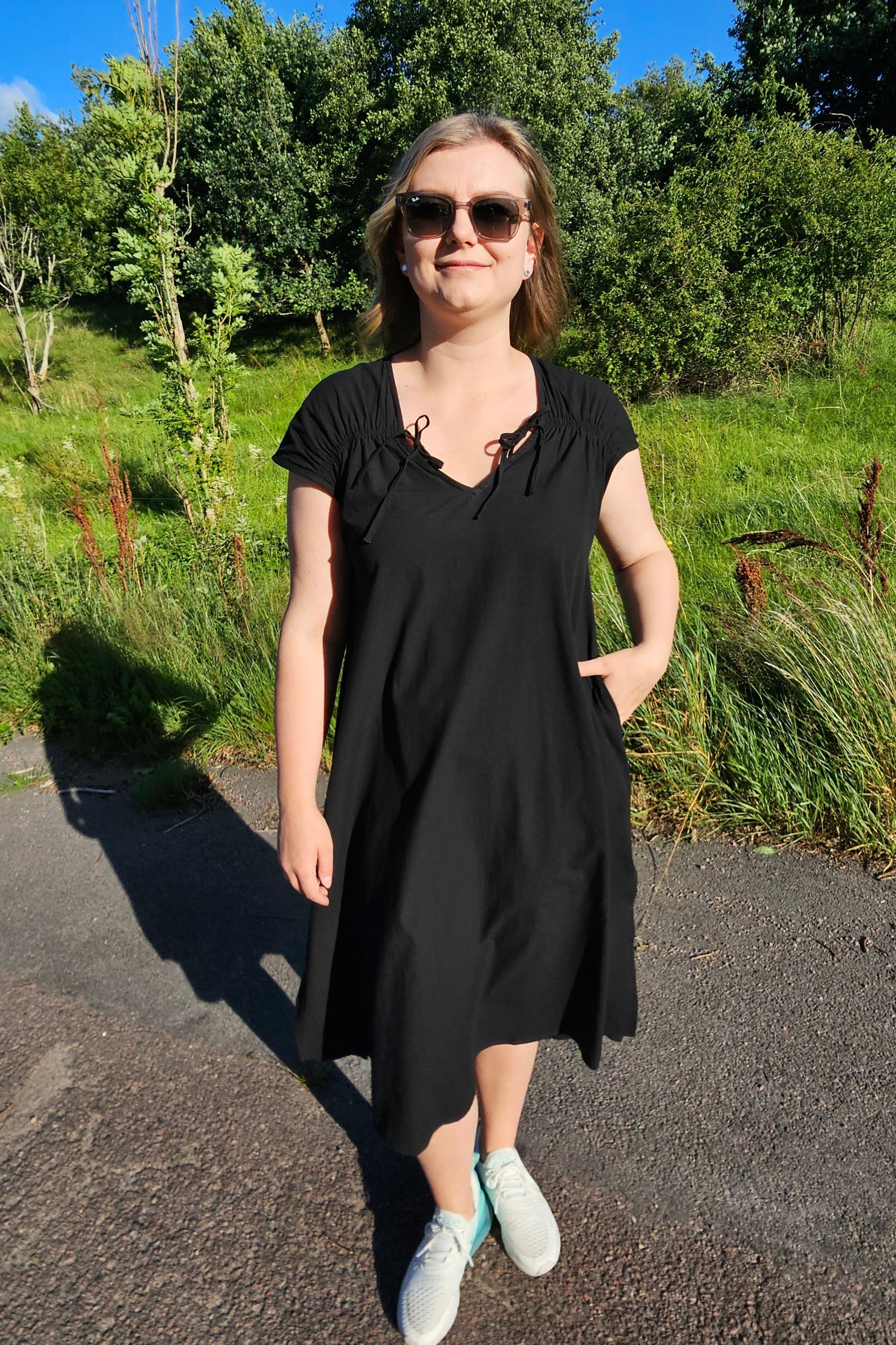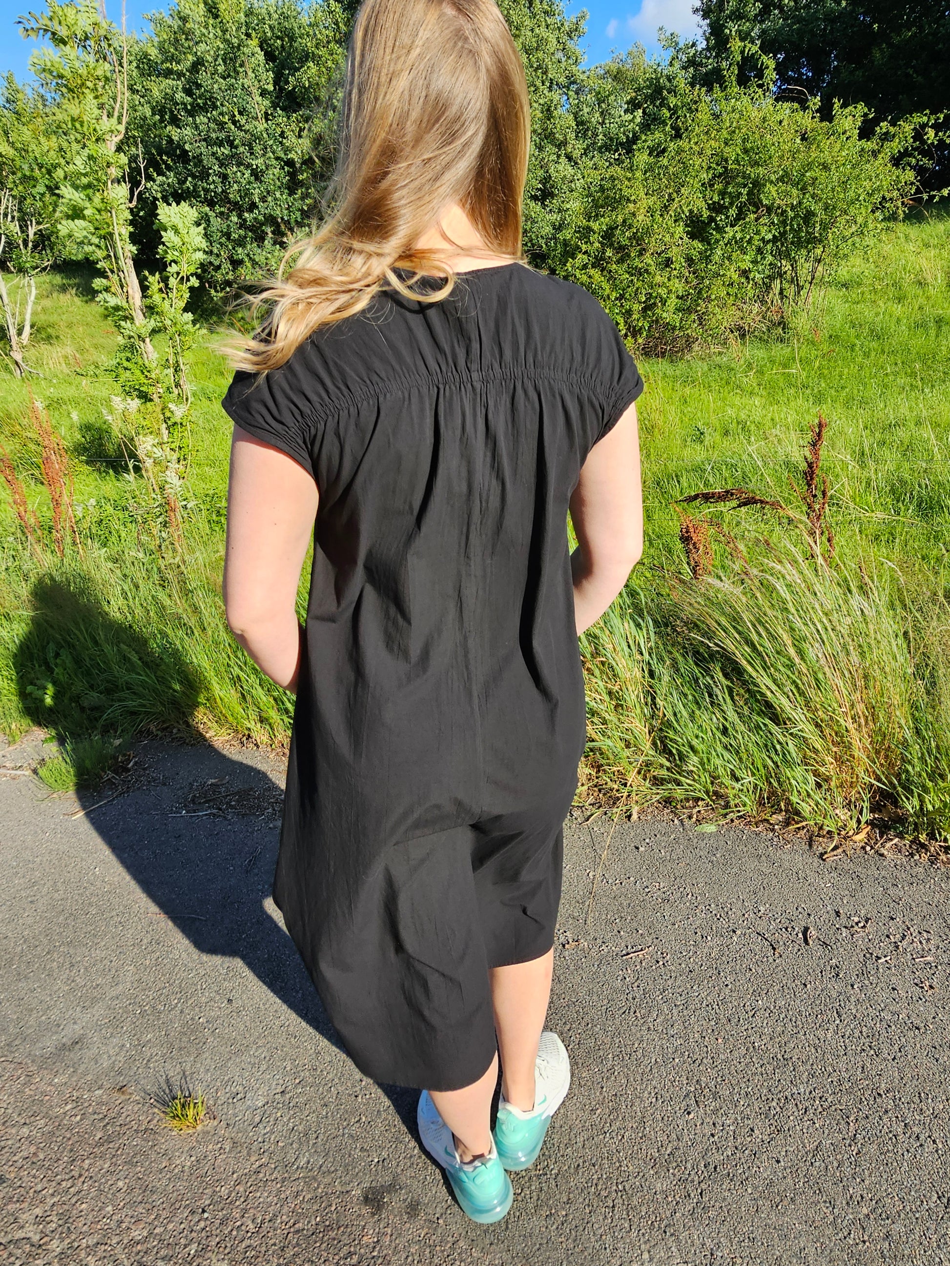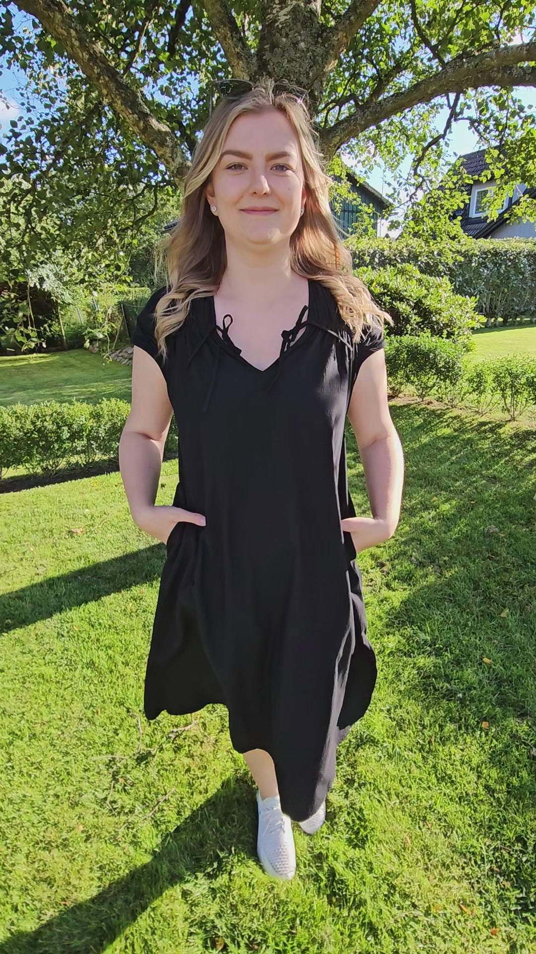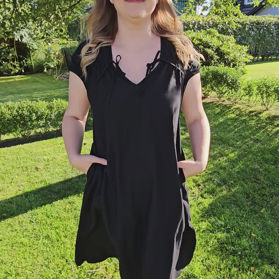 Produktbeskrivning: Svart lite längre klänning med kort ärm och flera fina detaljer som snören fram som du kan välja att knyta på olika sätt, vid sidan som vi har gjort, rakt över eller varför inte i kors. Draperat något över skuldrorna och fram vid axlarna för en fin passform, där bysten kommer till sin rätt. Något A linje formad klänning med slits på varje sida. Fickor på båda sidor.