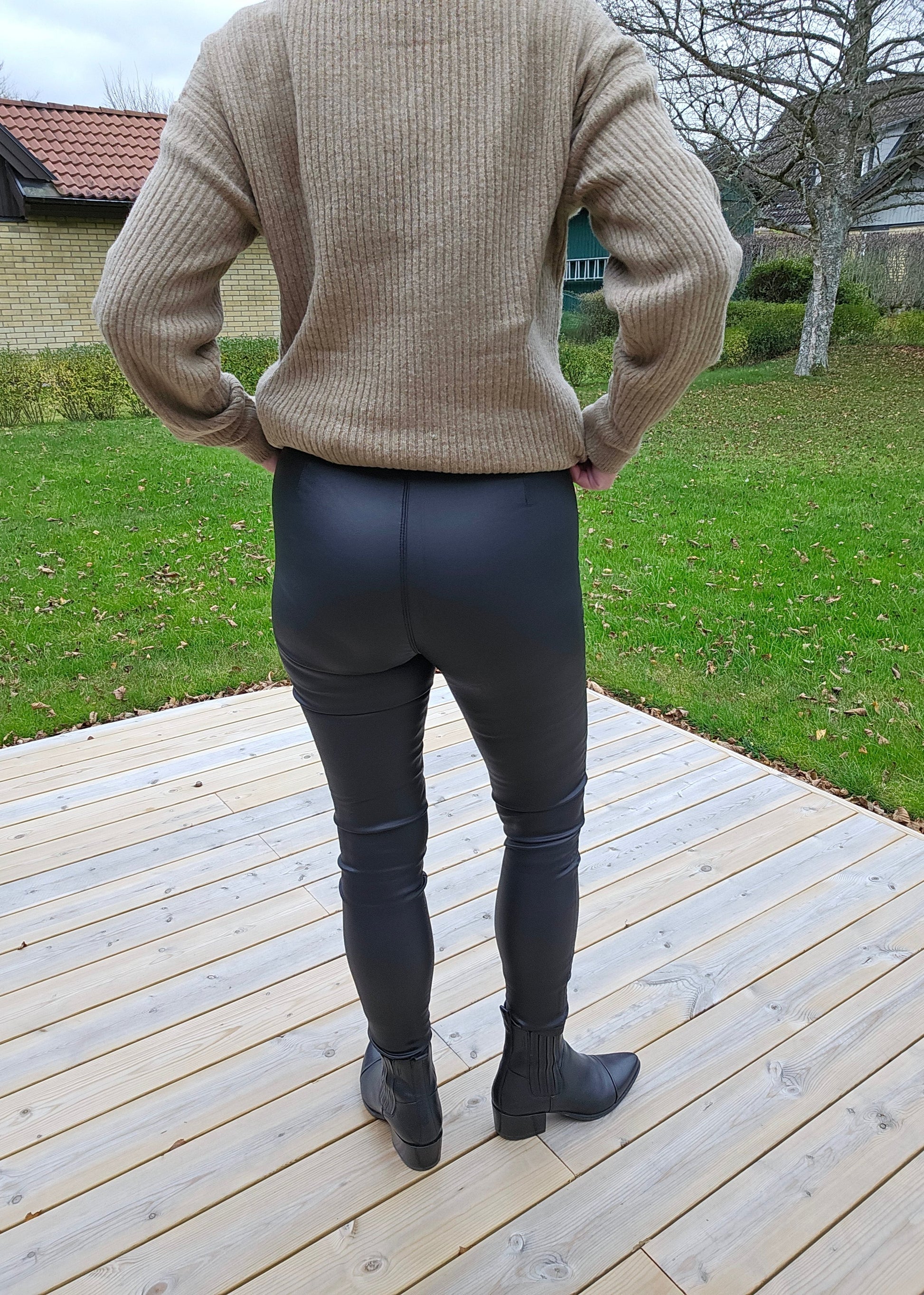 Produktbeskrivning: Leggings i skinnimitation med bred resår i en hög midja. Dekorativ söm fram på benen som gör att de får en trendigare och tuffare look. Väldigt fin i kvalitén. Inga "skinnleggings" som spricker i tyget. OBS Sömmen känns inte alls.