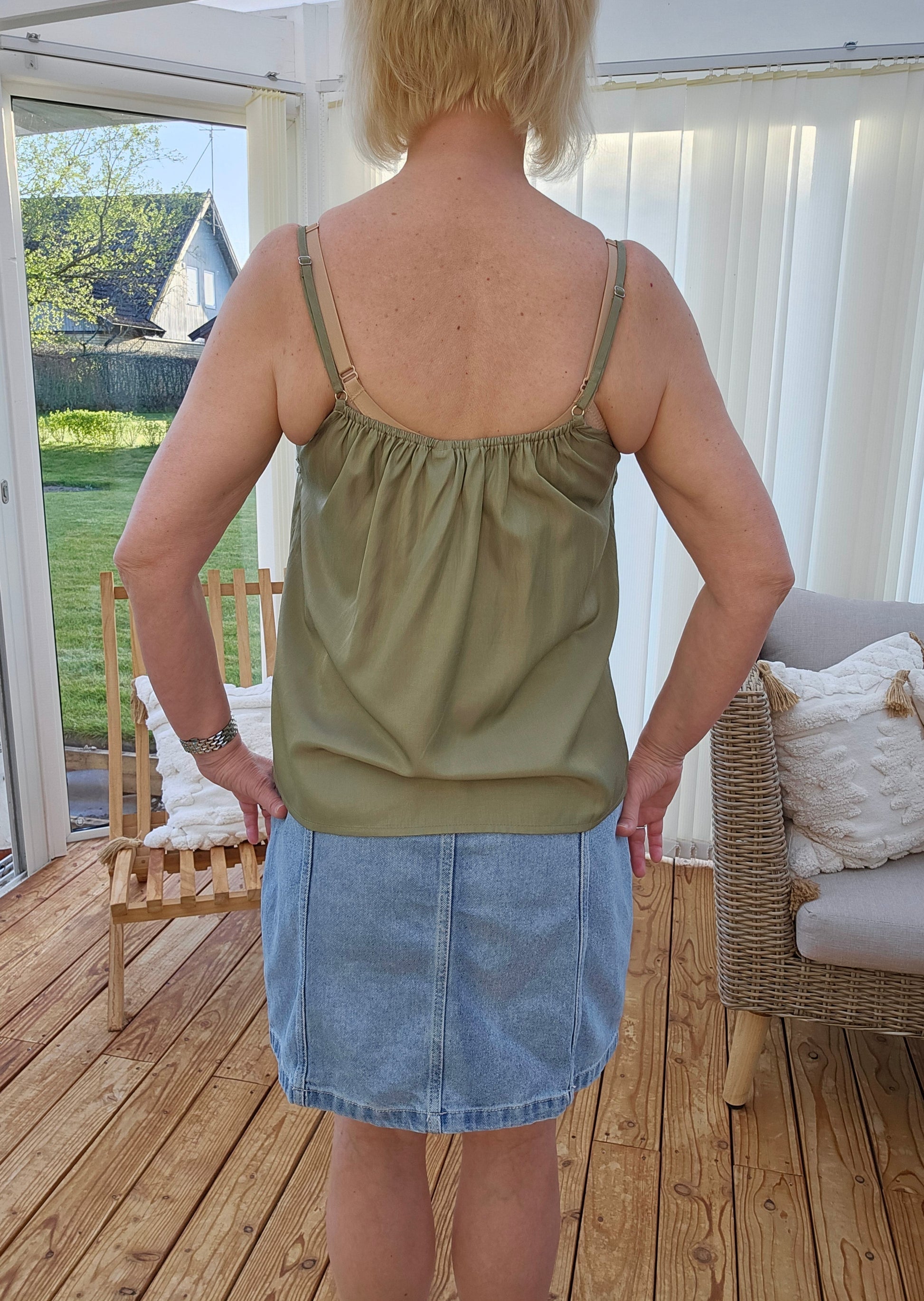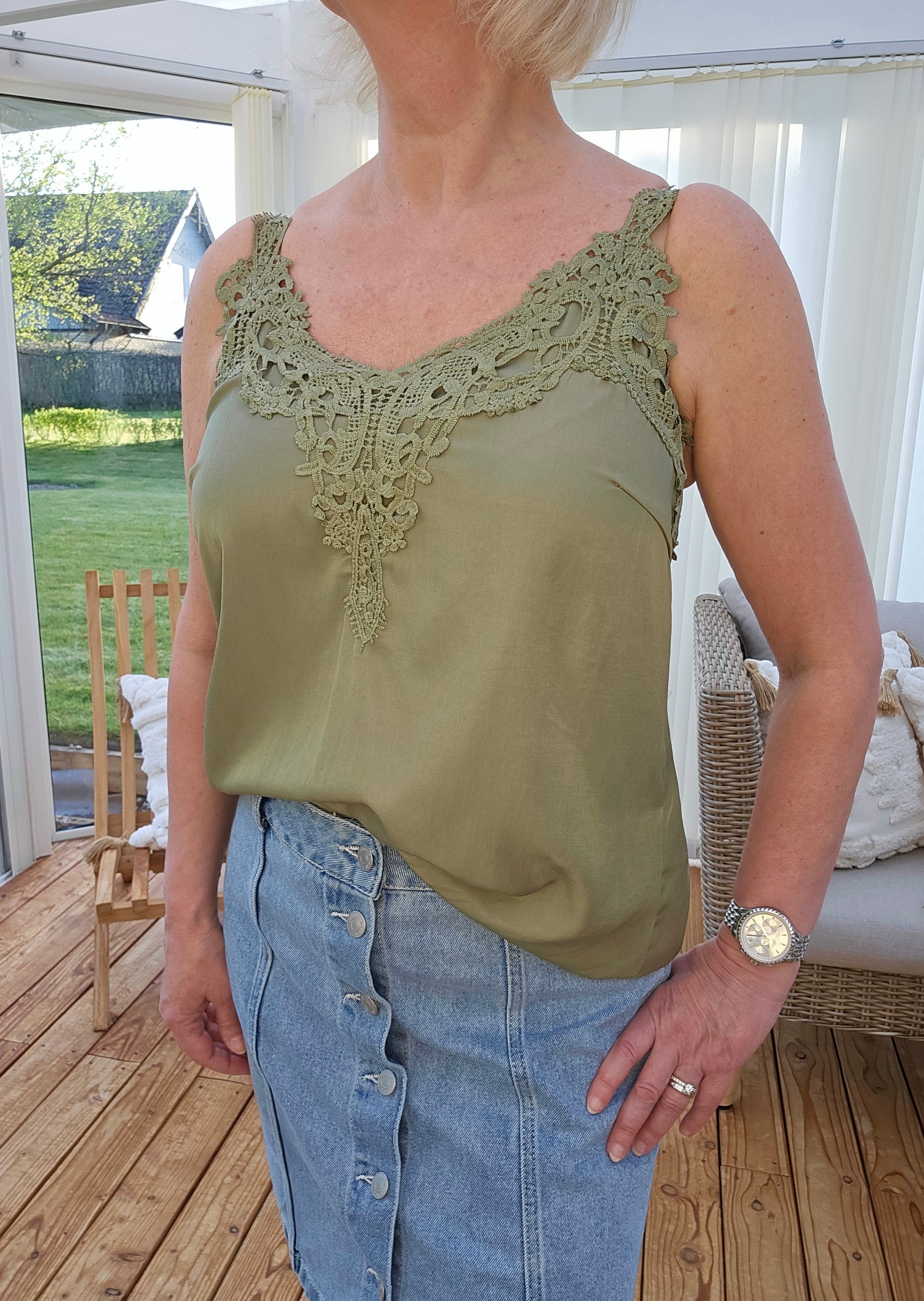 Produktbeskrivning: Ett olivgrönt löst sittande linne med bredare spets fram. Smala justerbara axelband. Spetsen täcker Bh:n fint fram och baktill.