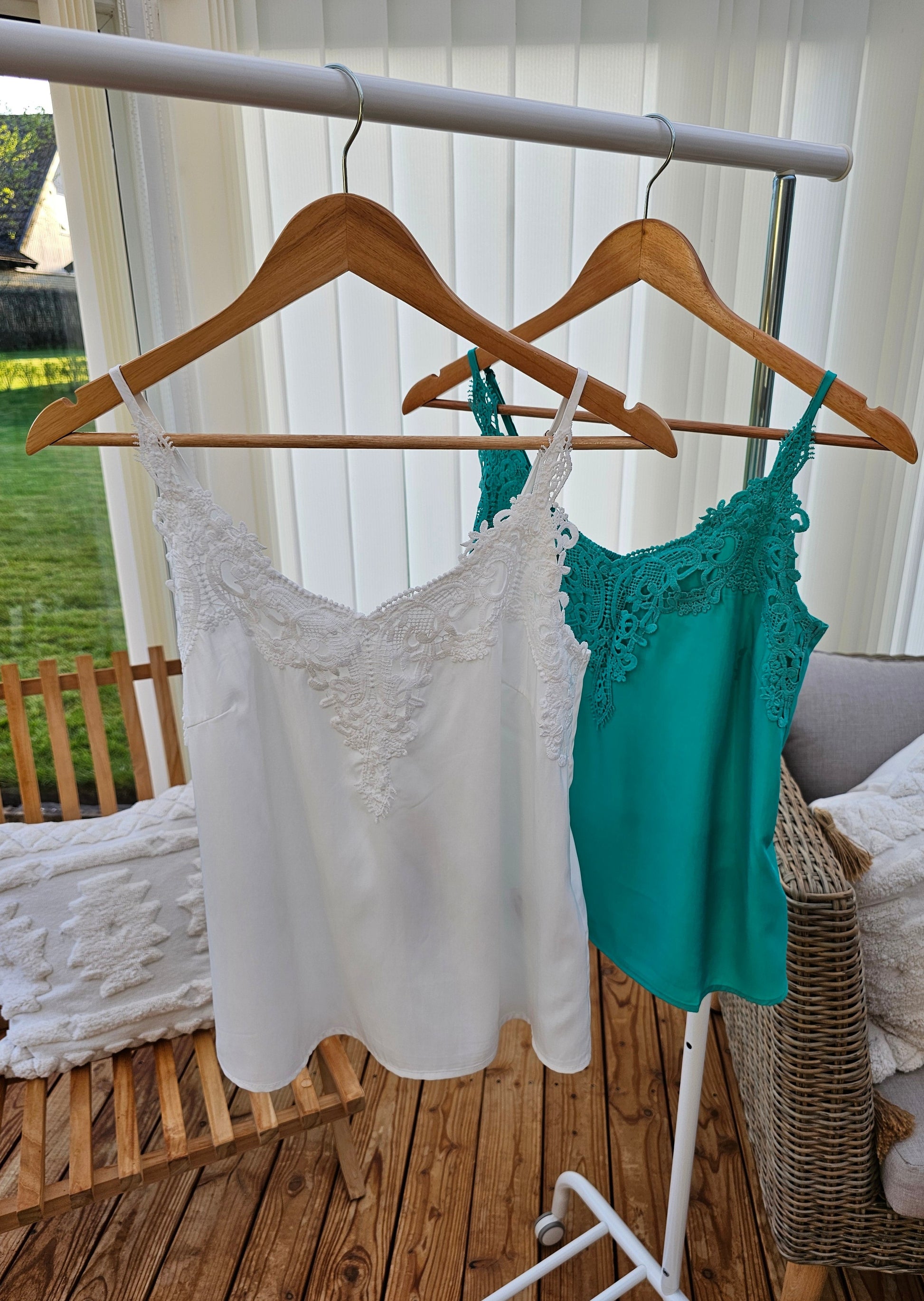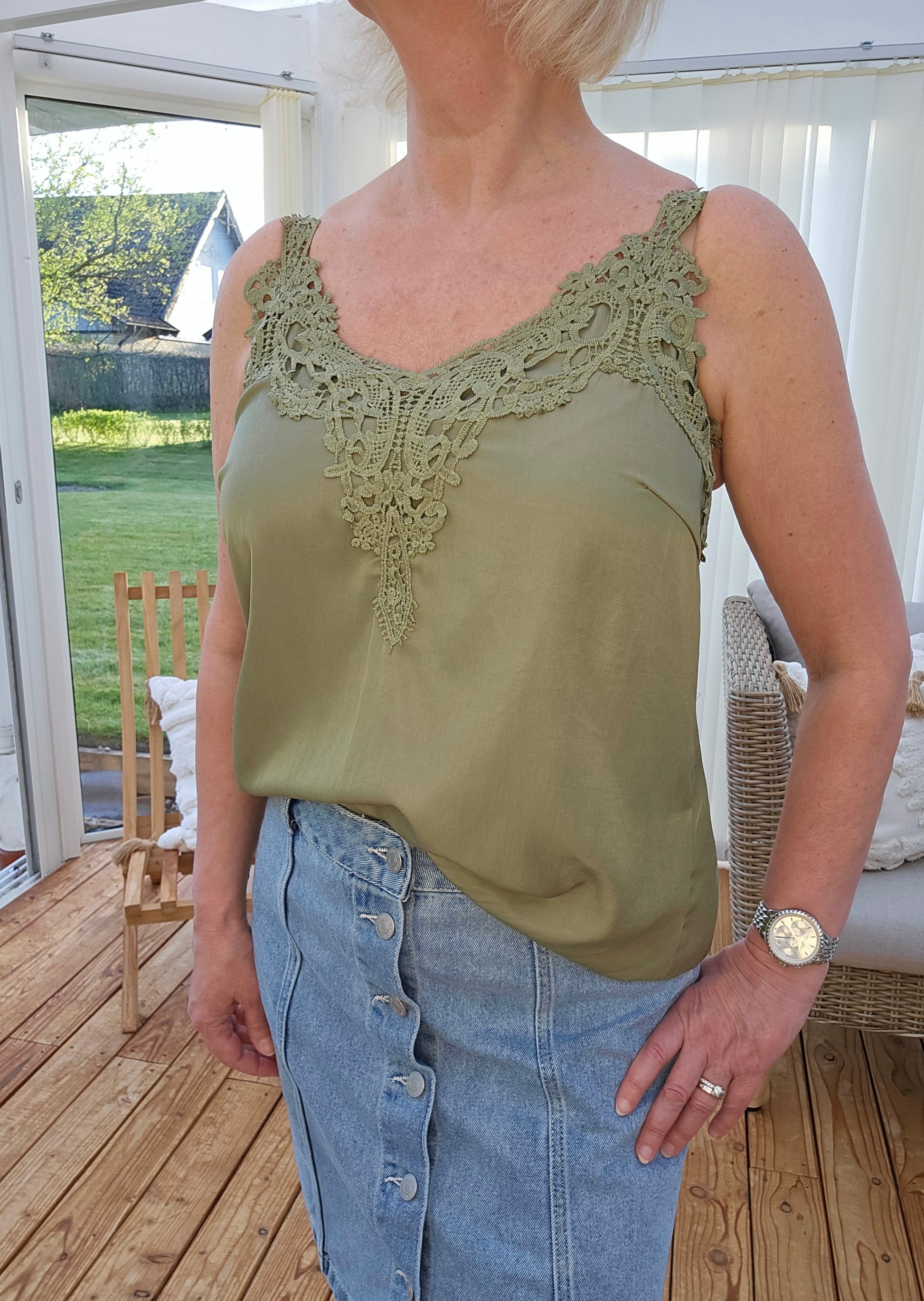 Produktbeskrivning: Ett vitt löst sittande linne med bredare spets fram. Smala justerbara axelband. Spetsen täcker Bh:n fint fram och baktill.