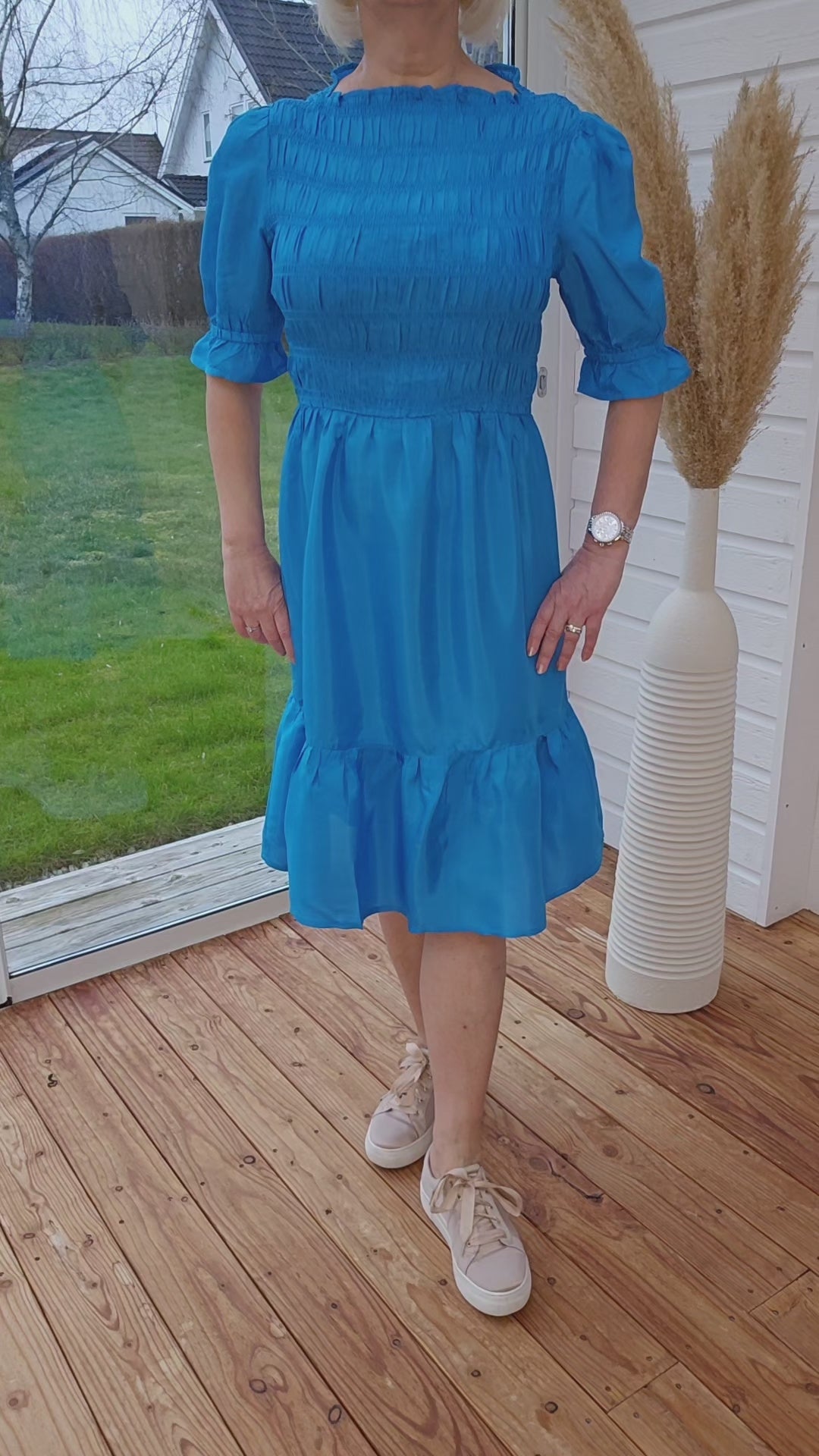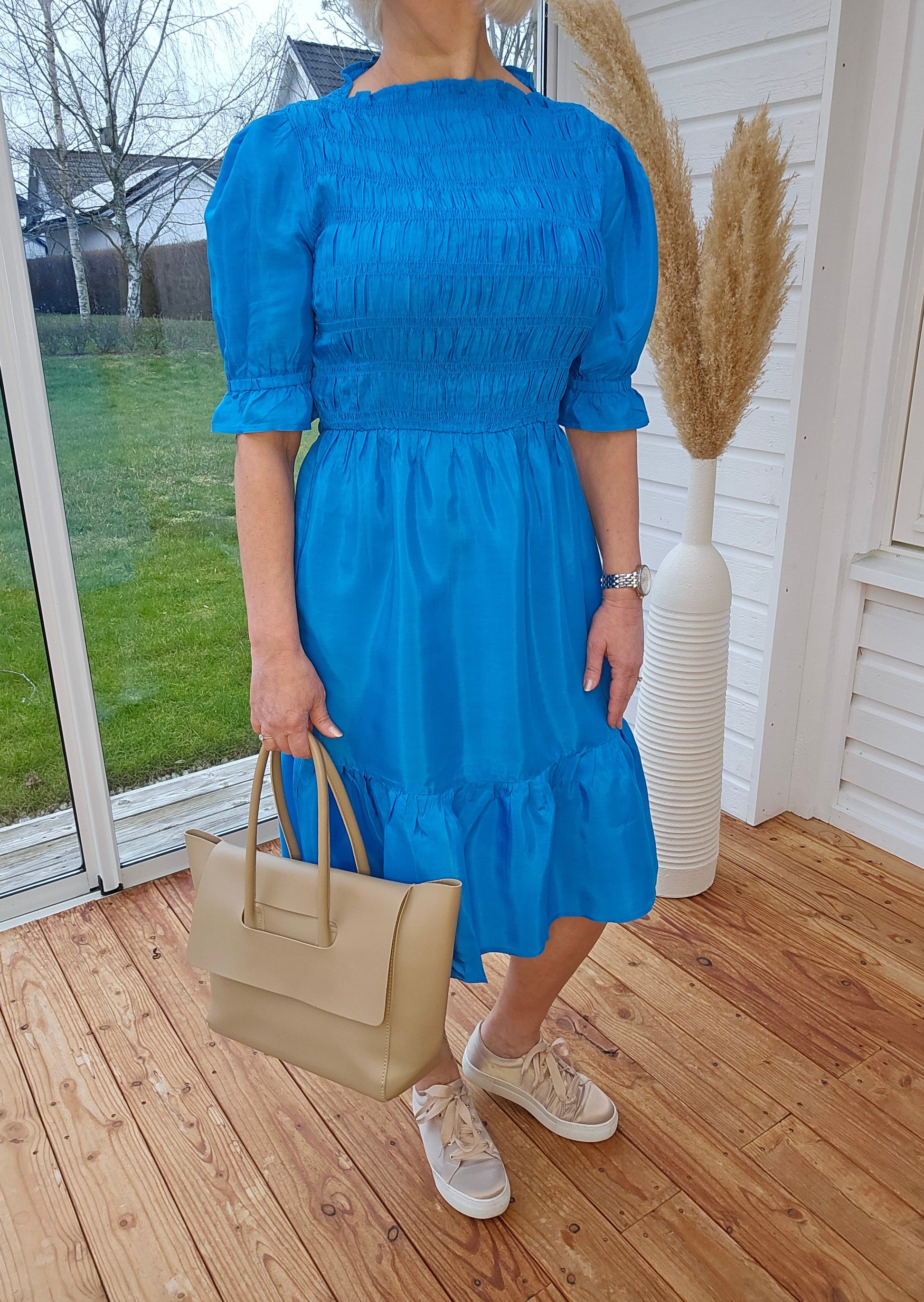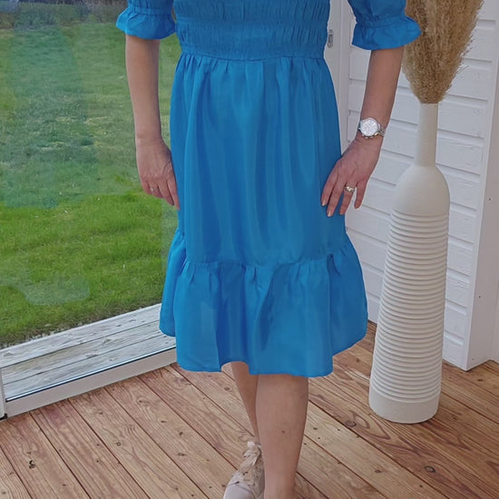 Produktbeskrivning: Klarblå klänning med puffad ärm med löst sittande resår. Båthalskrage. Volang nertill i kjolen. Lite lyster i tyget.