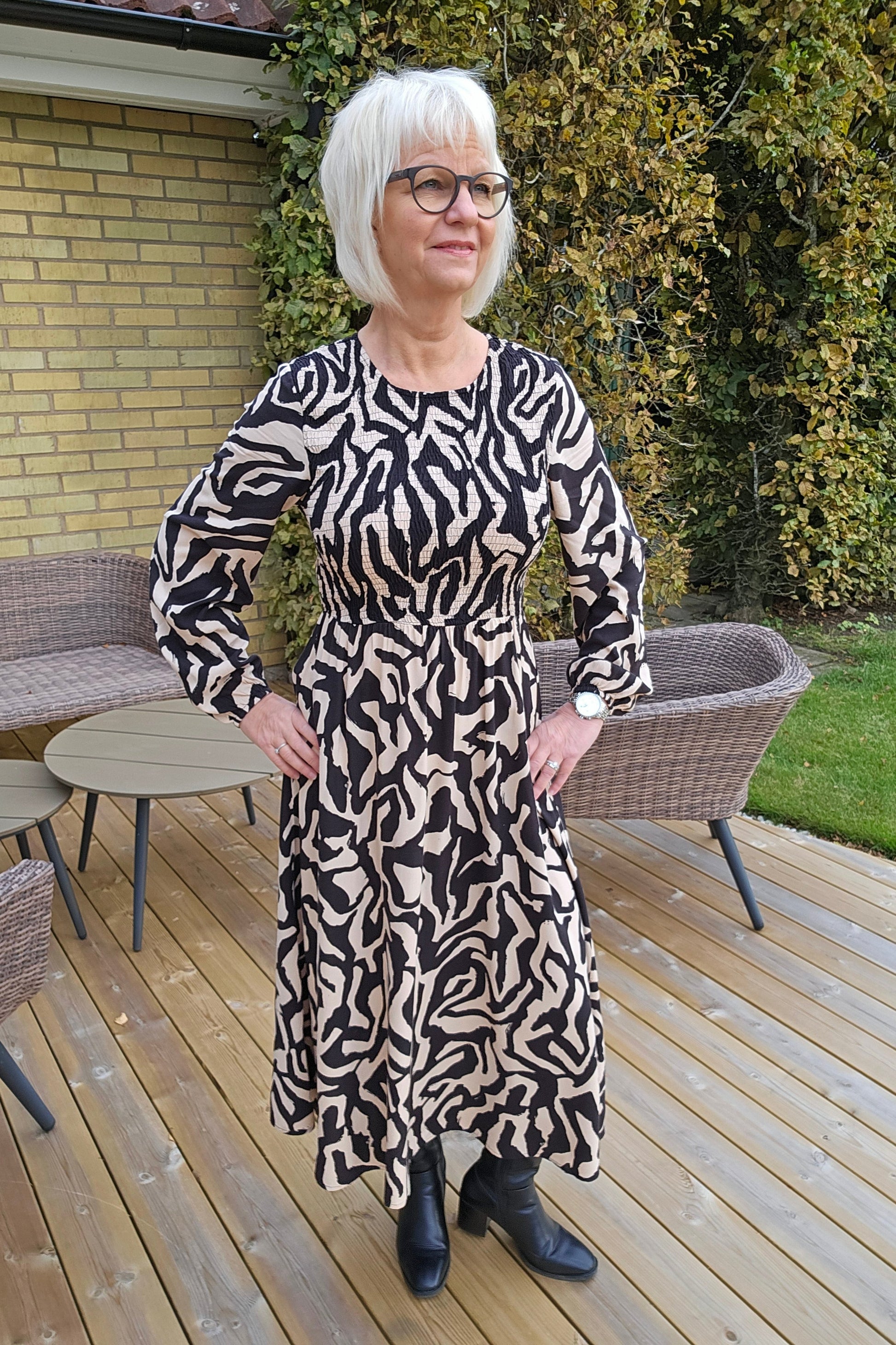 Produktbeskrivning: Långärmad klänning med smock upptill och A-linje format nedtill. Resår i ärm slut. Färgerna är svart och beige i trendigt mönster.