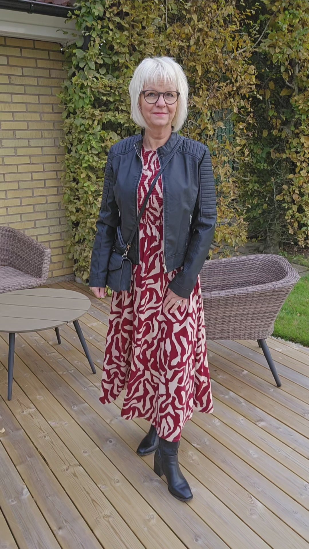 Produktbeskrivning: Långärmad klänning med smock upptill och A-linje format nedtill. Resår i ärm slut. Färgerna är vinröd och beige i trendigt mönster.