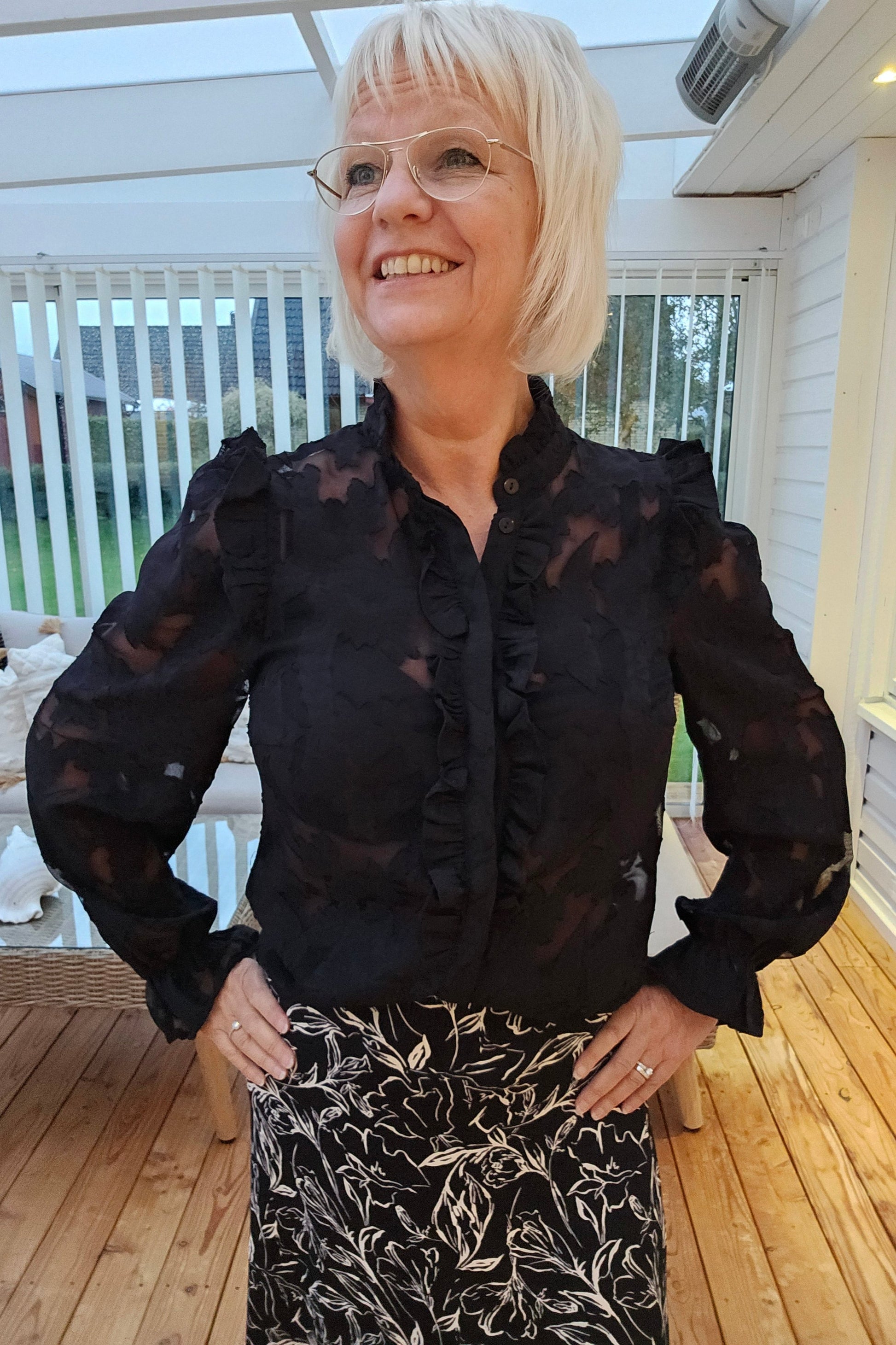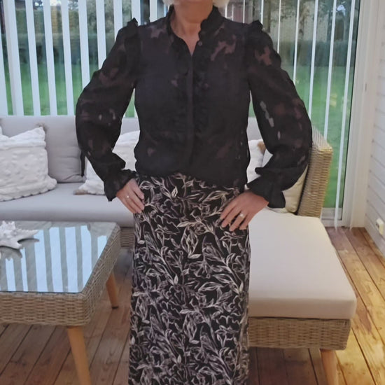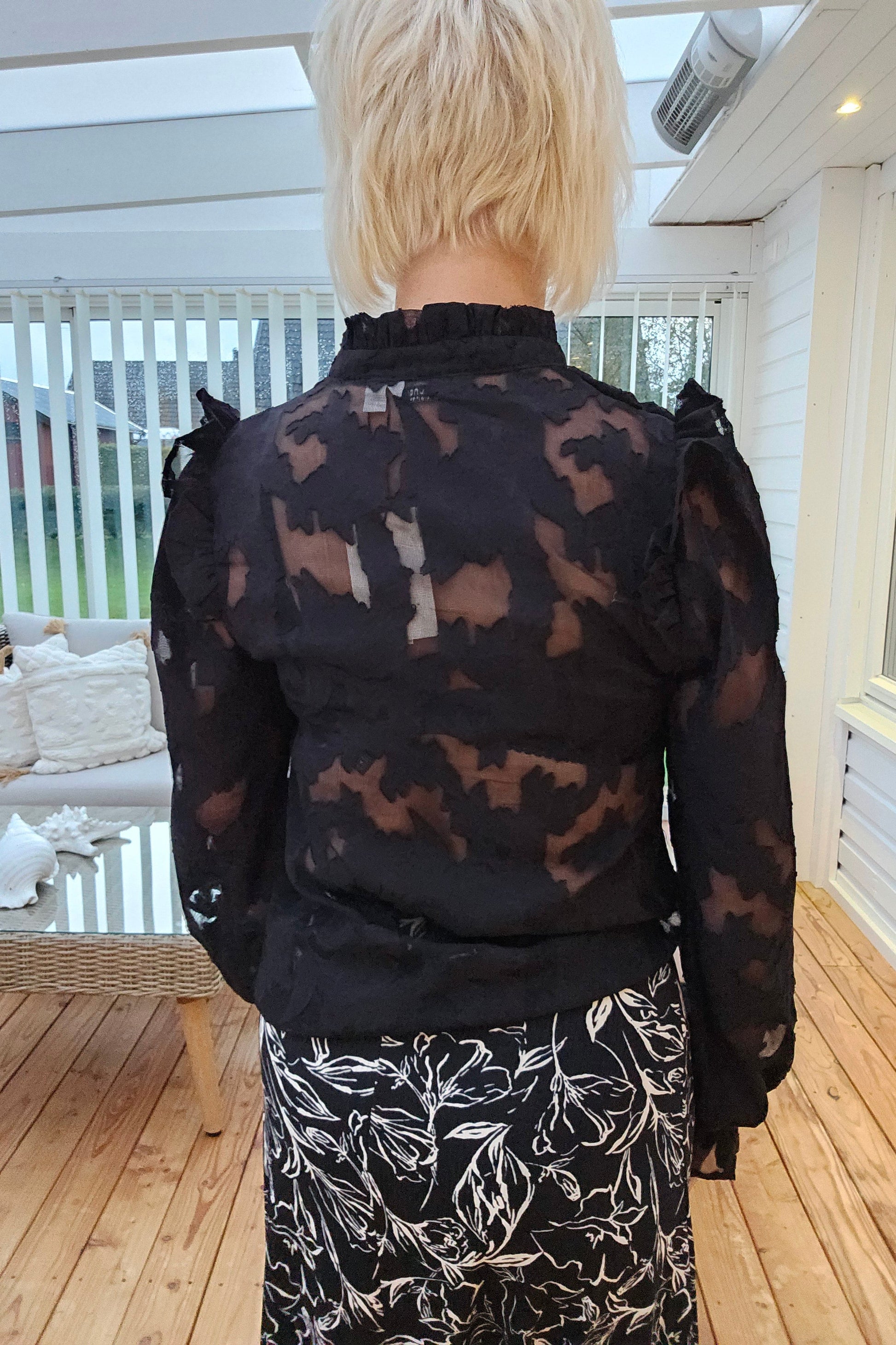 Produktbeskrivning: Svart blus i spets struktur med ståkrage och dold hel knapprad. Svarta knappar. Volang i axel sömmen. Resår med volang i ärm slut.