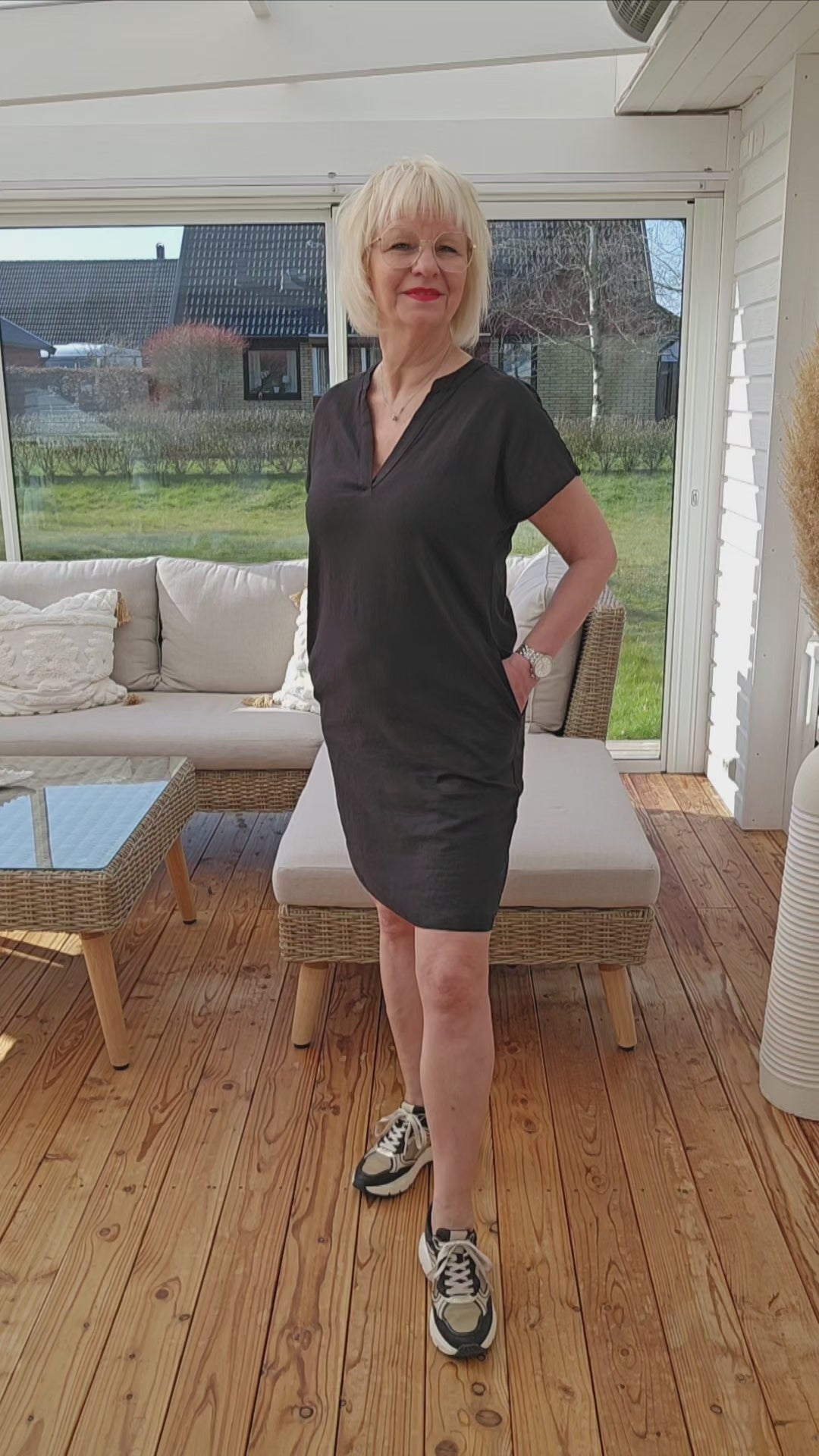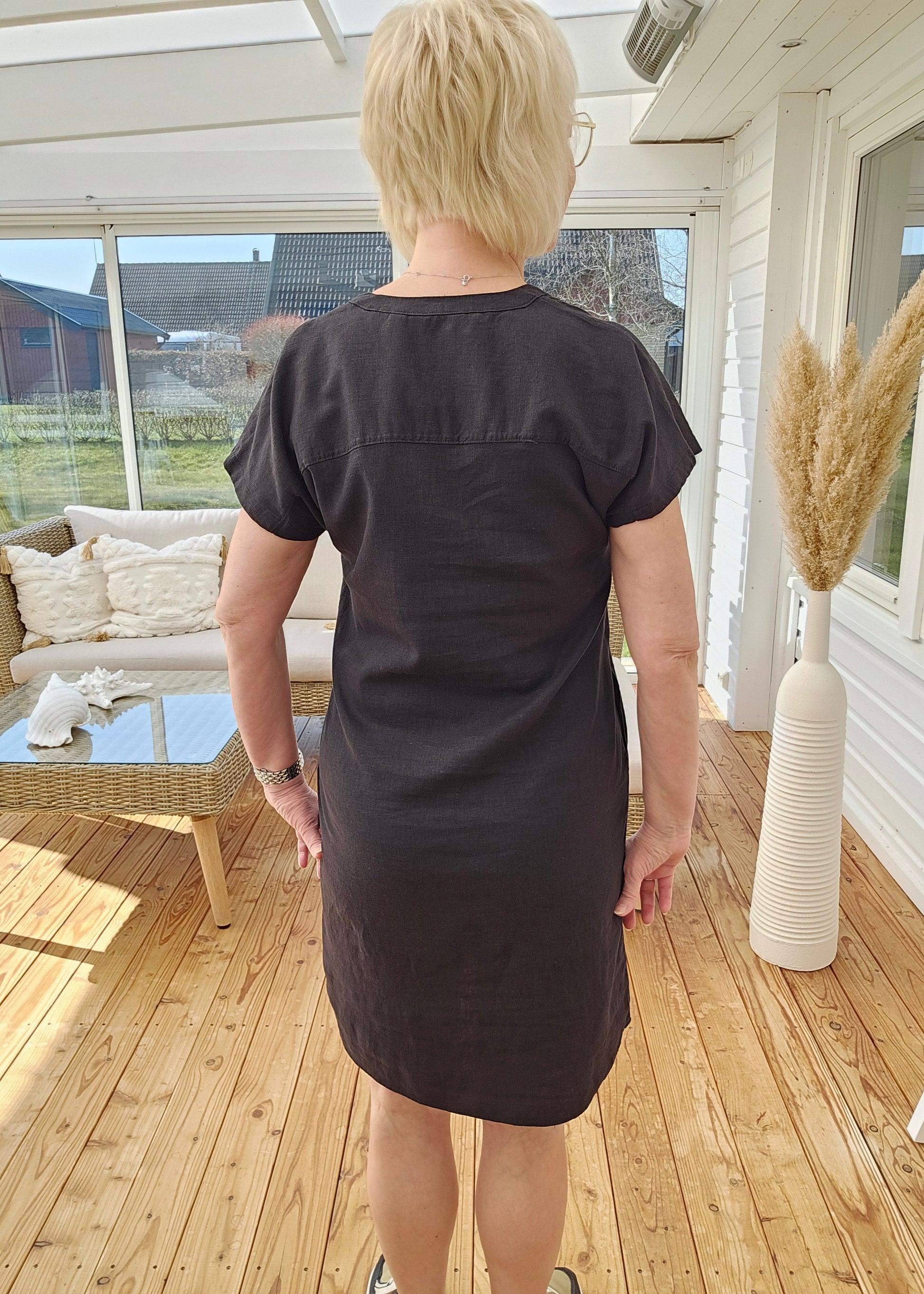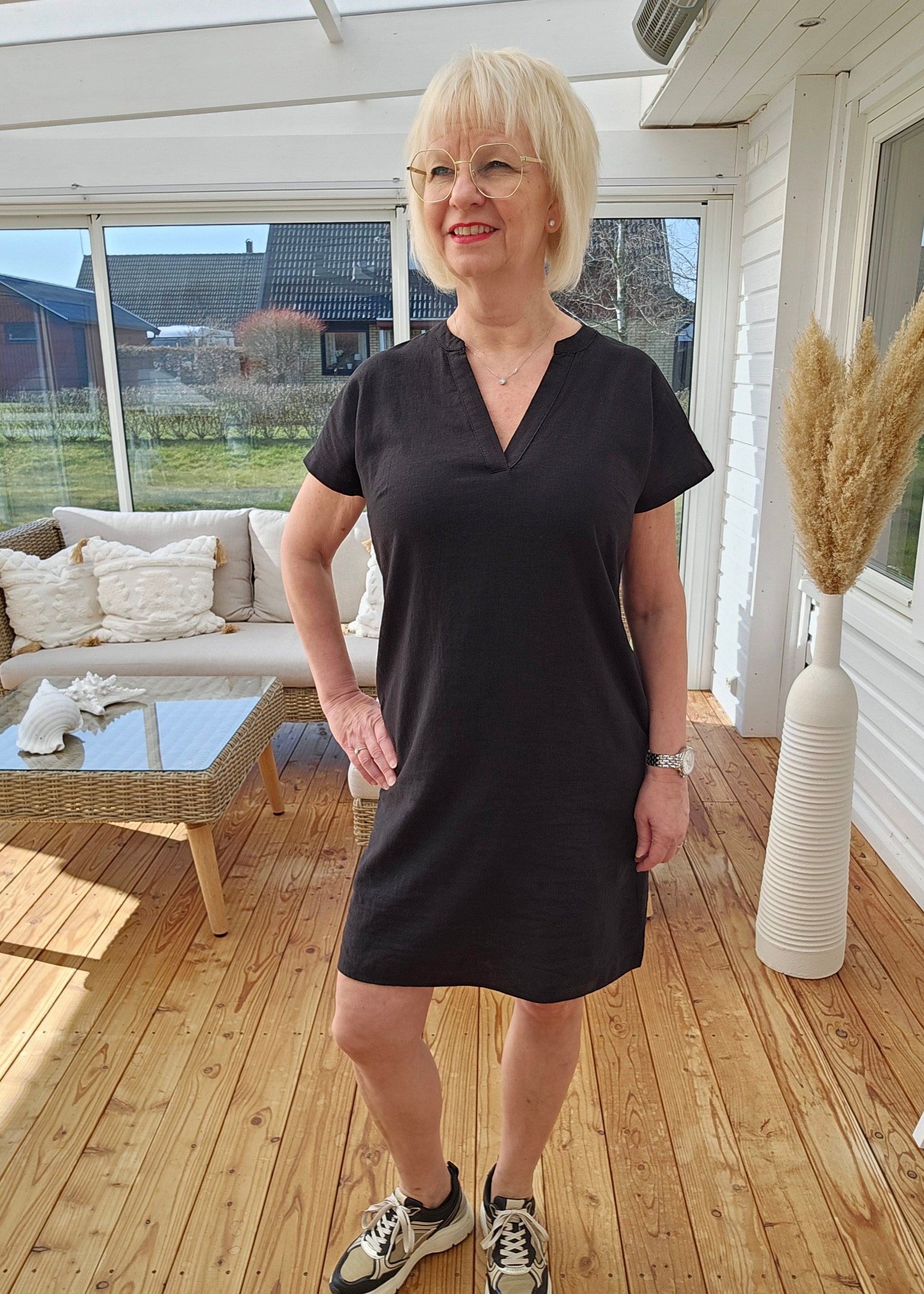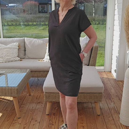Produktbeskrivning: Svart kortärmad klänning med liten ståkrage och v-ringad hals. Fickor på båda sidorna. Knälång och rakt skuren i modellen nedtill.