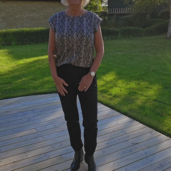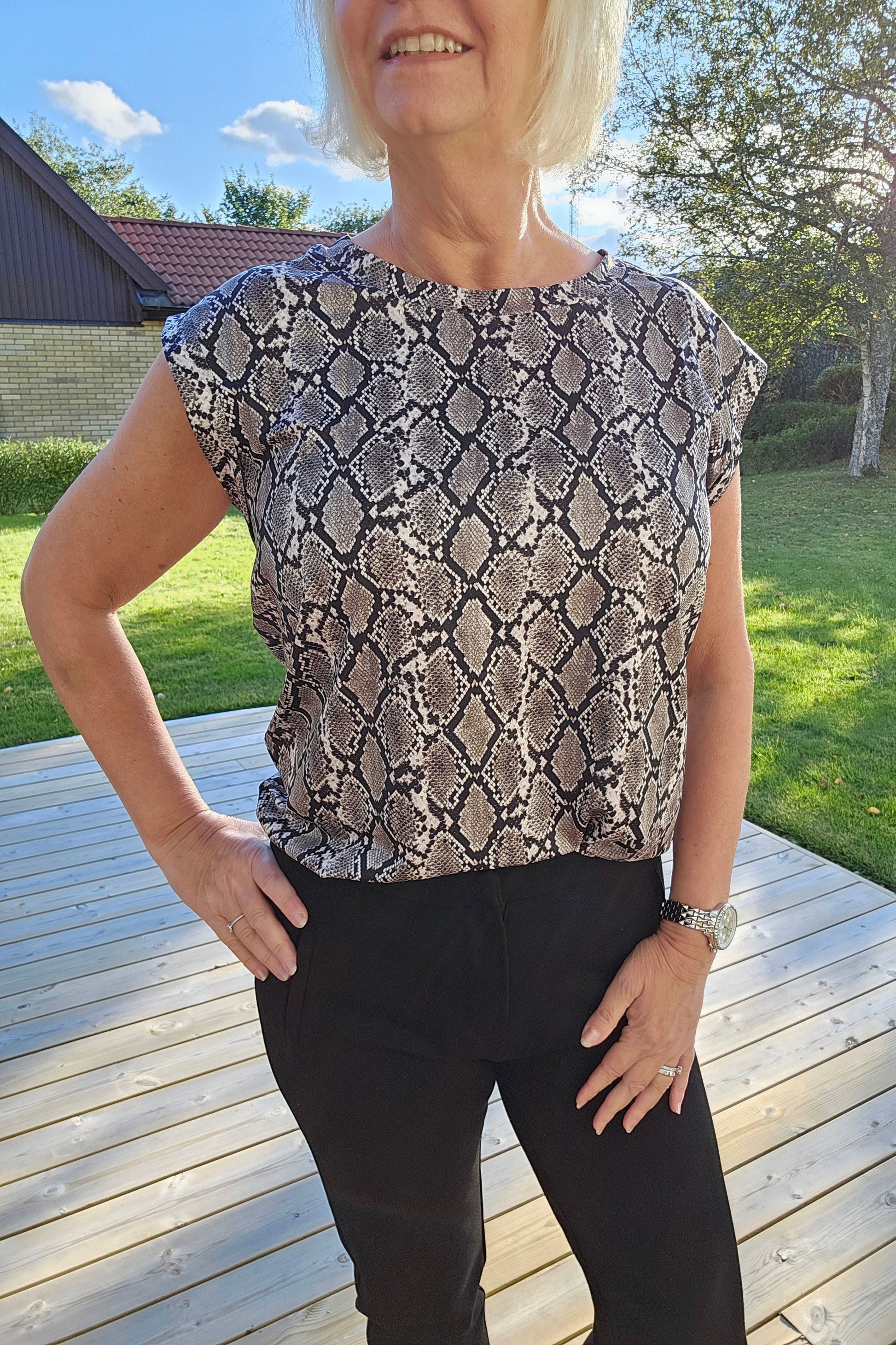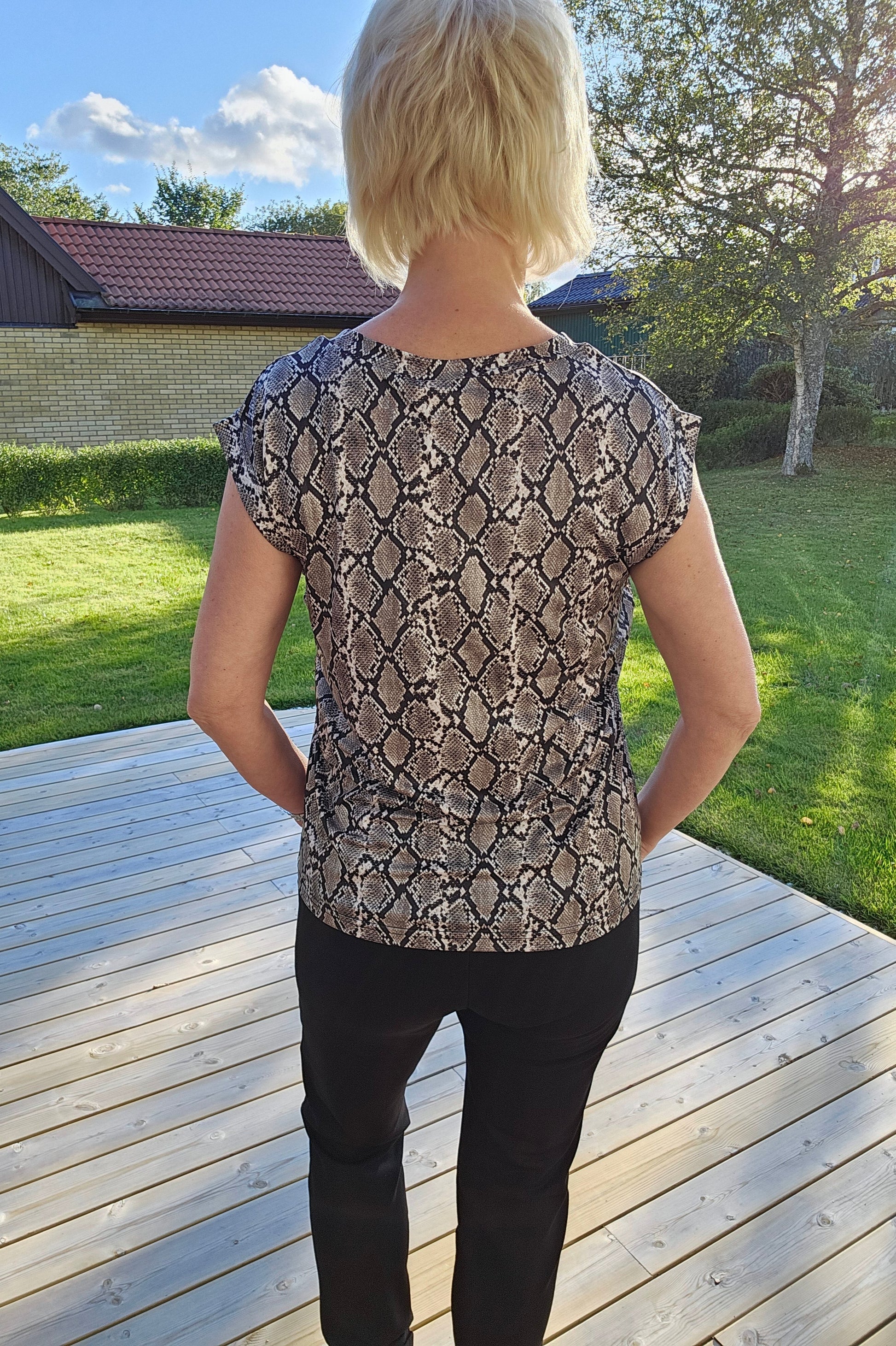Produktbeskrivning: En snake mönstrad stretchig topp med rund hals och kort ärm med ett sytt veck på ärmen