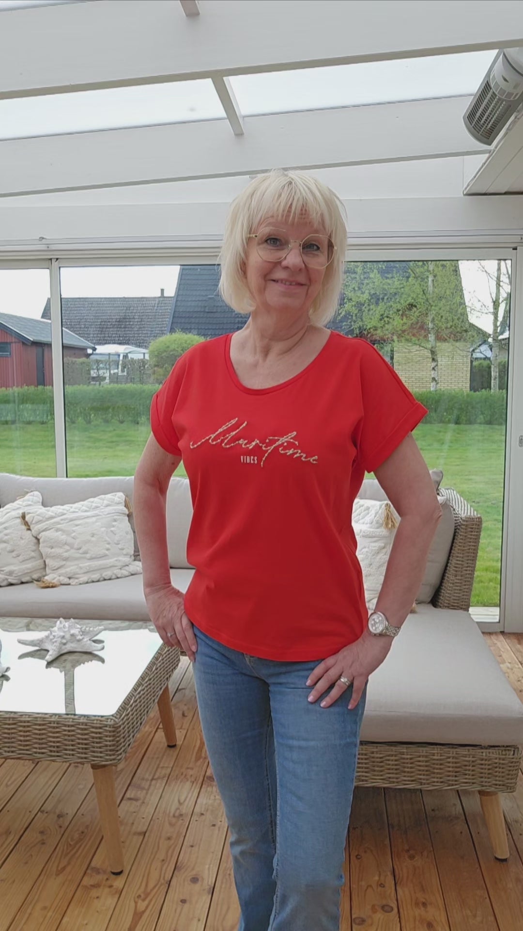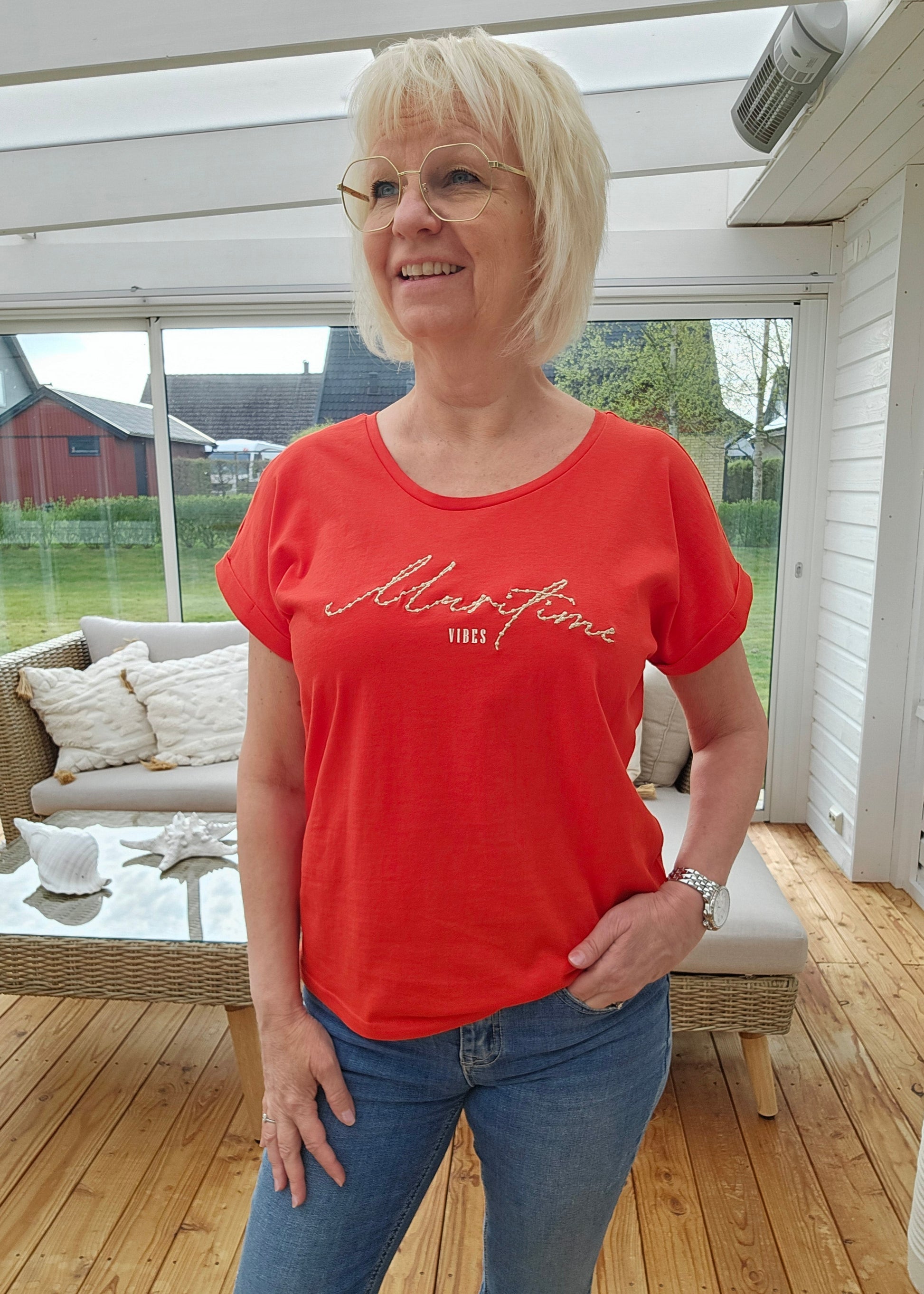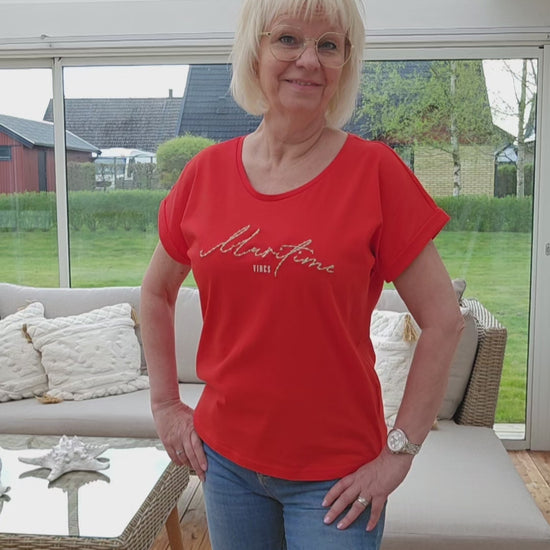 Produktbeskrivning: Röd t-shirt med snygg text i beigt. Ett uppvik i ärmen som är fastsytt