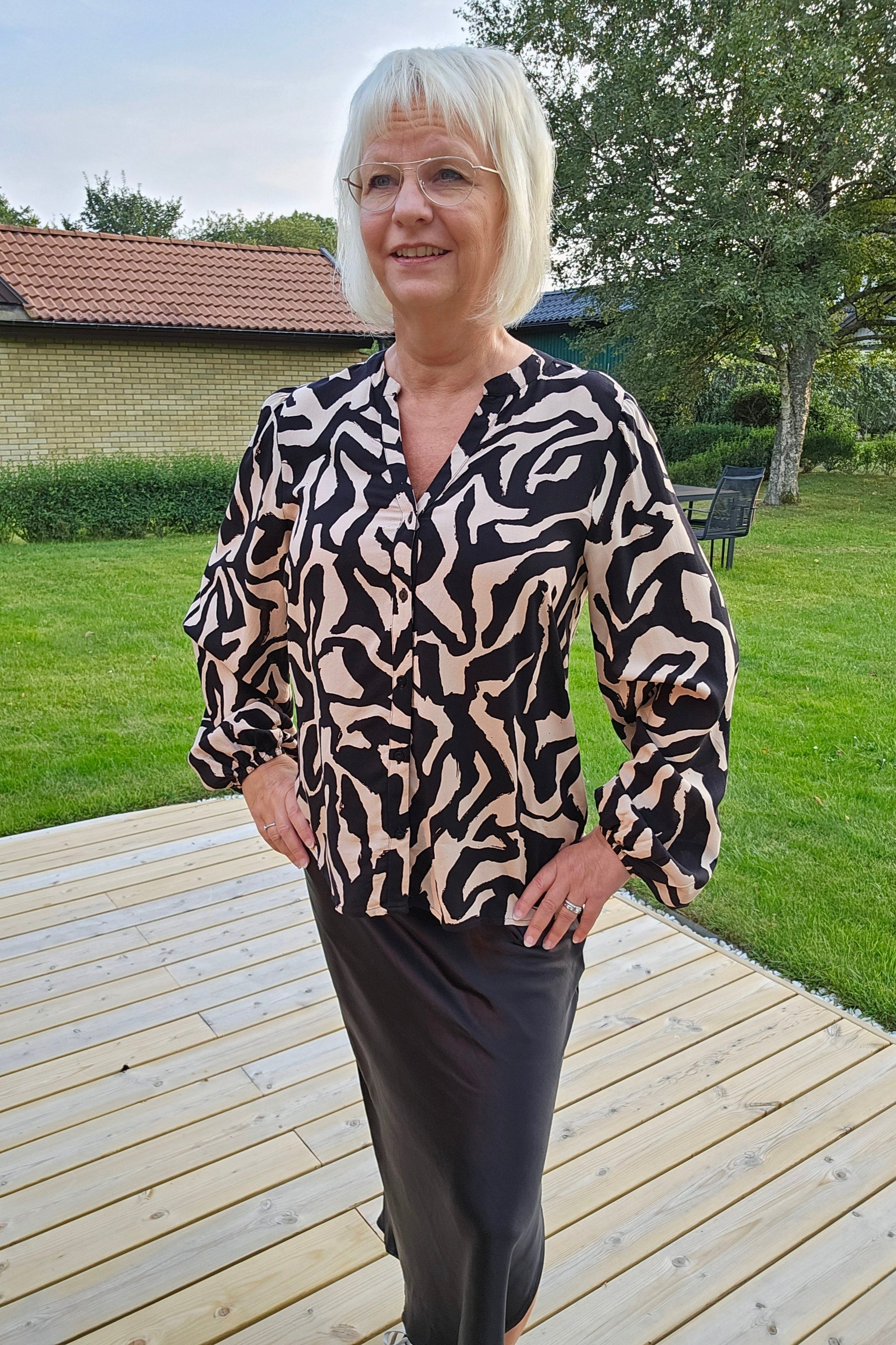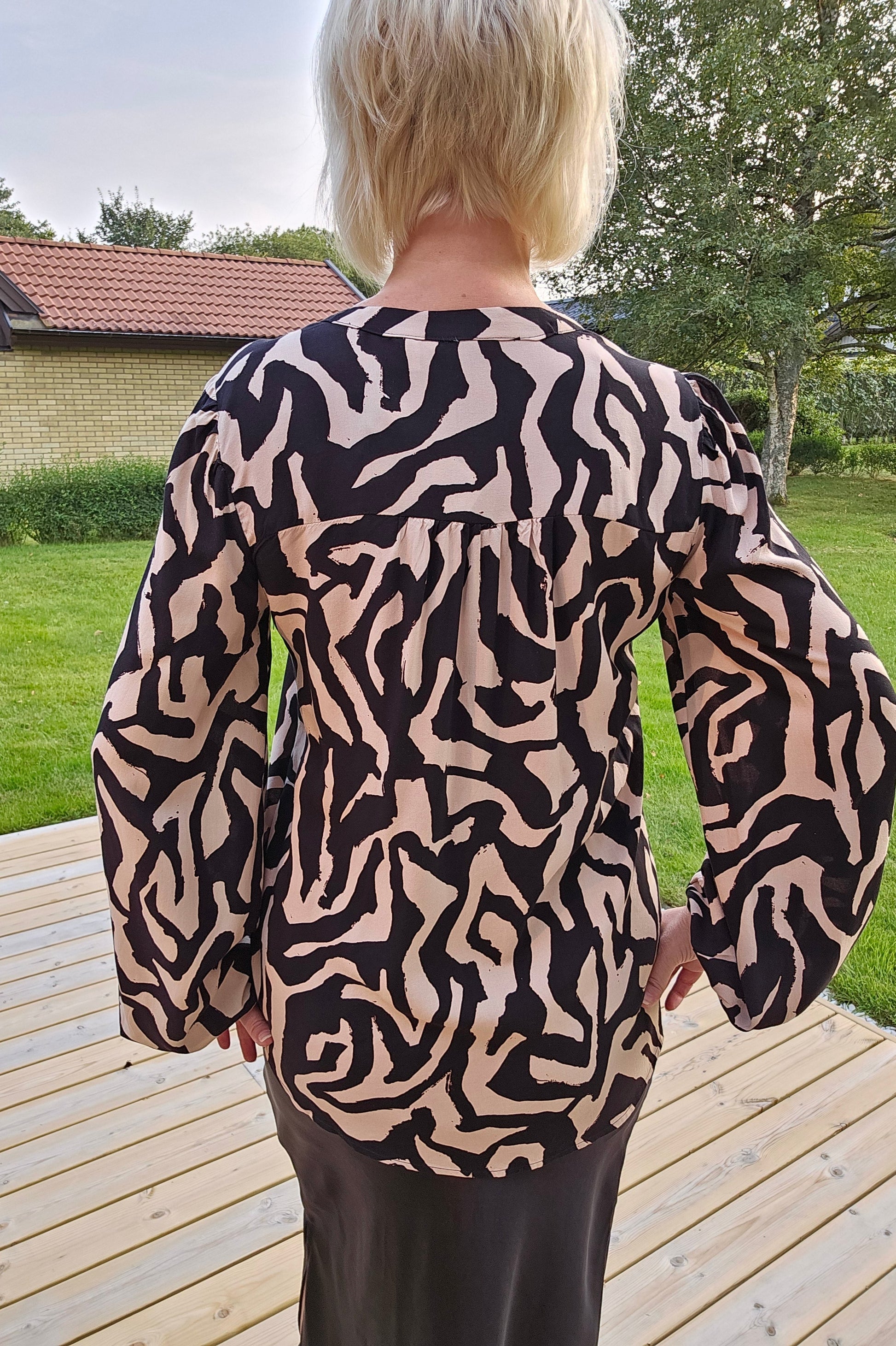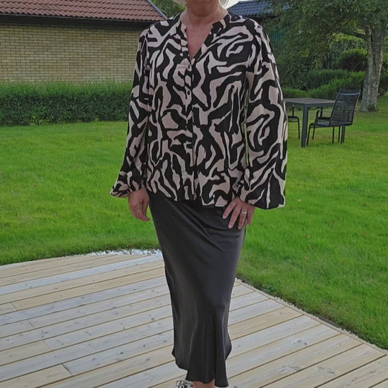 Produktbeskrivning: Mönstrad viskos blus i svart och beige. V-ringad med hel knapprad med svarta knappar. Lång ärm med resår i ärm slutet. Normal i längden.