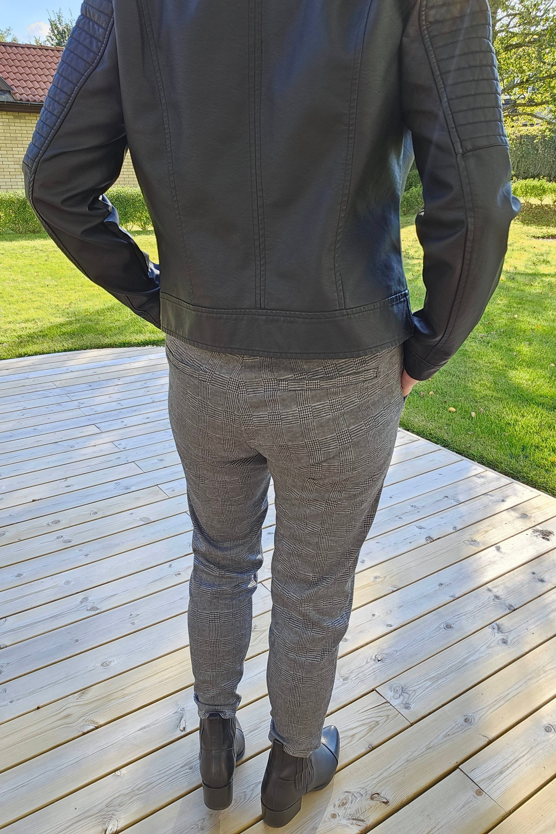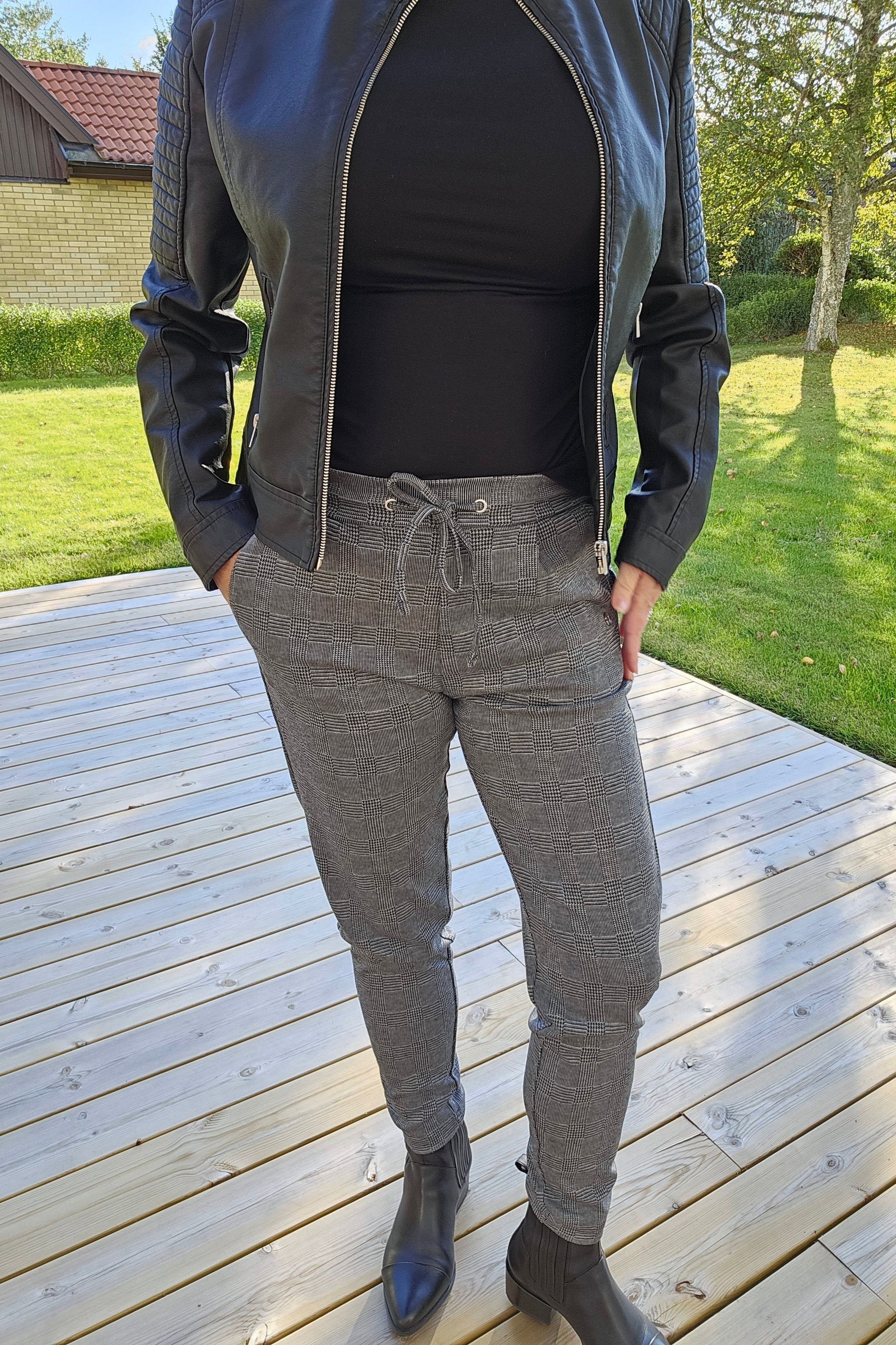Produktbeskrivning: Rutig grå byxa med resår i midjan och dragsko. Två fickor fram och passpoal fickor bak som är fejk. Väldigt stretchig i tyget.