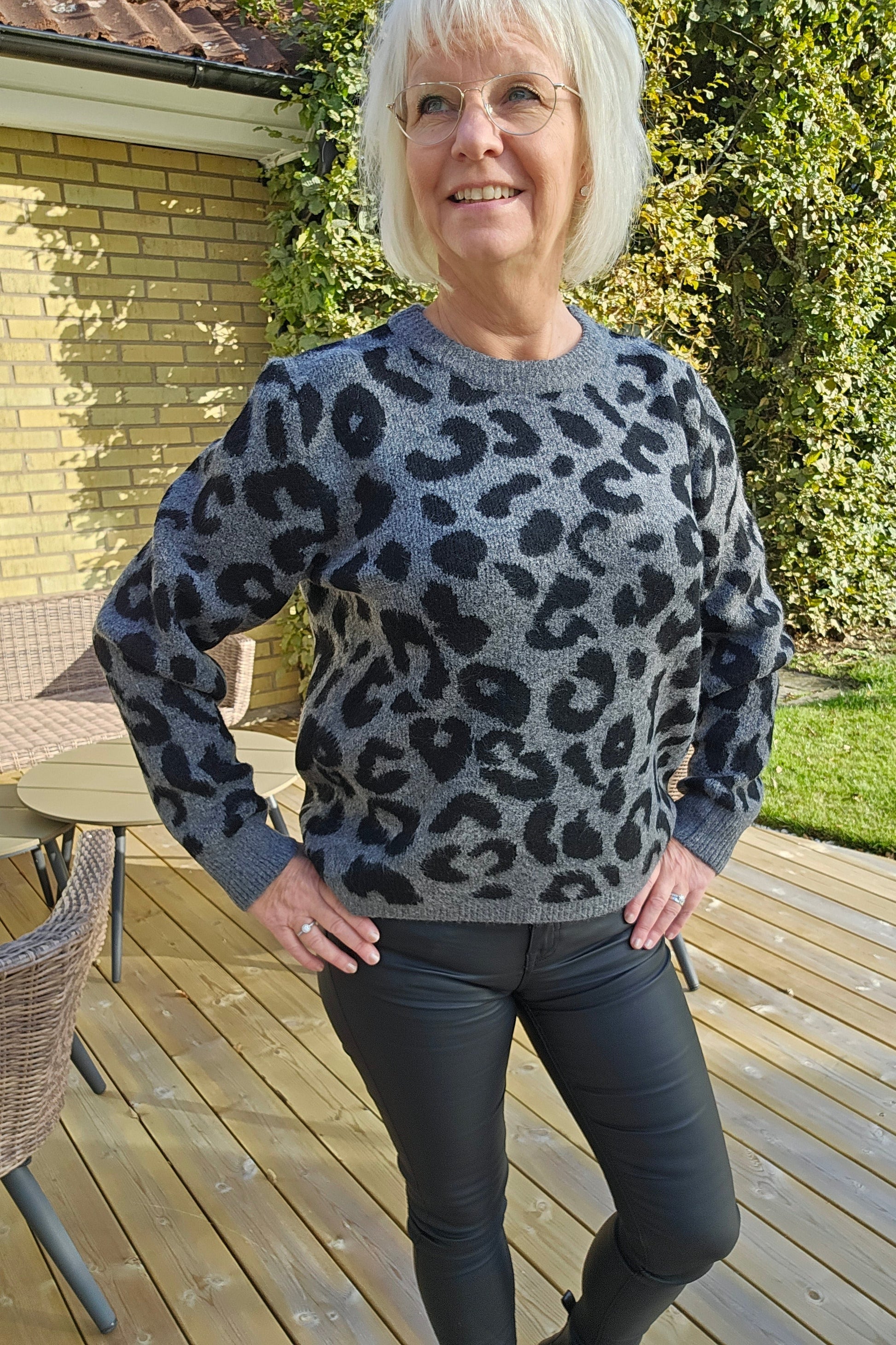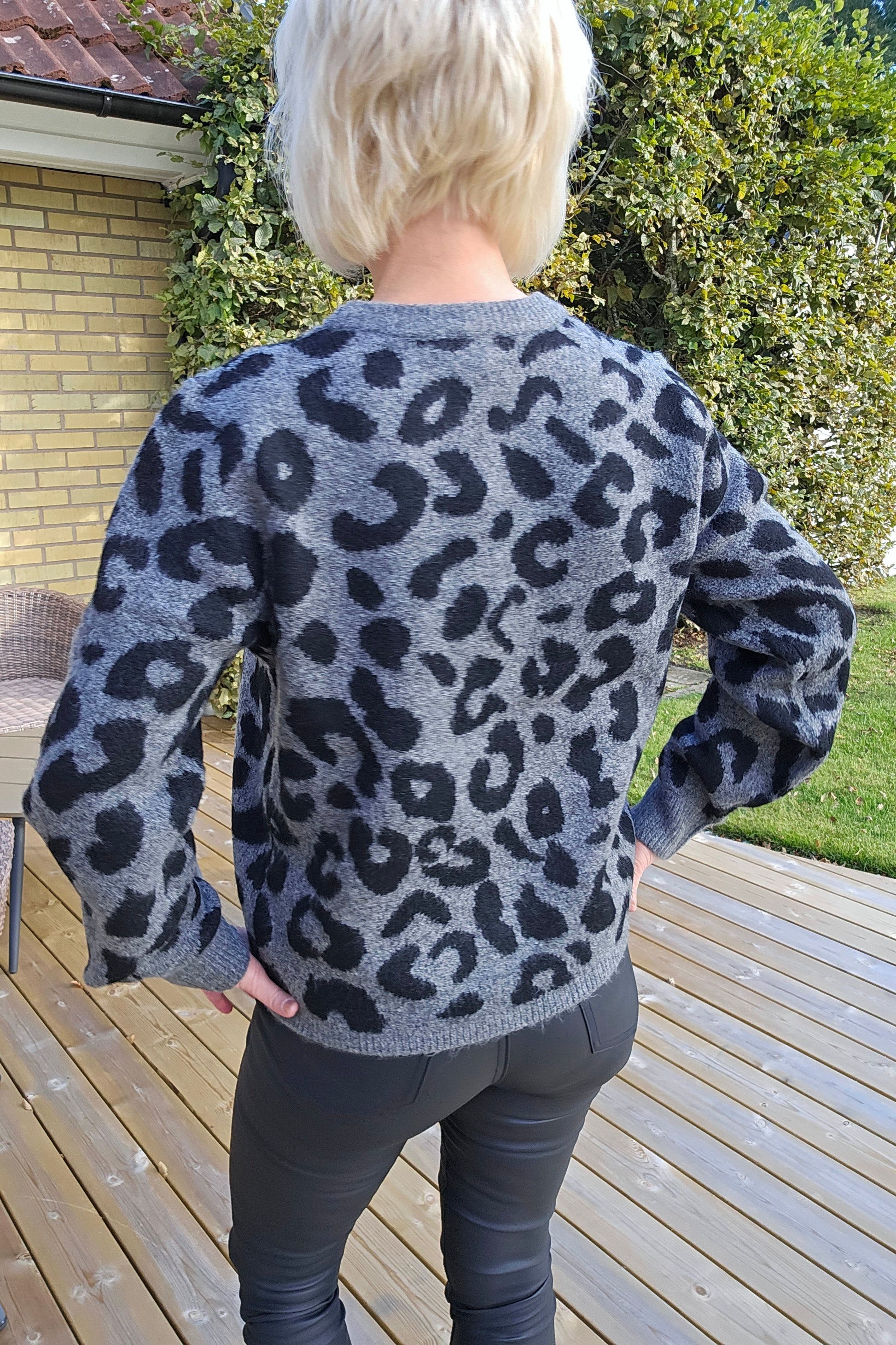 Produktbeskrivning: En grå/svart gosig leopard mönstras stickad tröja med rund hals, stickning i ärm slut och nertill.