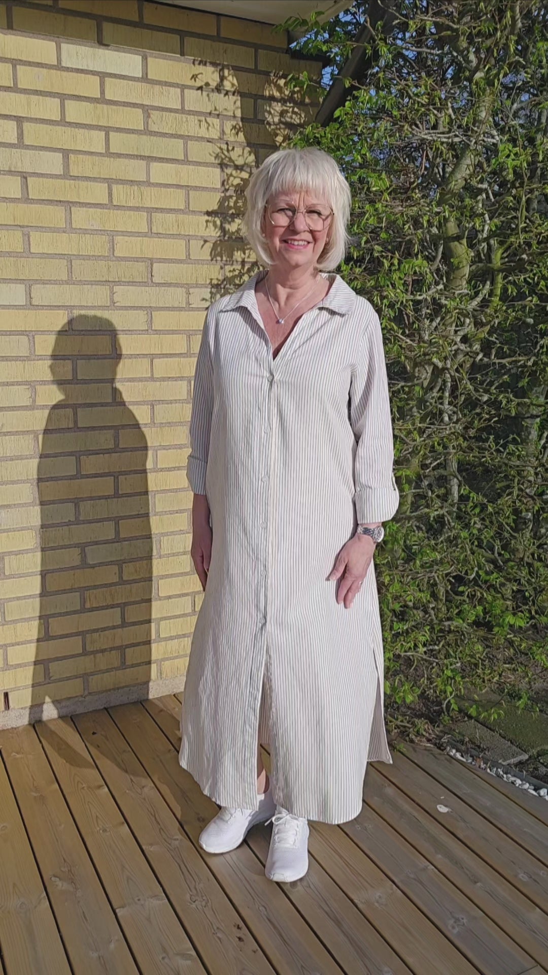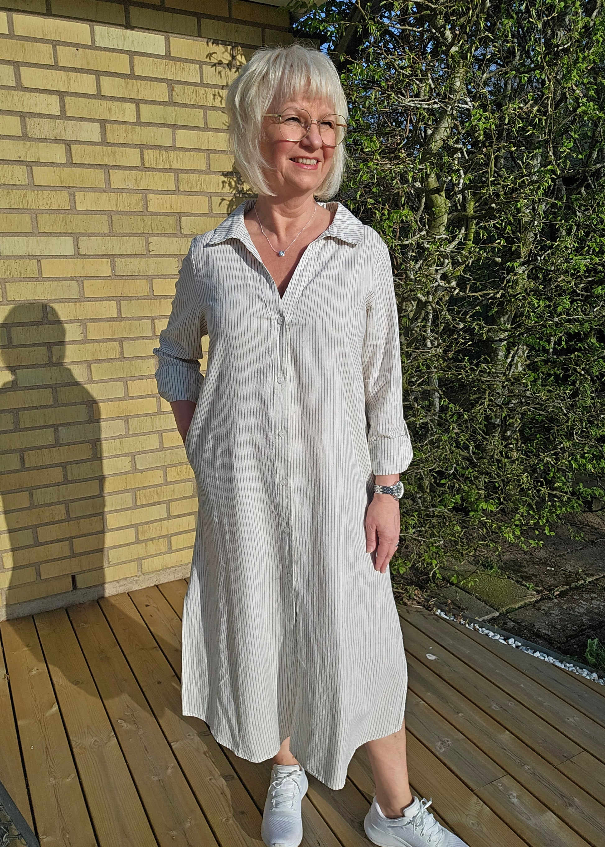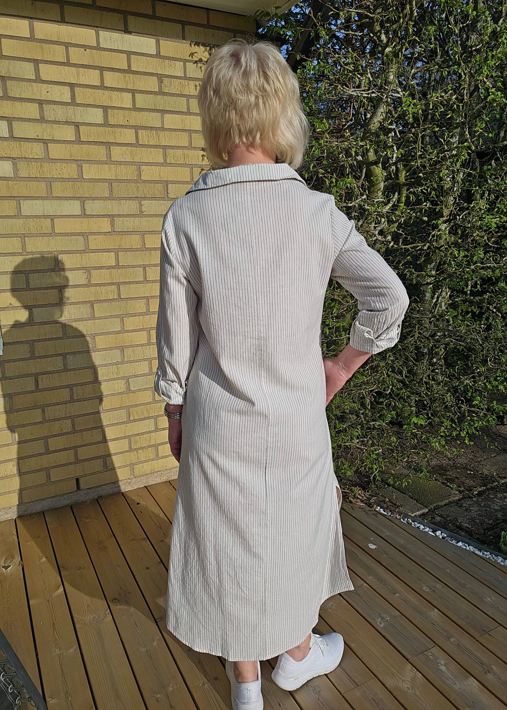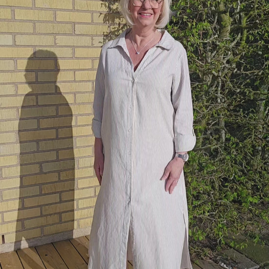 Produktbeskrivning: Lång skjortklänning med långa ärmar som går att vicka upp och fästa med en slejf och knapp. Knappar fram. Skuren i båda sidor nertill. Klänningen har fickor i sidorna.