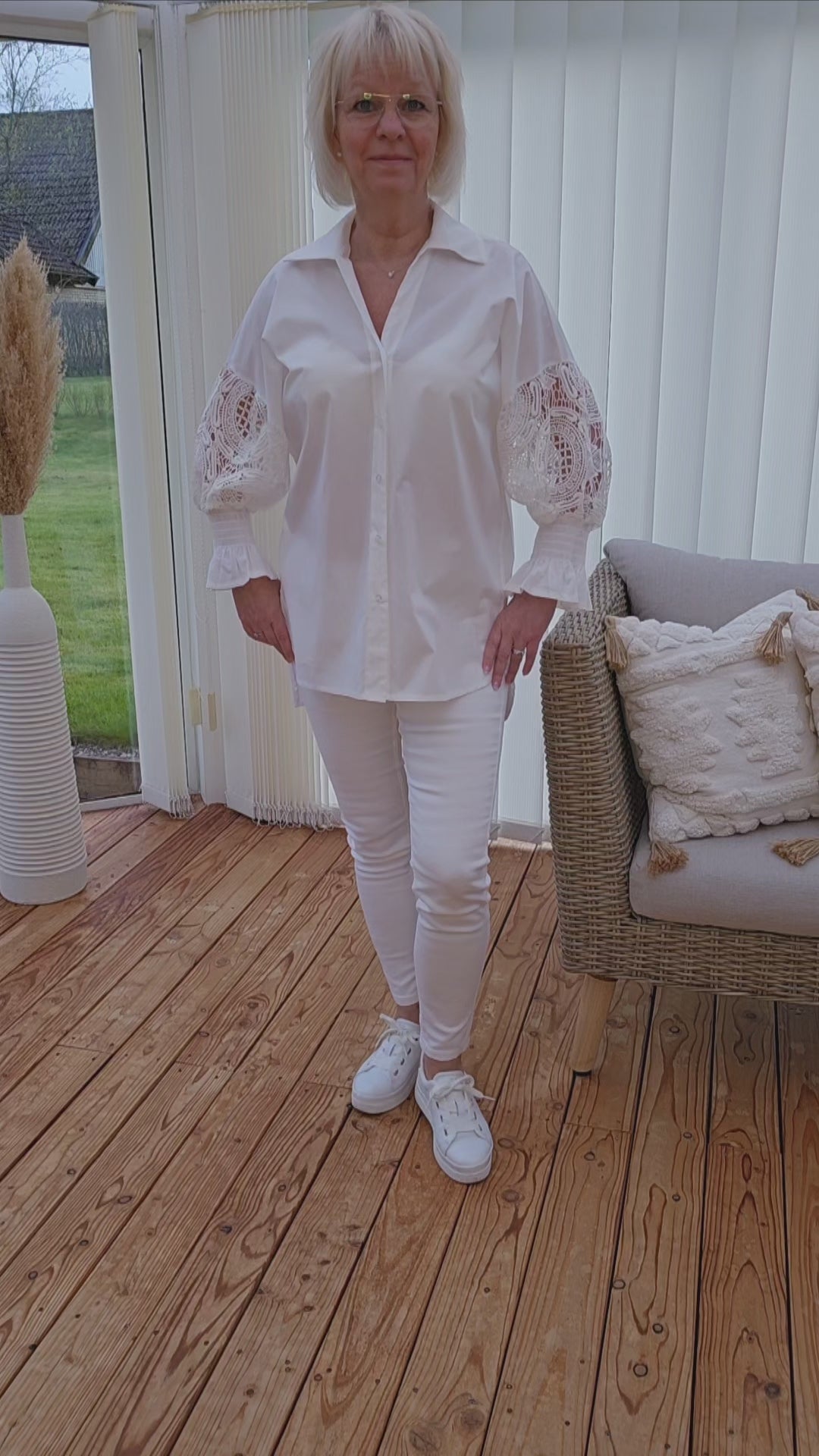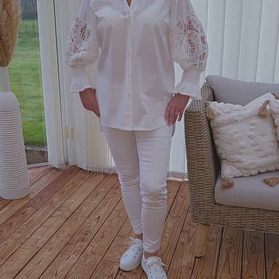 Produktbeskrivning: Vit långärmad skjorta med spets på ärmen och resår och volang i ärm slutet. Hel knäppt skjorta med vita knappar. Längre baktill. Lite oversize i modellen.