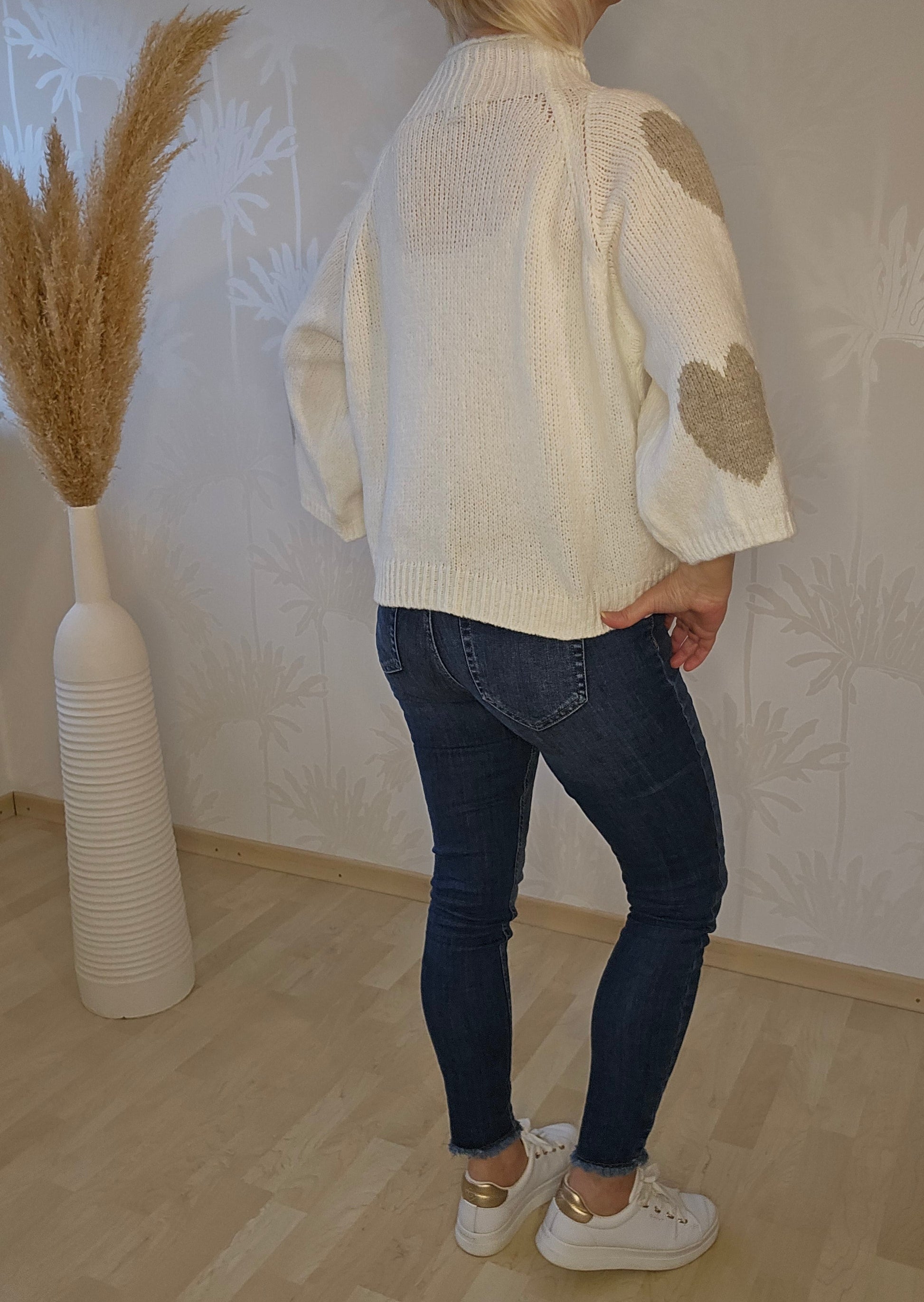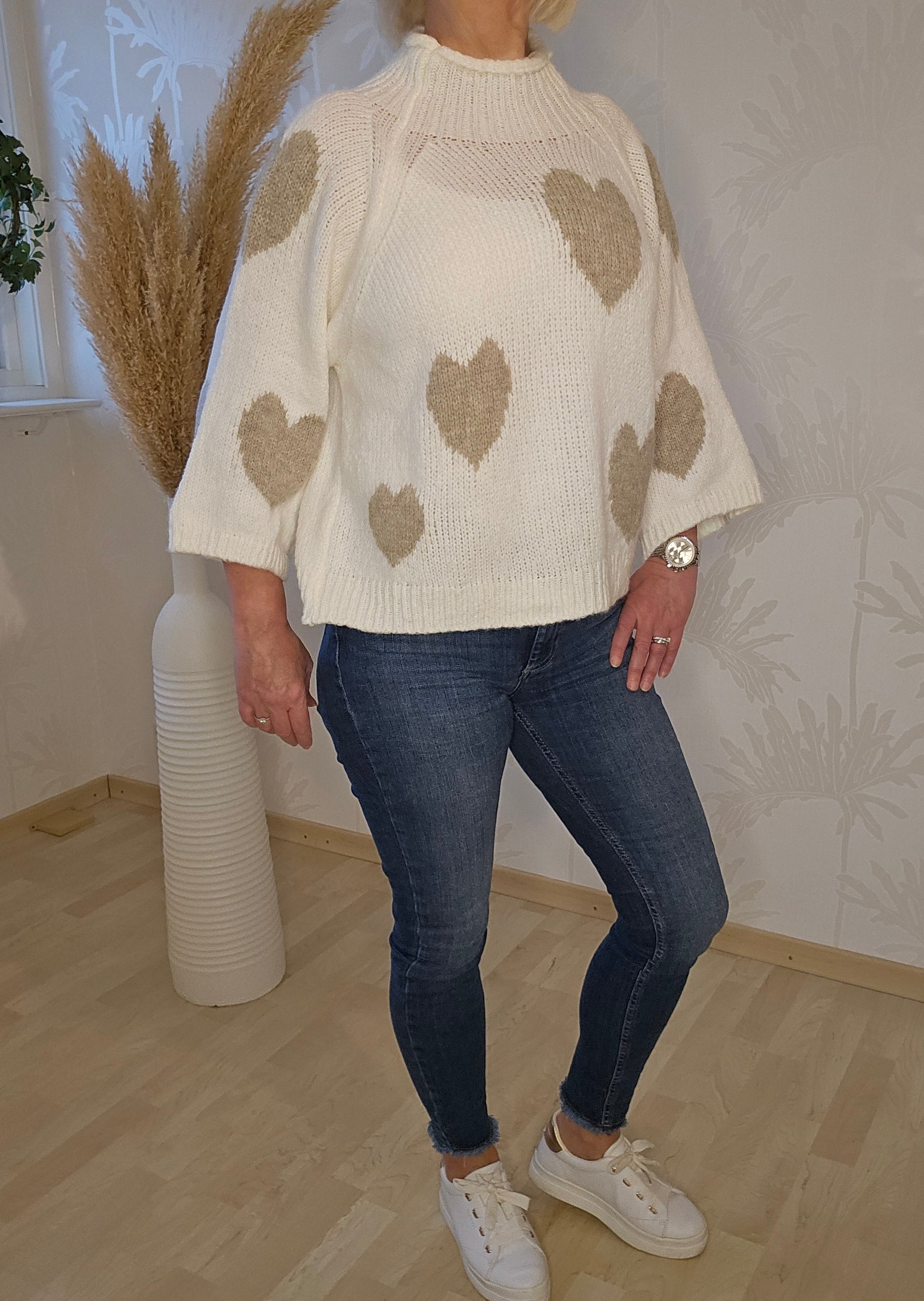 Produktbeskrivning: Go vit tröja med beige hjärtan fram och på ärmarna. Trekvarts ärm med lite vidd i ärmen. Tröjan är lite kortare i midjan, men inte för kort.