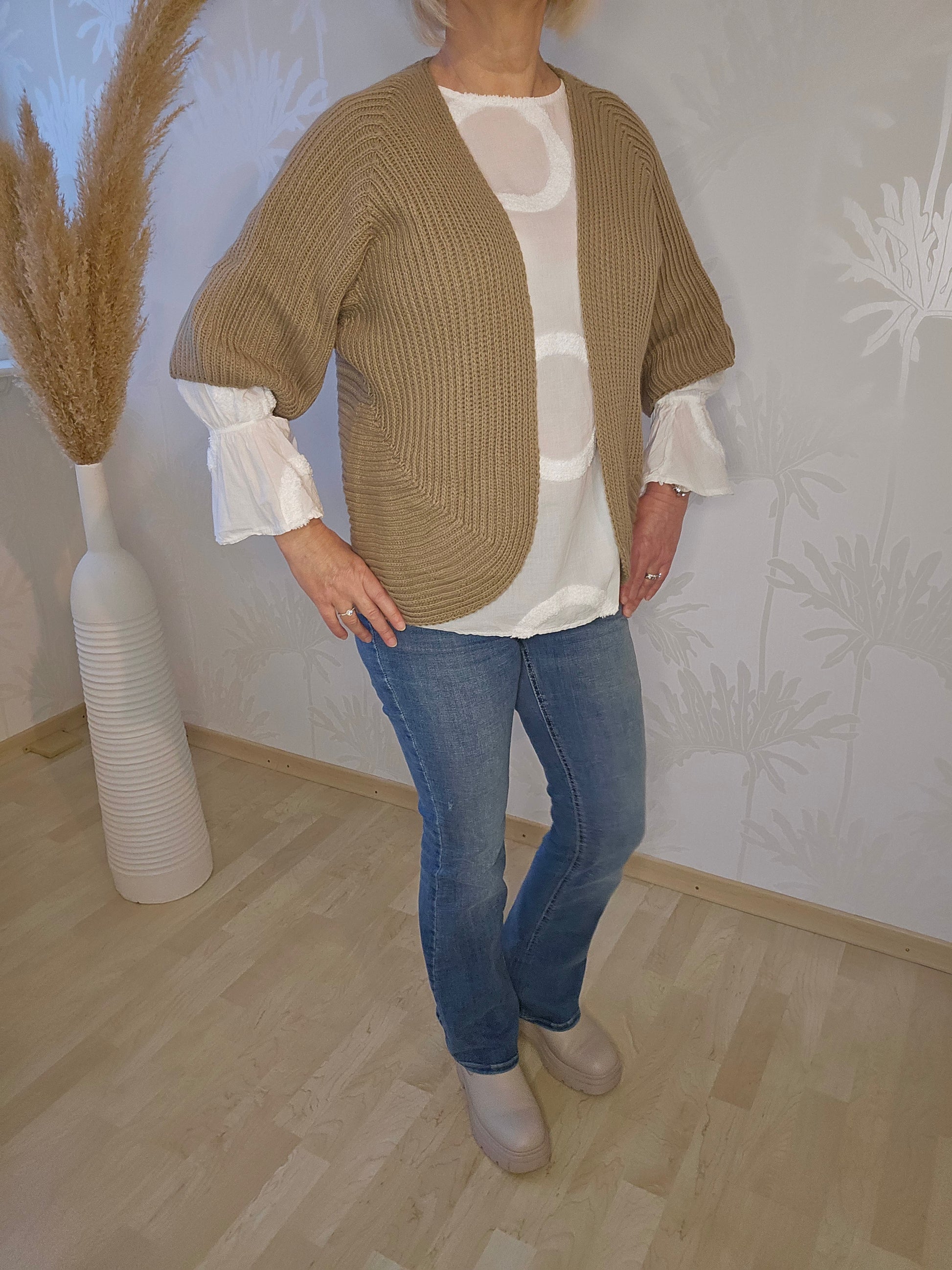 Tips: Snyggt att sätta till som vi har gjort här, se sid bild, en beige cardigan som heter Sbcarly Knit där du förstärker din outfit med det fina ärm slutet i blusen. Vill du sätta en väska till så kan vi tipsa om vår Alva väska som tar upp den beige tonen i cardiganen.