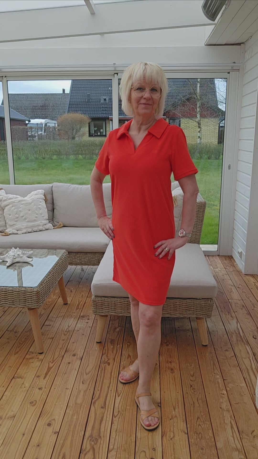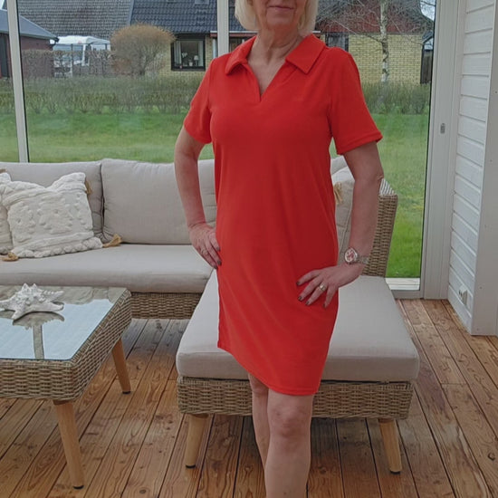 Produktbeskrivning: Riktigt somrig klänning med skjortkrage, V-ringad hals och kort ärm. Rak i modellen. Knälång. Frottékänsla. Fin kvalité