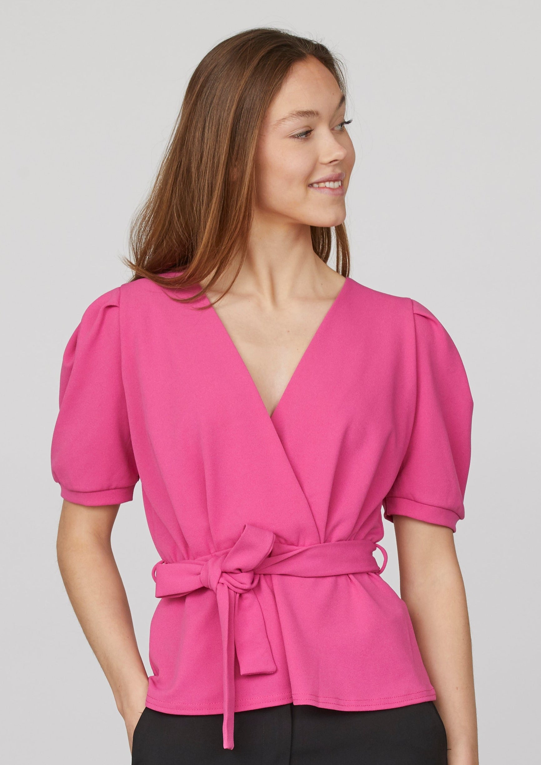 Produktbeskrivning: Cerise/rosa omlott topp med avtagbart knytskärp i midjan. Puffad ärm