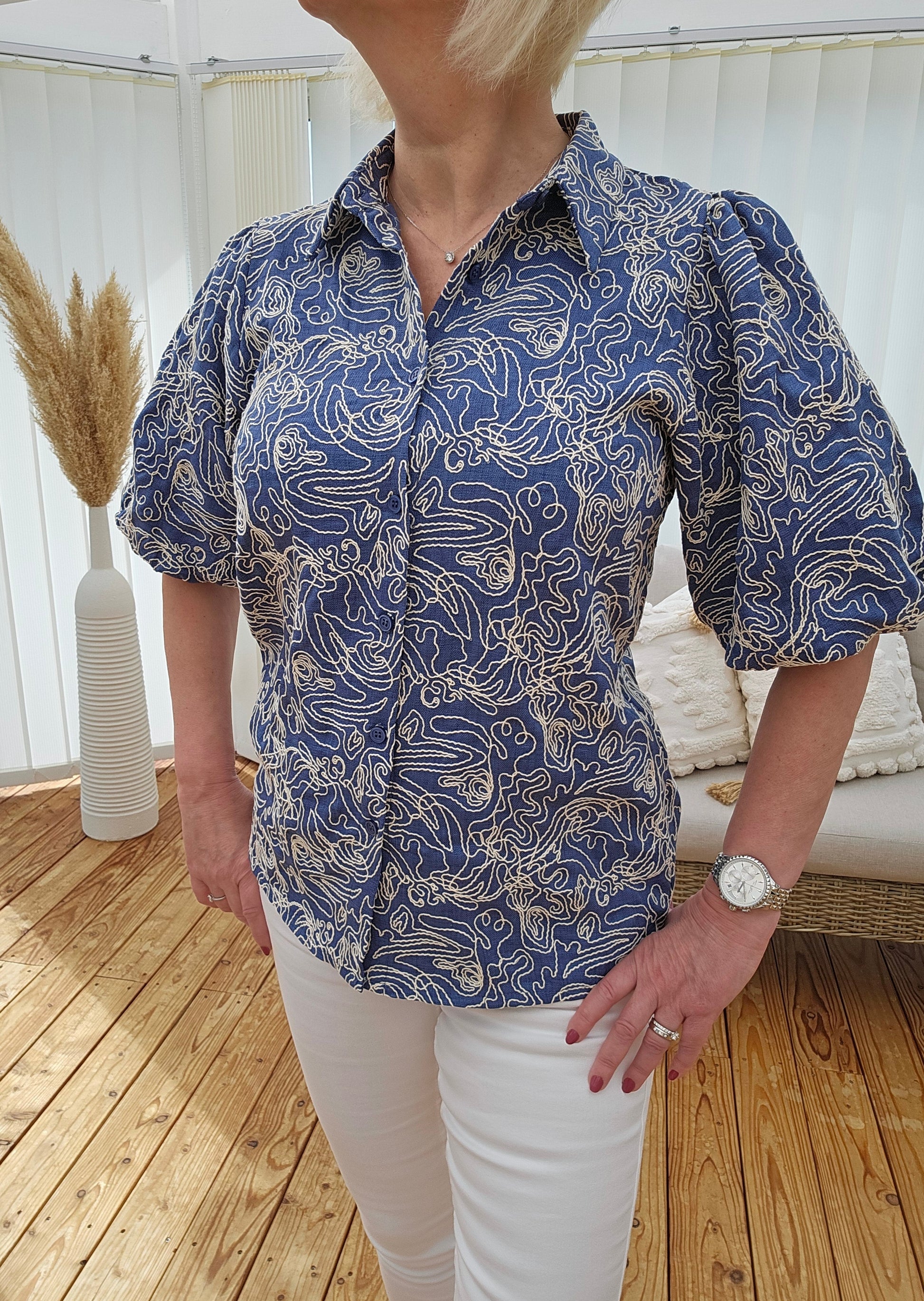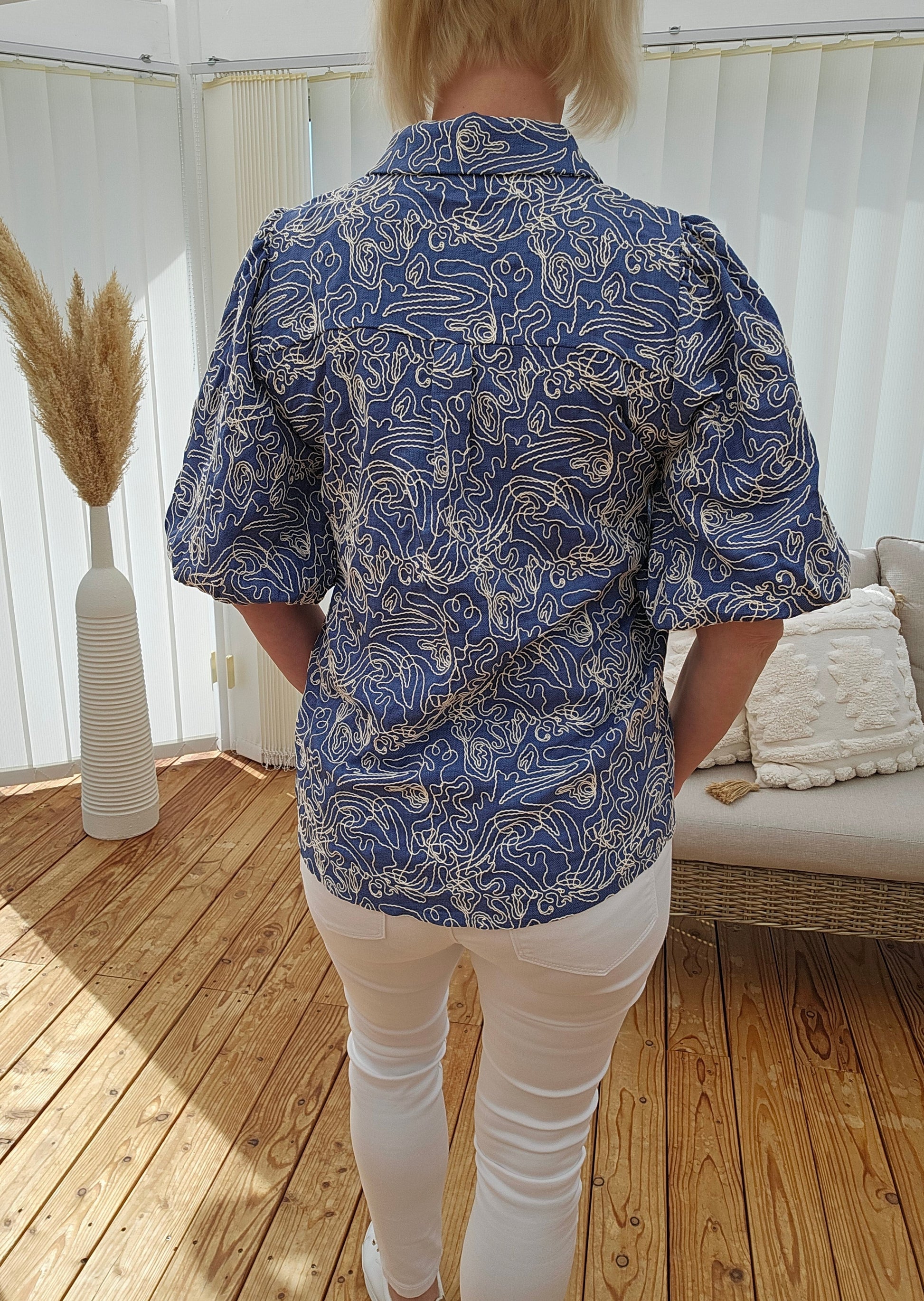 Produktbeskrivning: Mönstrad kortärmad skjortblus i denim. Mönstret är sytt på som en unik detalj. Klassisk skjortkrage och hel knapprad med blå knappar. Puffärm. Resår i ärm slutet