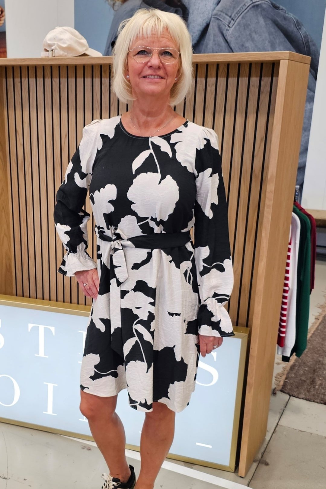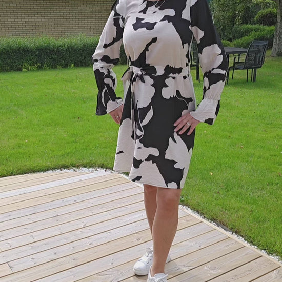 Produktbeskrivning: Blommönstrad klänning med rund hals, lång ärm och liten volang nertill. Knytband finns. Man kan bära den utan knytband också. Längd strax ovan knäet.