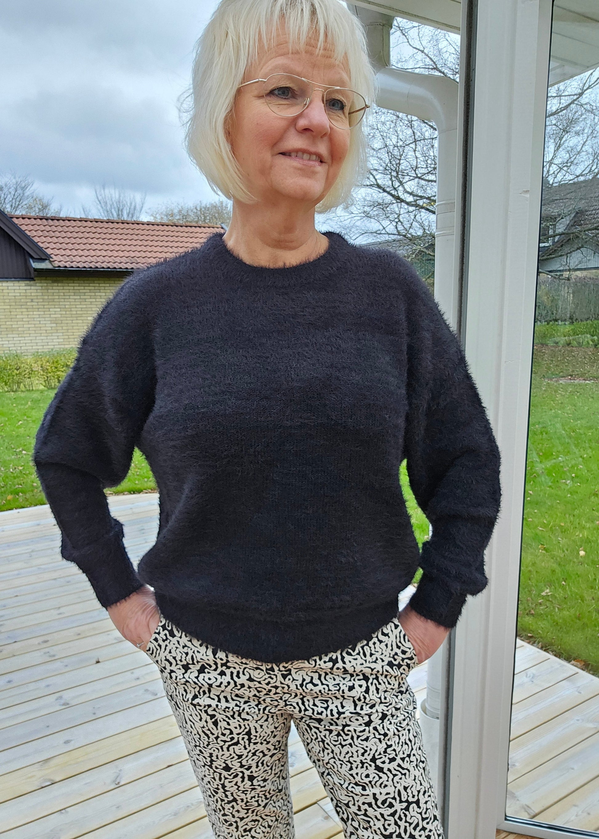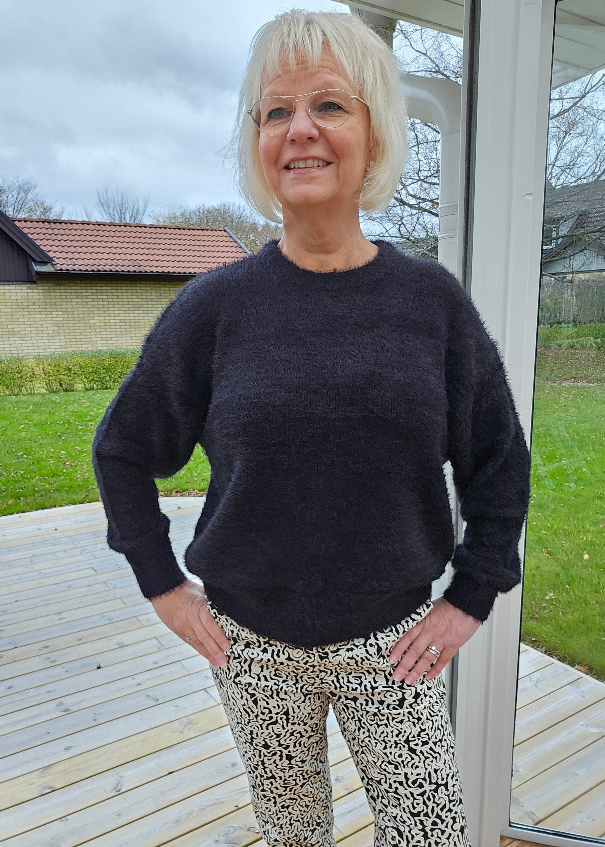 Mix&Match tips: Denna tröja har vi här satt till den stiliga men ändå en tuffa byxan Tiffany med sitt härliga mönster i svart/offwhite. Modellen är bootcut (normal upptill och lite utsvängda i benen nertill). Alla våra svarta väskor fungerar i stil till denna outfit. På bilden har vi Wilma väskan