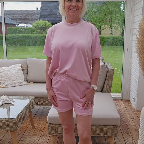 Produktbeskrivning: Mjuka och härliga ljuvligt rosa shorts med brett resår och dragsko i midjan. Finns även topp till så det blir ett set om du vill. Du köper shortsen och toppen var för sig.