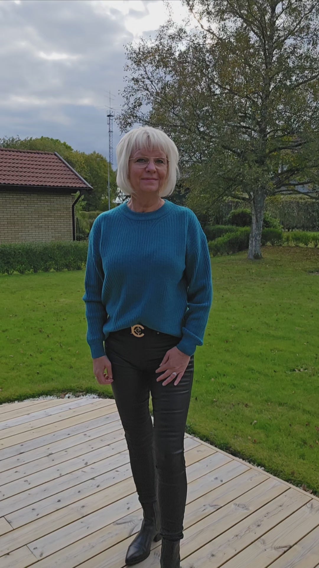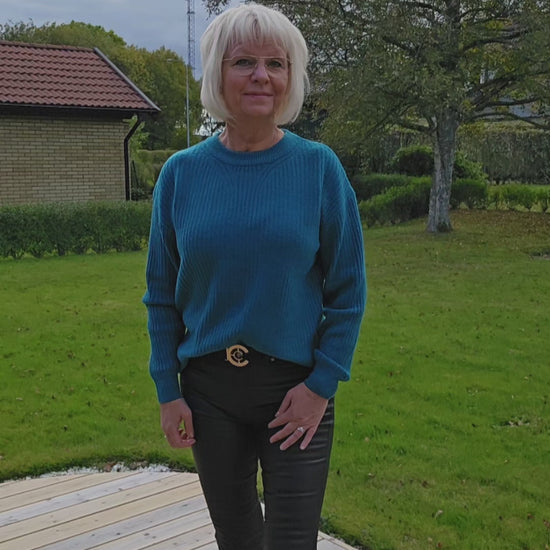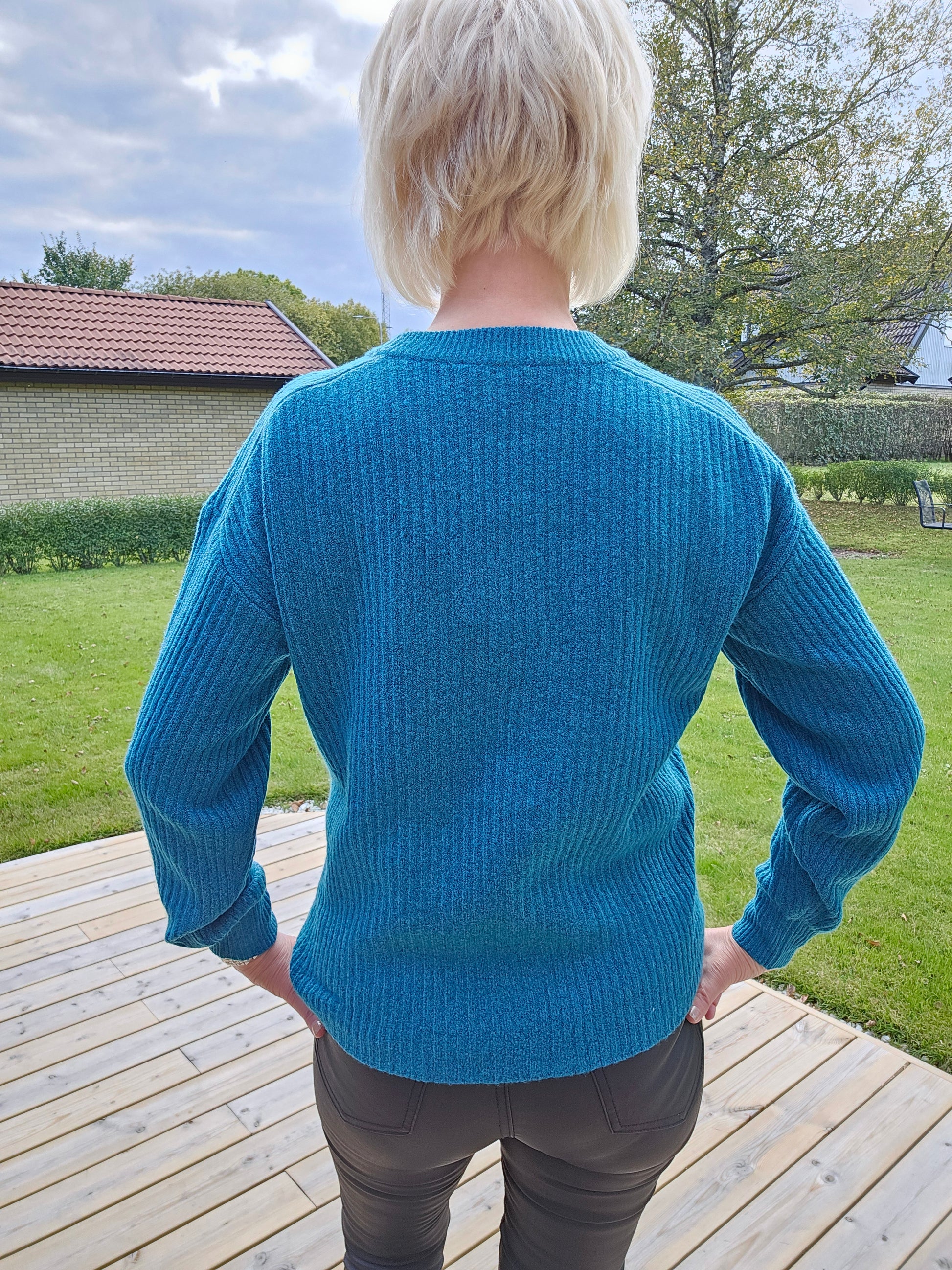 Produktbeskrivning: En mjuk turkos stickad tröja med rund hals, stickning i ärm slut och nertill.