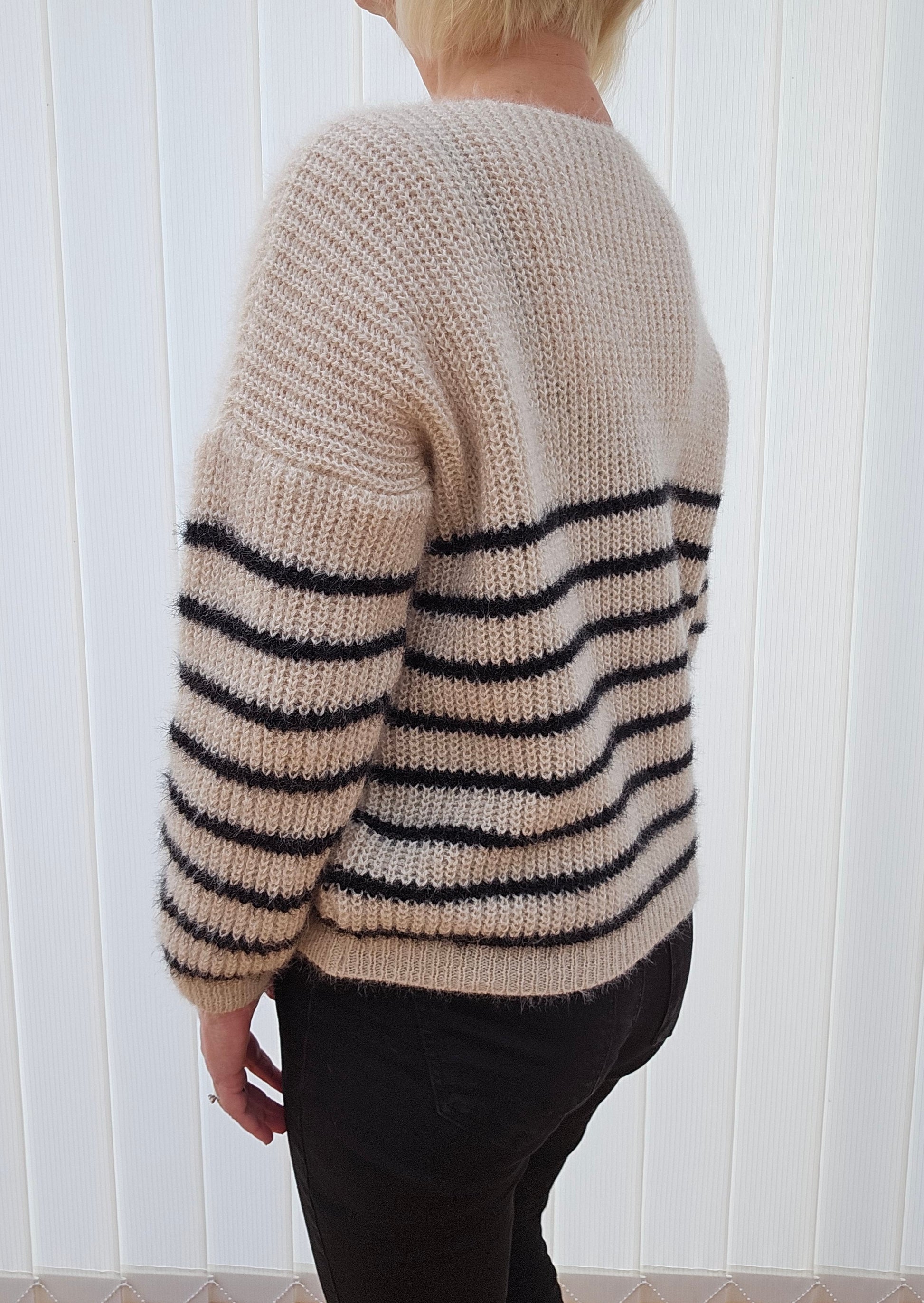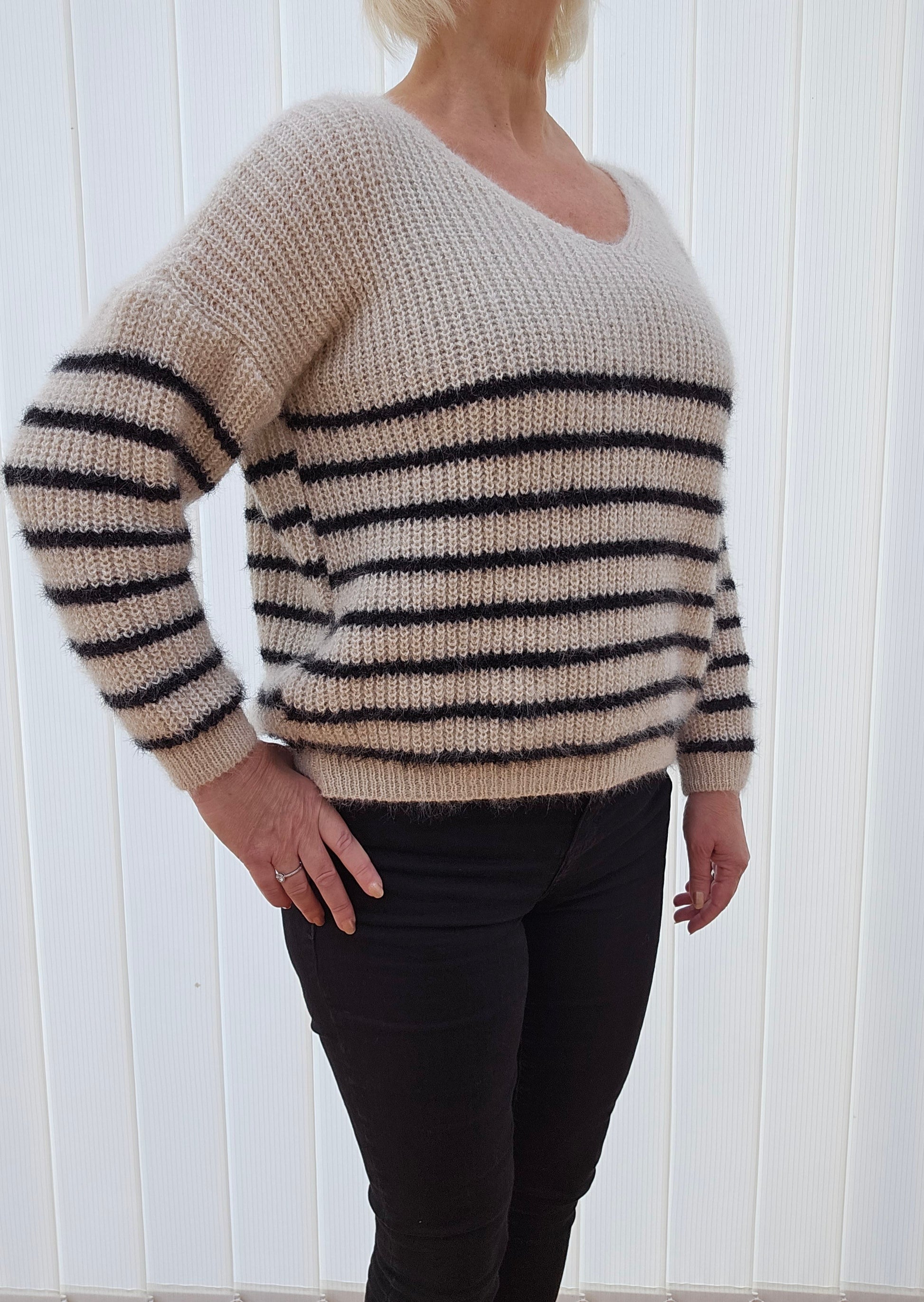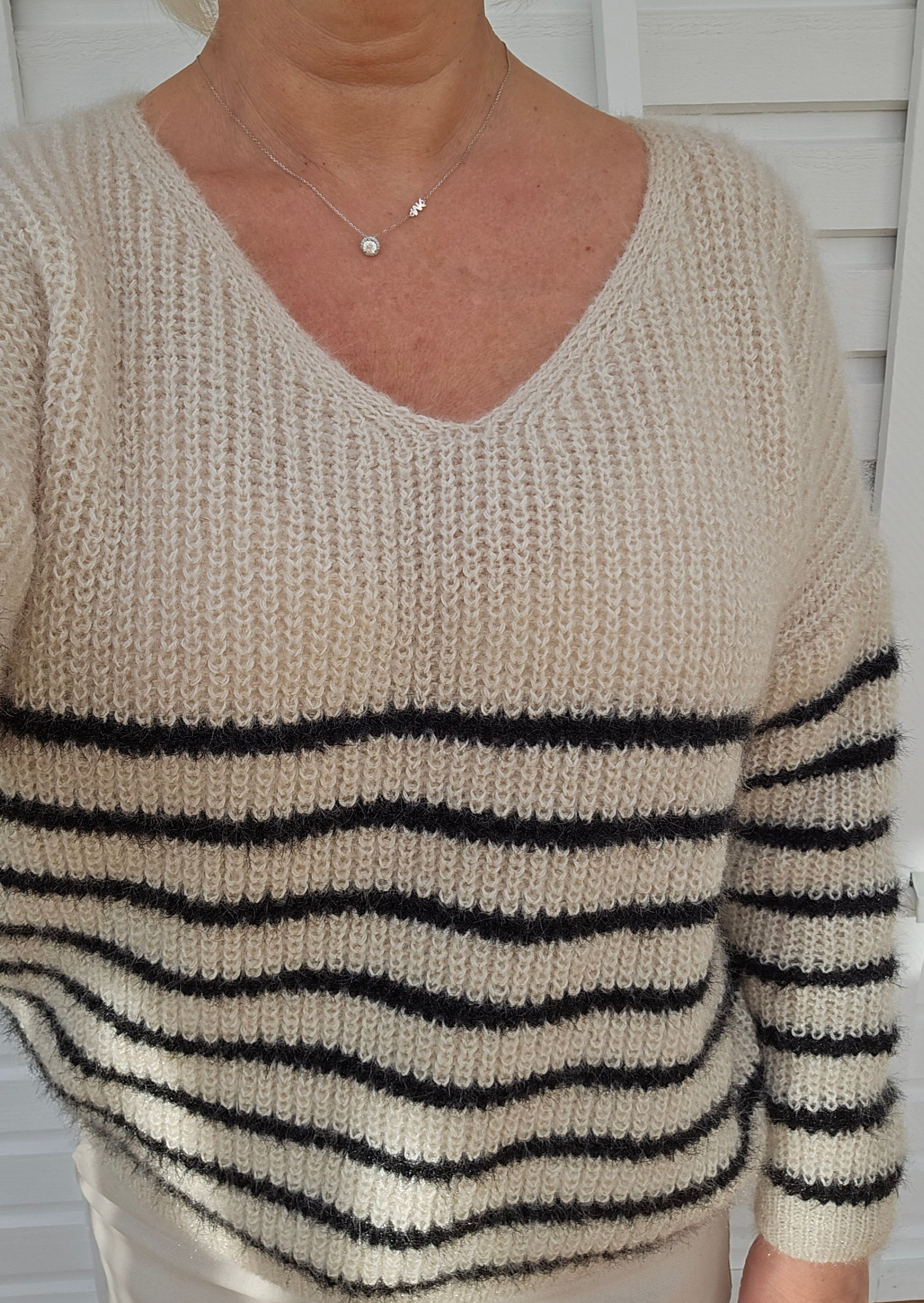 Produktbeskrivning: Creme färgad v-ringad tröja med svarta ränder. Lång ärm.
