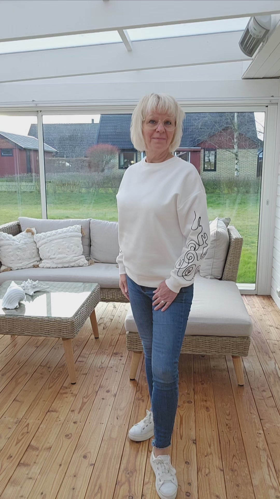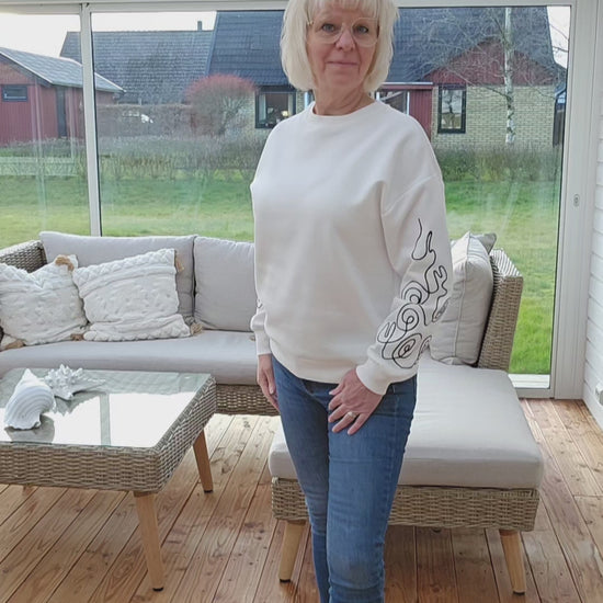 Produktbeskrivning: Vit långärmad sweatshirt med fint mönster nertill på ärmarna i svart. Rundhalsad samt klassiska muddar i tröjan.