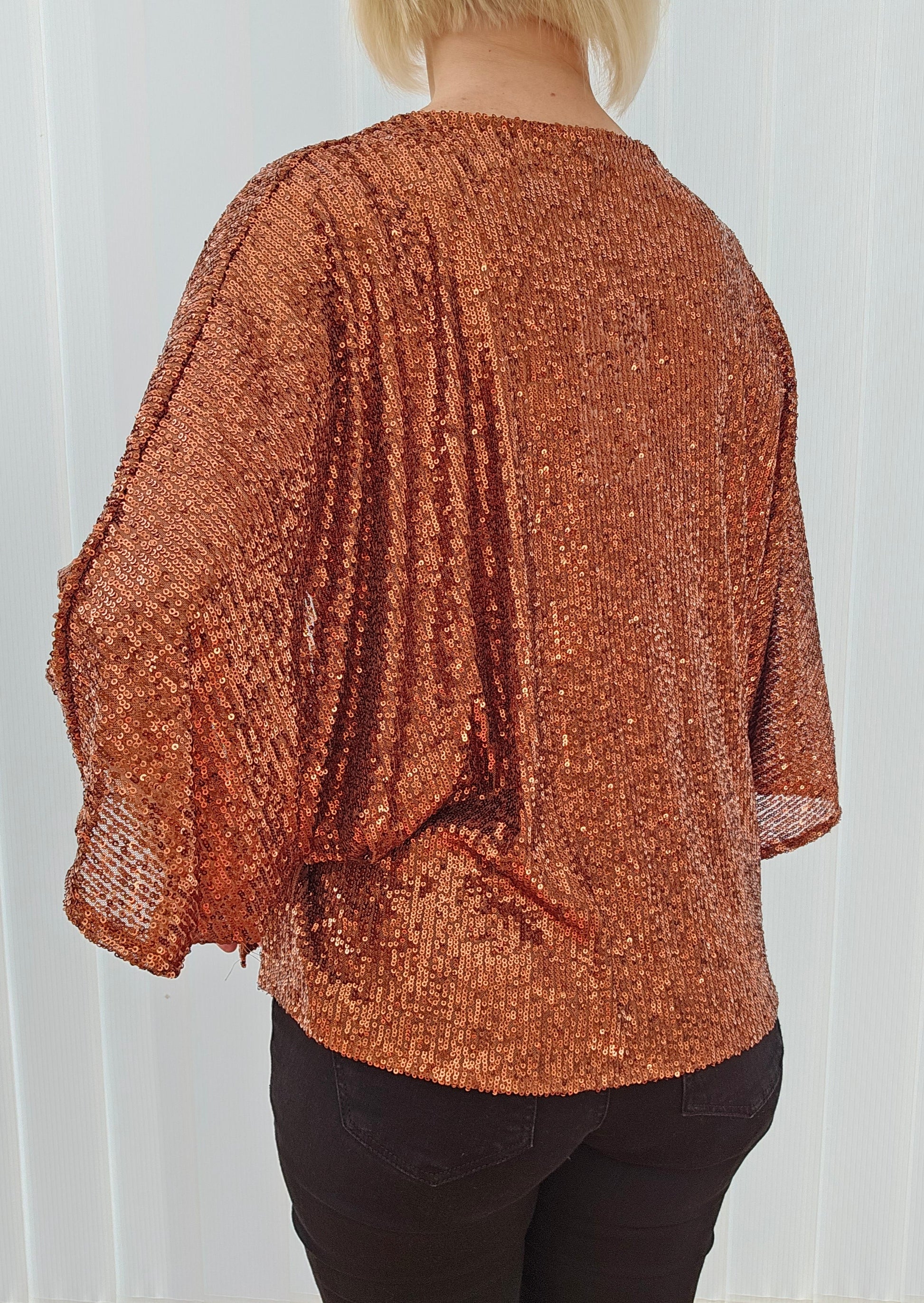 Produktbeskrivning: Kopparbrun paljett cardigan med en hank att knäppa med fram ifall man vill.
