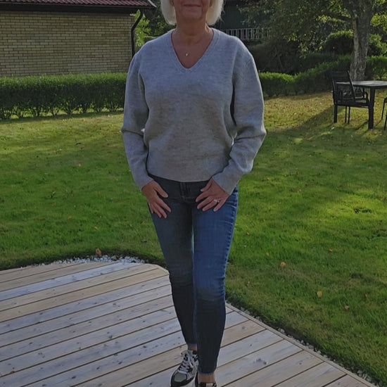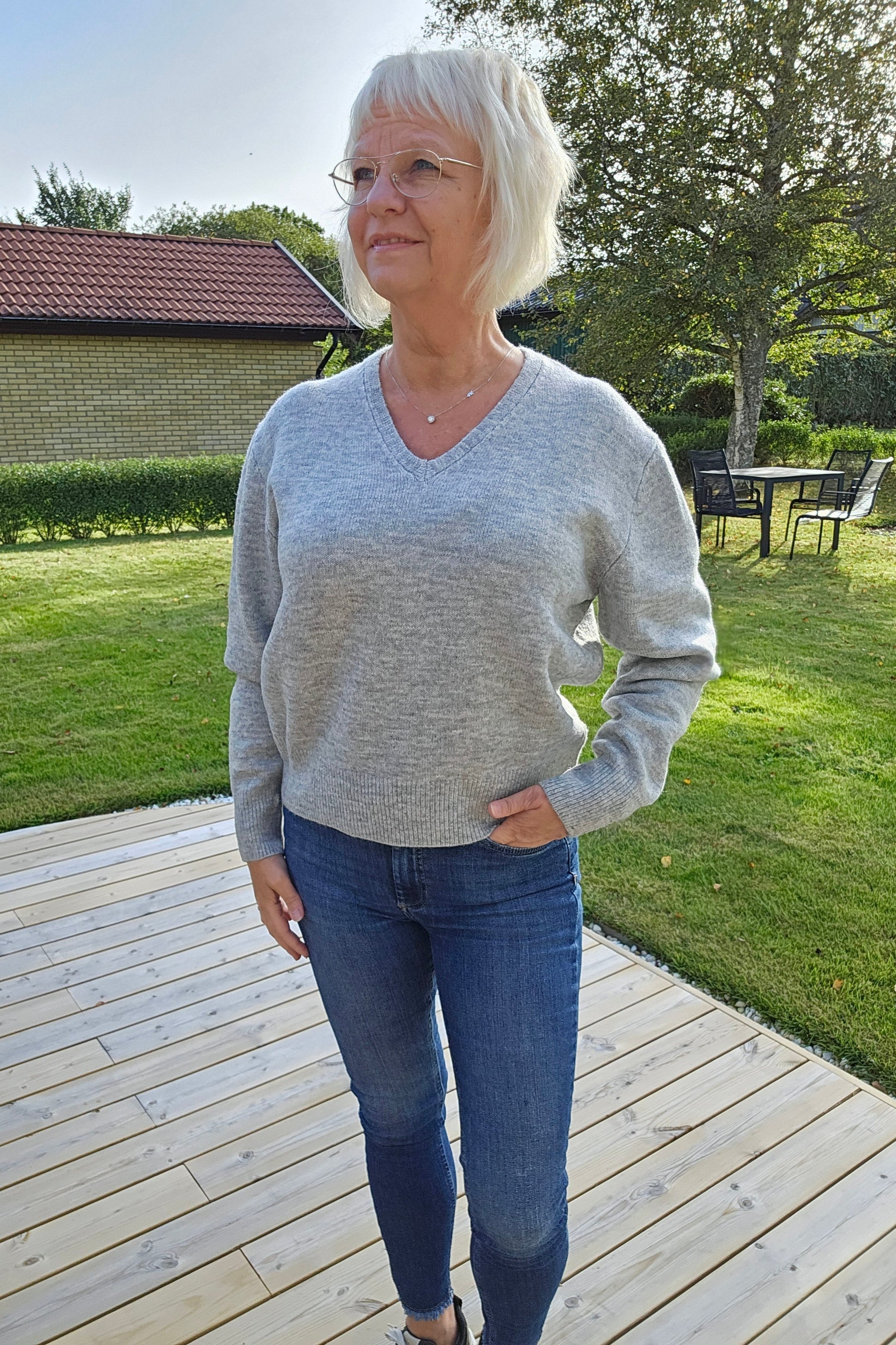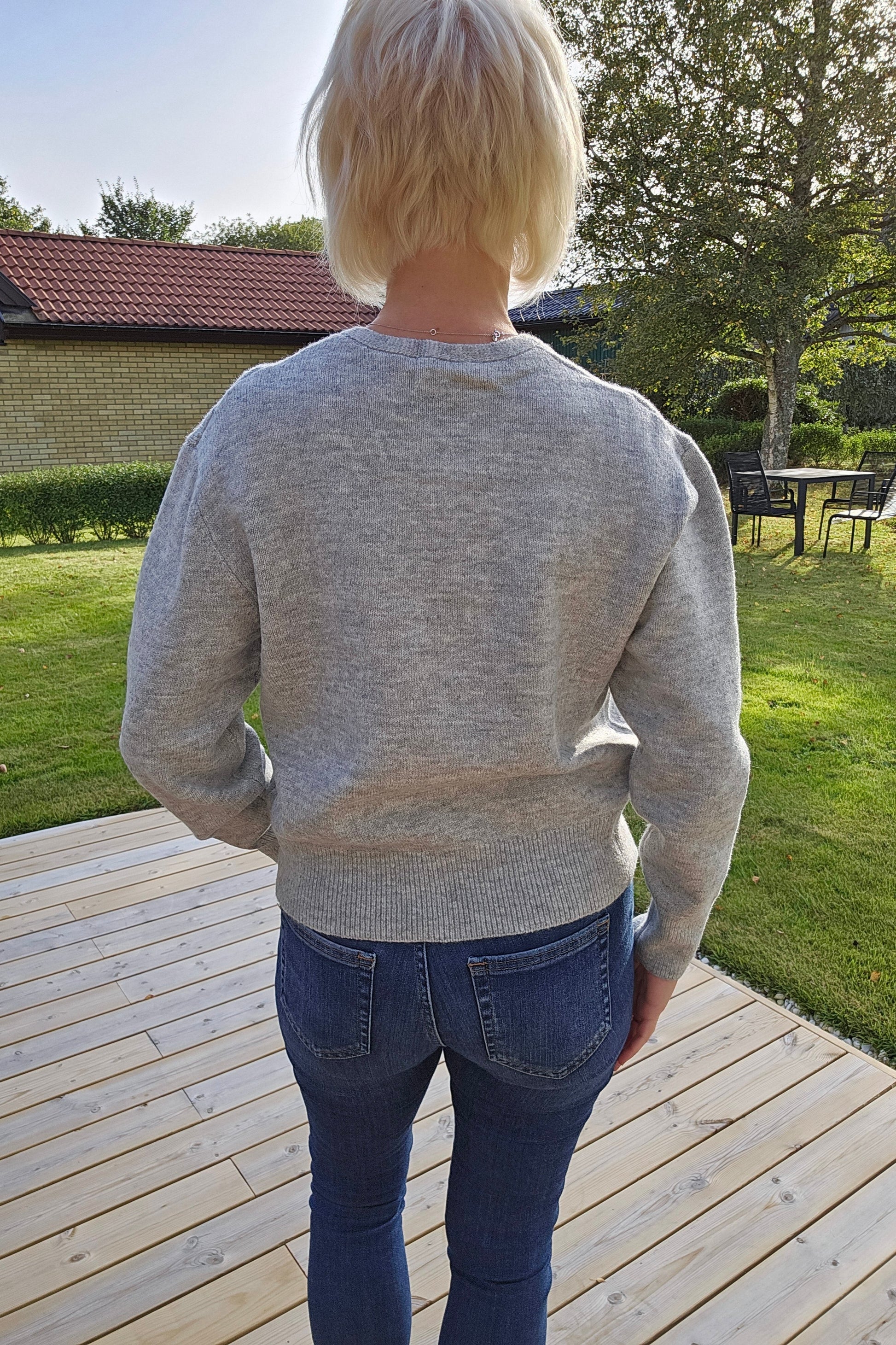 Produktbeskrivning: Grå stickad v-ringad tröja med lång ärm.