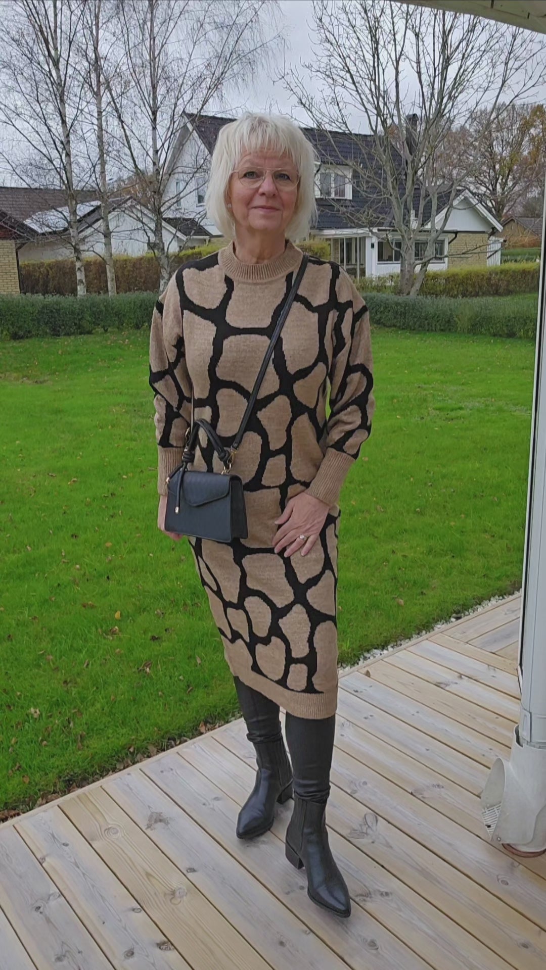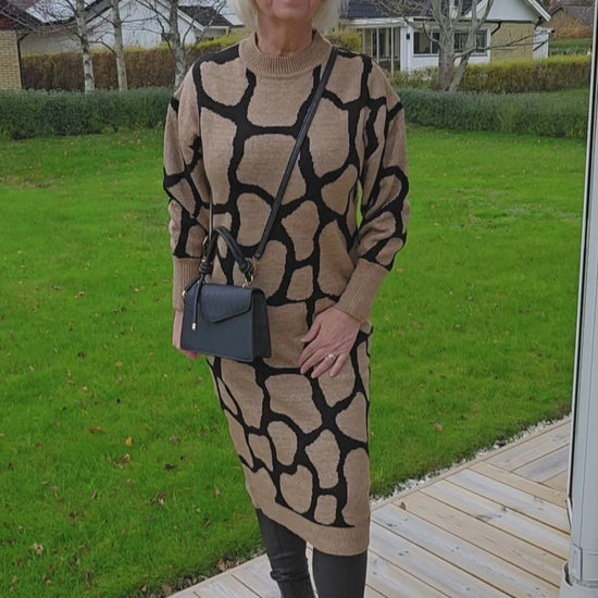 Produktbeskrivning: En längre stickad klänning med lång ärm och rund halsringning. Brun med svart trendigt mönster både fram och bak. Längd nedanför knäet.