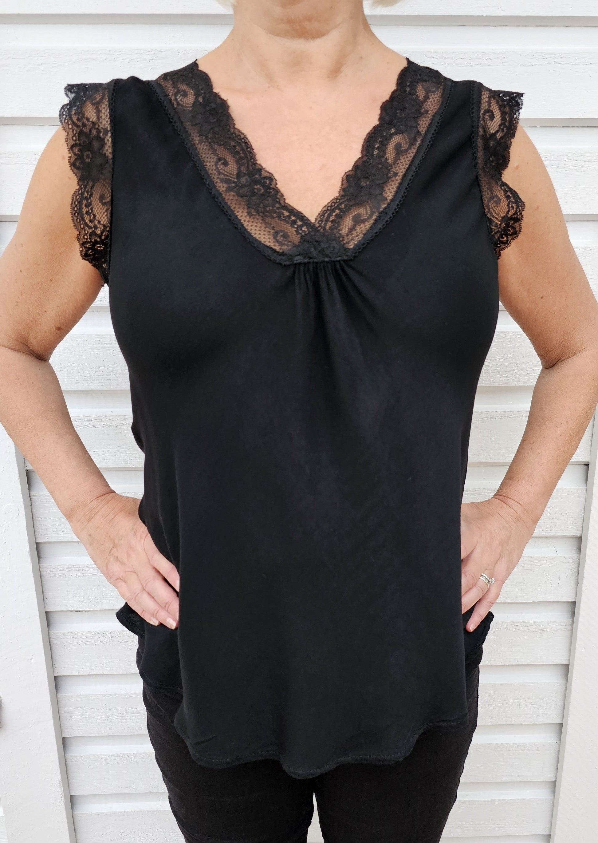 Produktbeskrivning: Topp/Linne med mjuk spets i hals och i ärm. Slösare i modellen nertill. Festligt under kavajen.