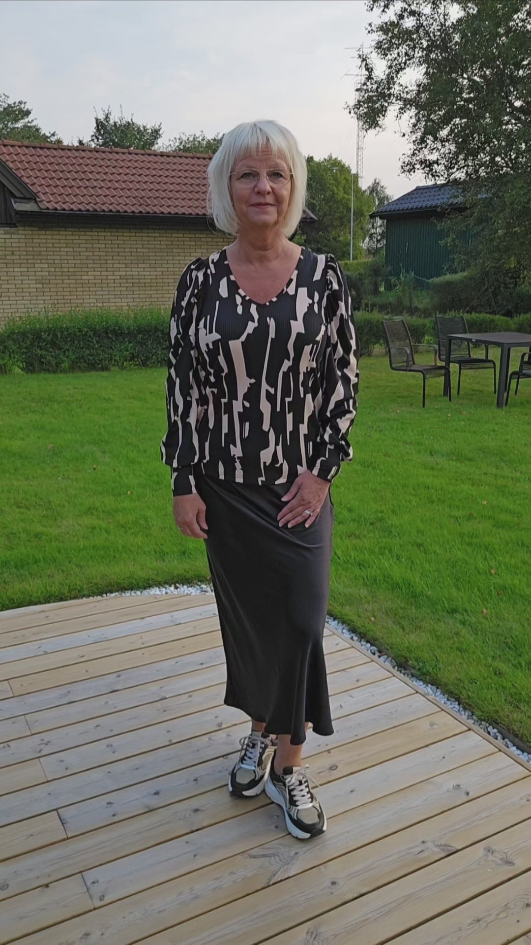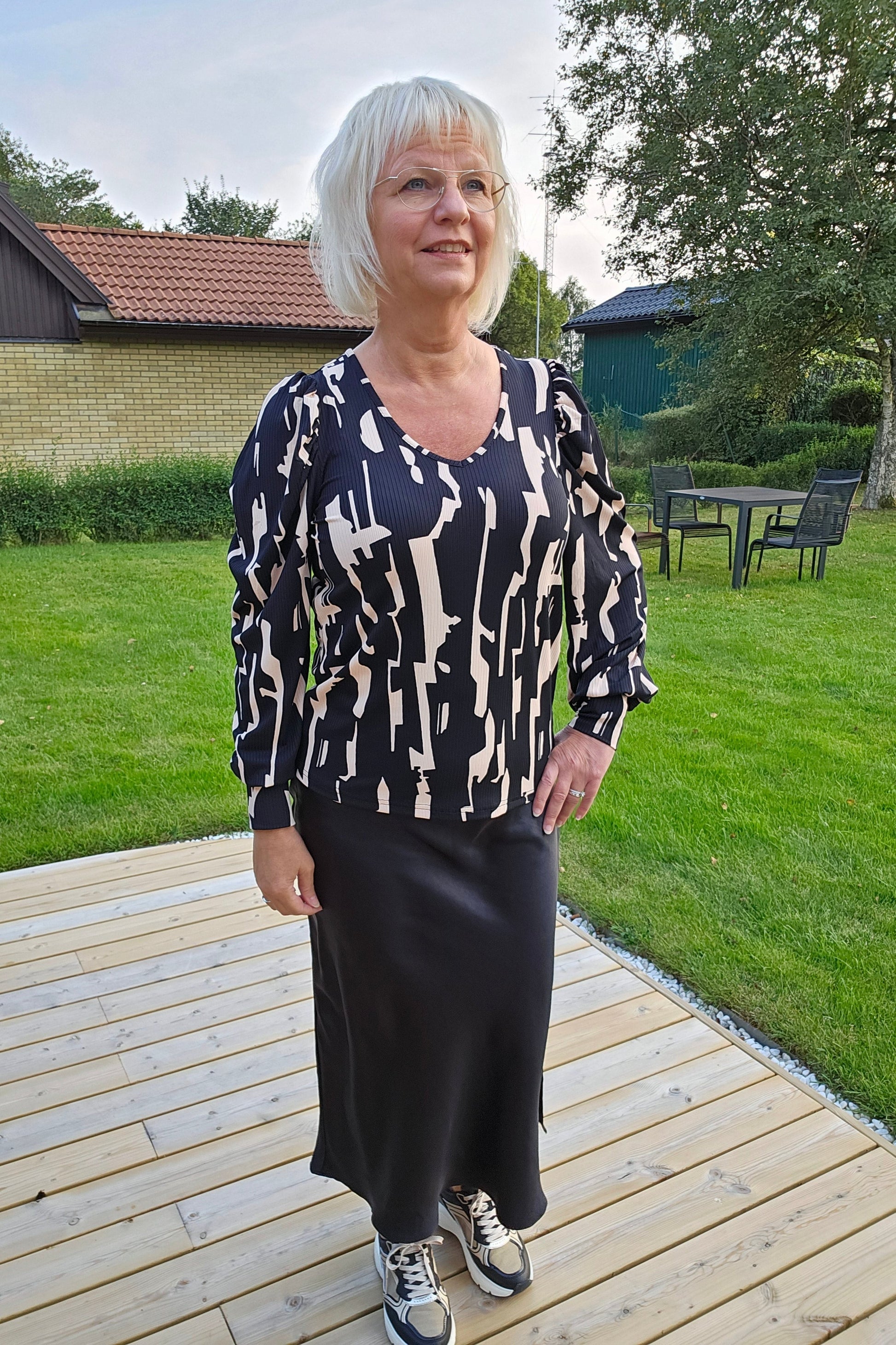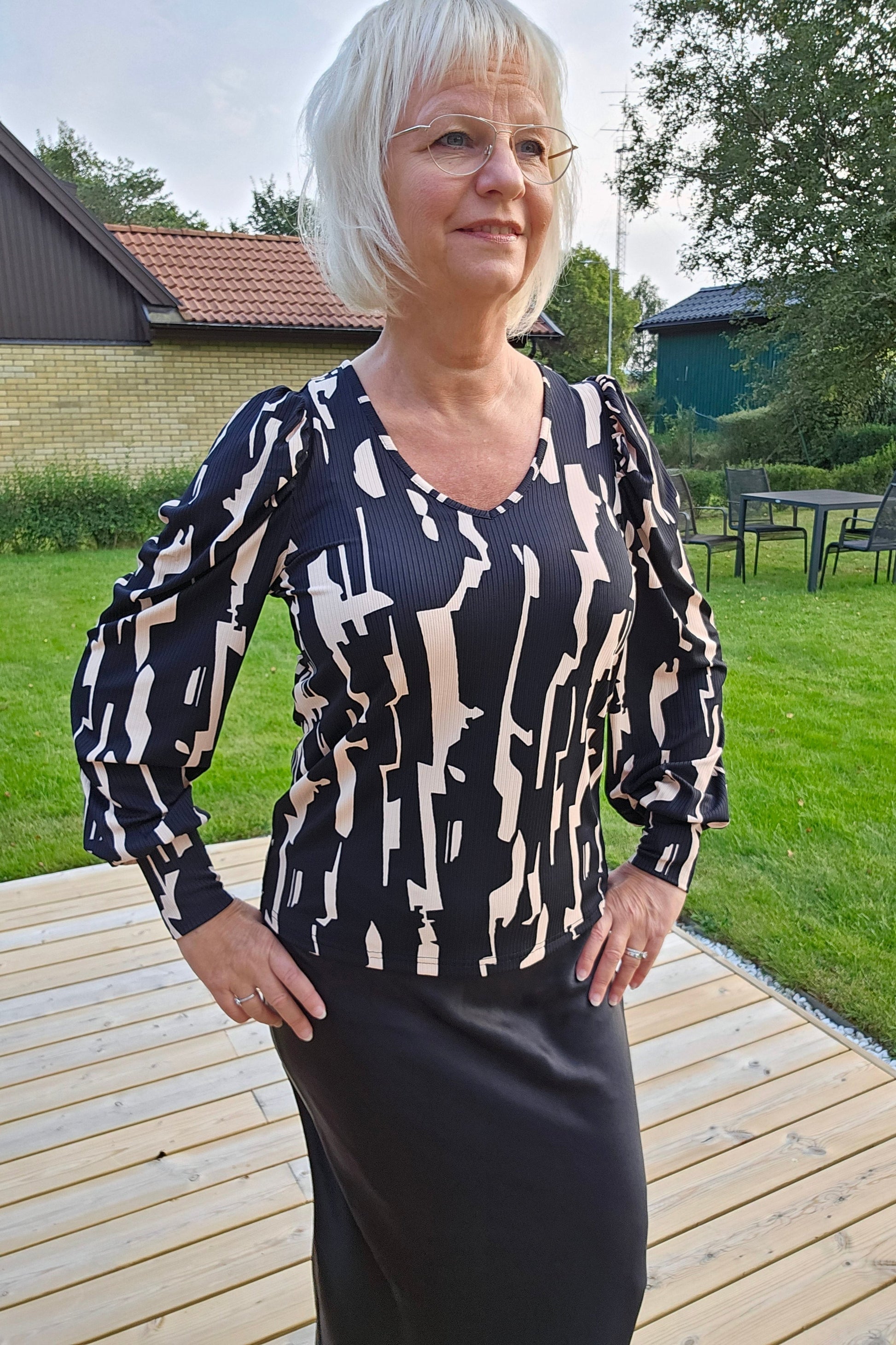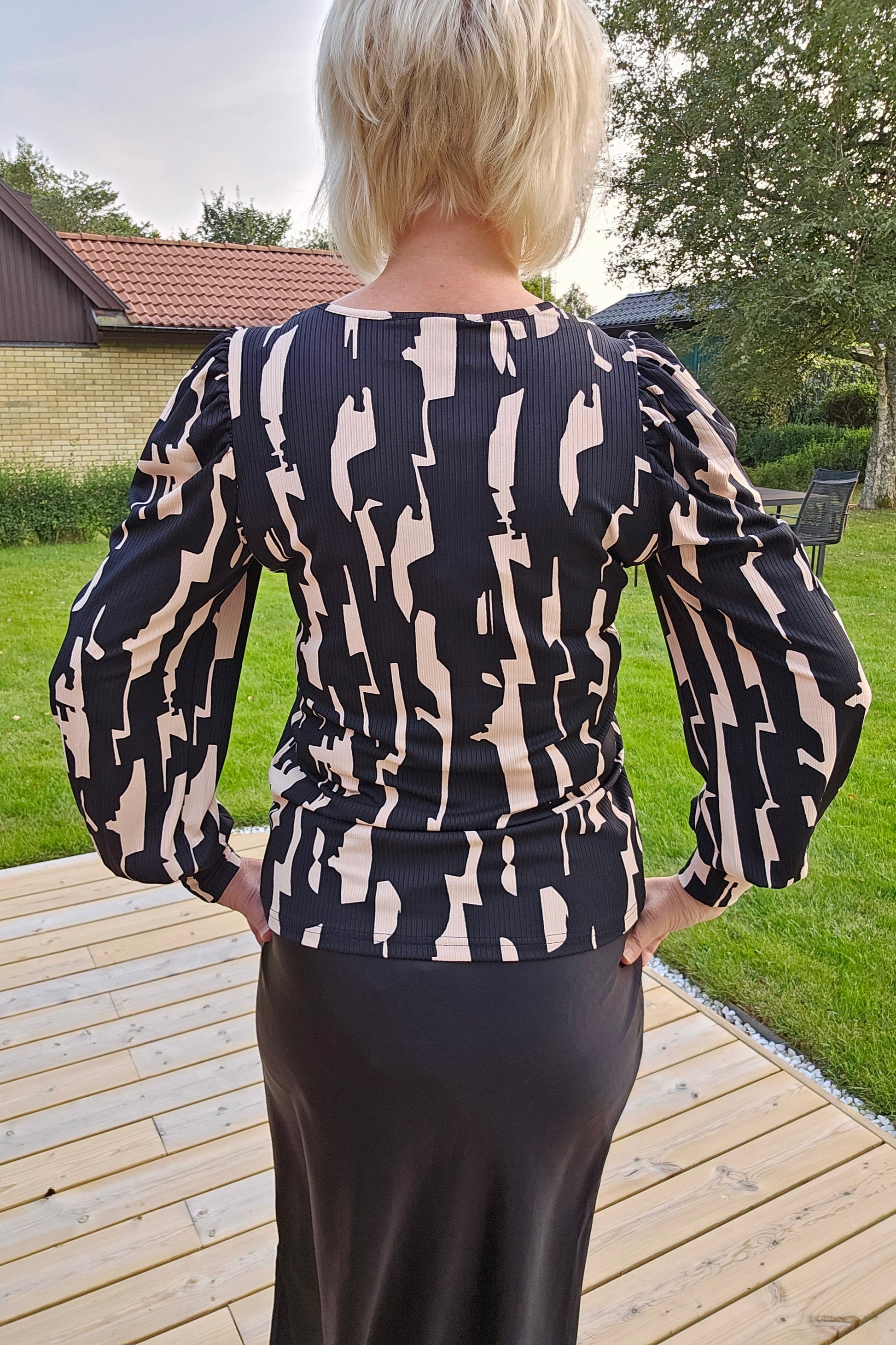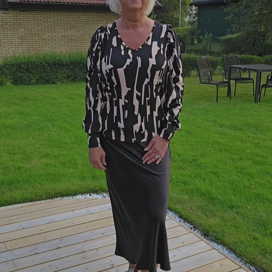 Produktbeskrivning: Svart och beige mönstrad topp med lång ärm och mudd i ärm slut. V- ringning i halsen. Materialet är väldigt mjuk, stretchig och följsam att ha på sig.