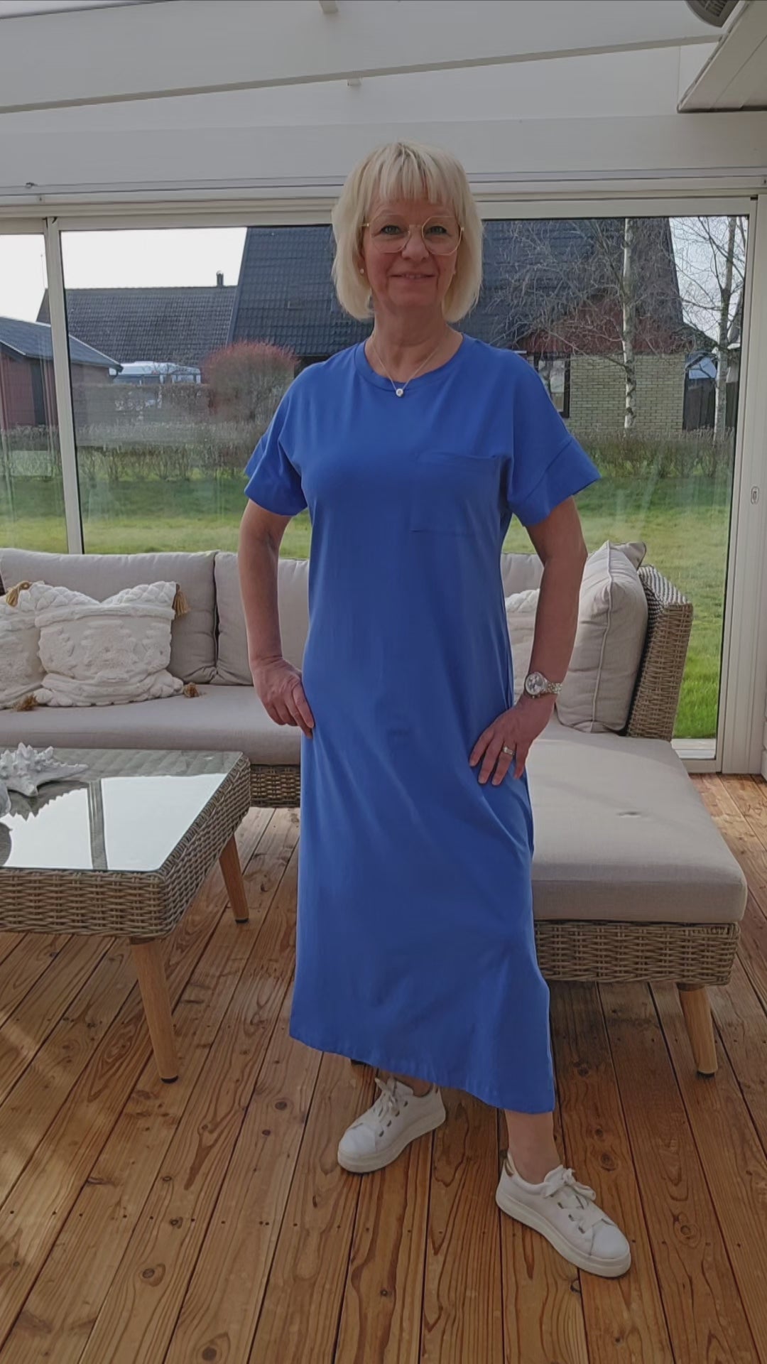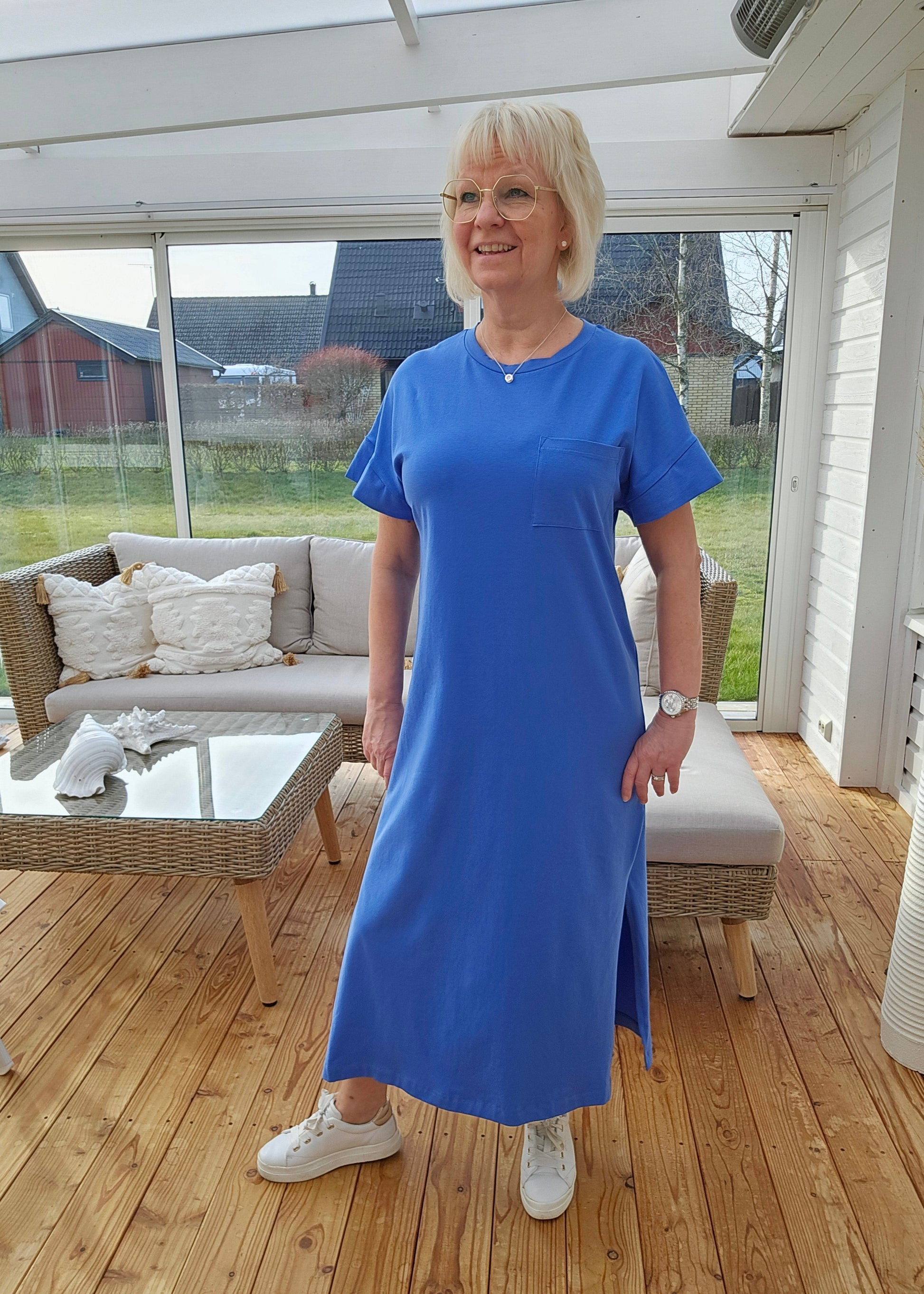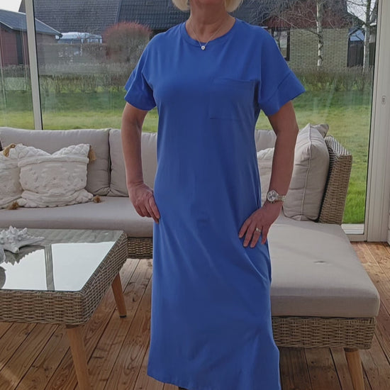 Produktbeskrivning: Blå lång t-shirt klänning med rund halsringning och kort ärm. Ärmen har ett fint avslut med ett sytt uppvik. En bröstficka. Sprund i båda sidor