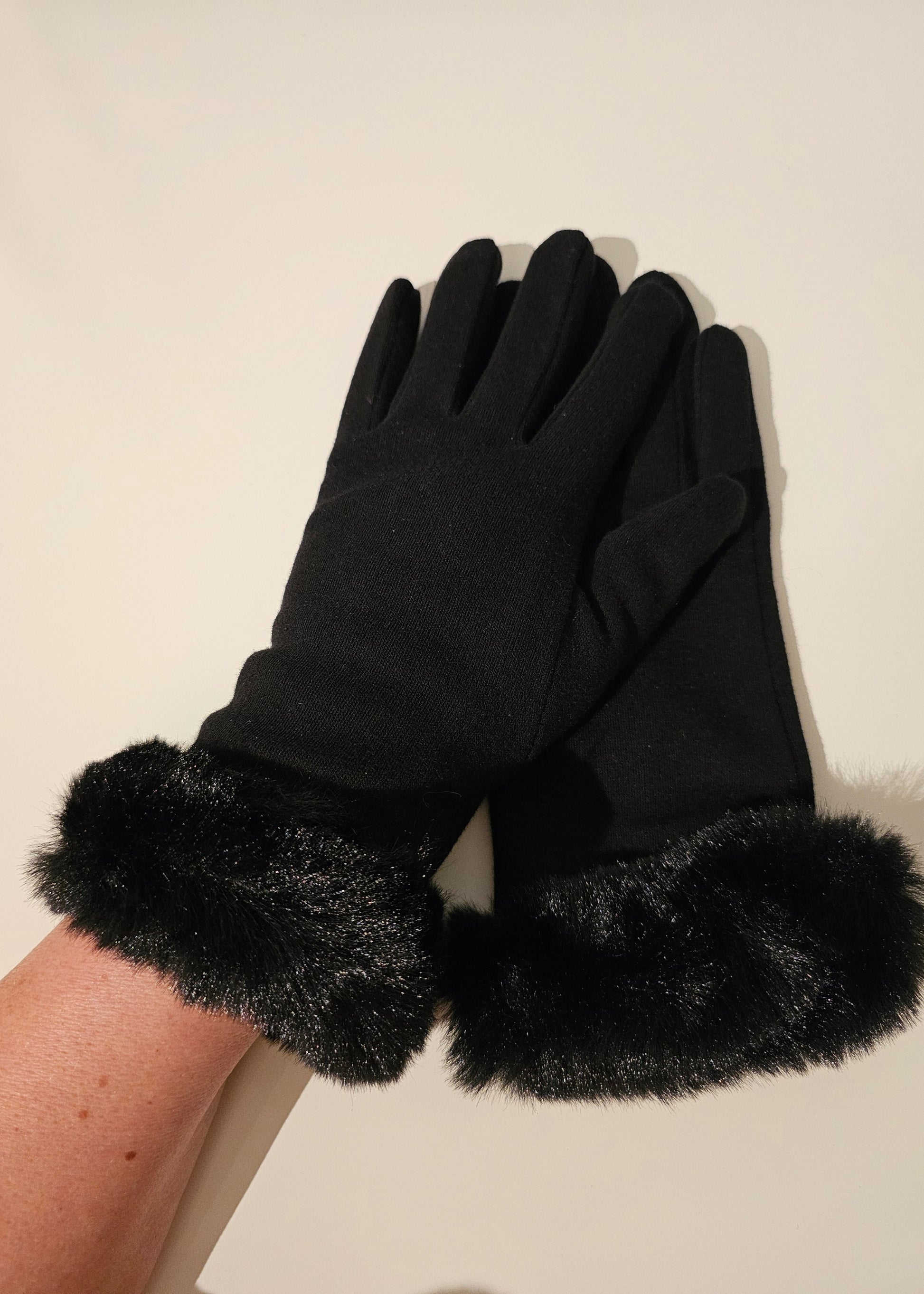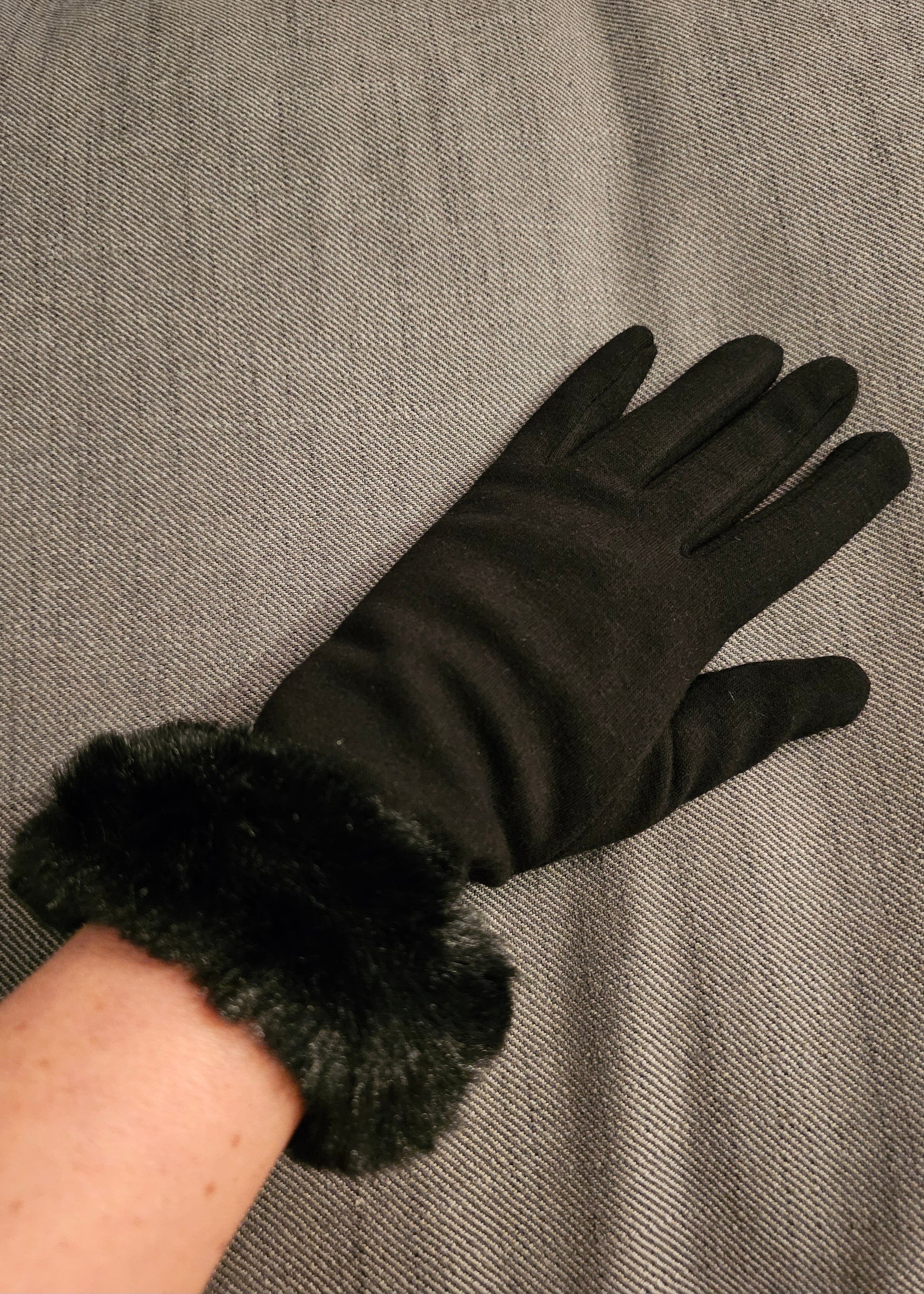 Produktbeskrivning: Svart handske i mjukt tyg med en kant av fuskpäls över handleden