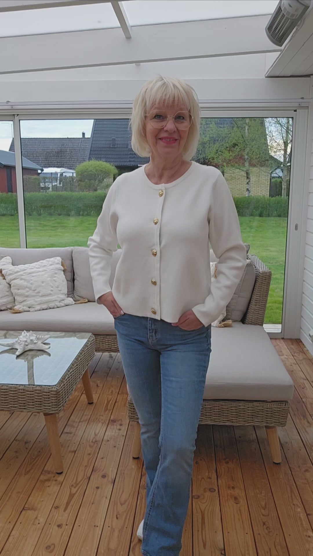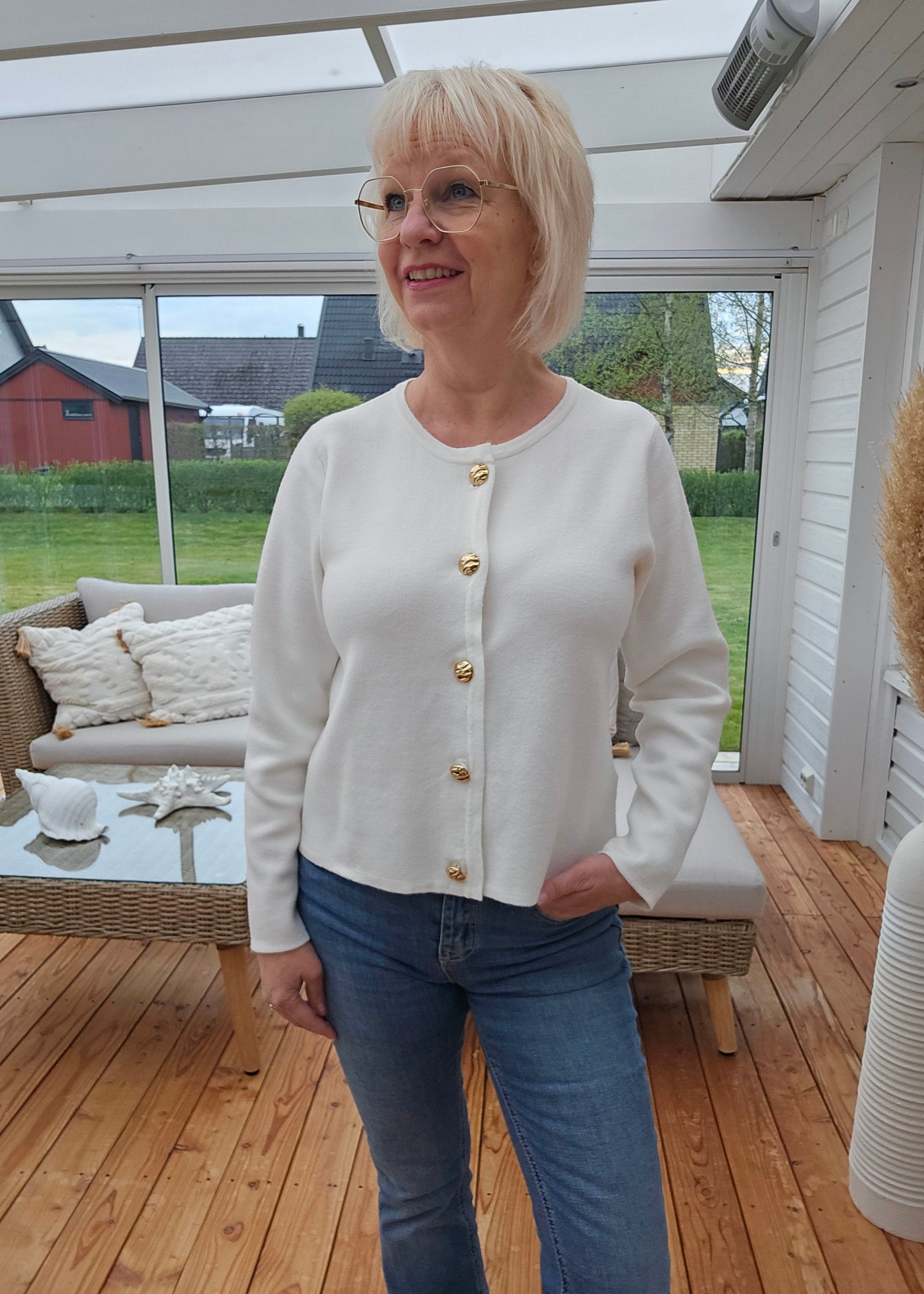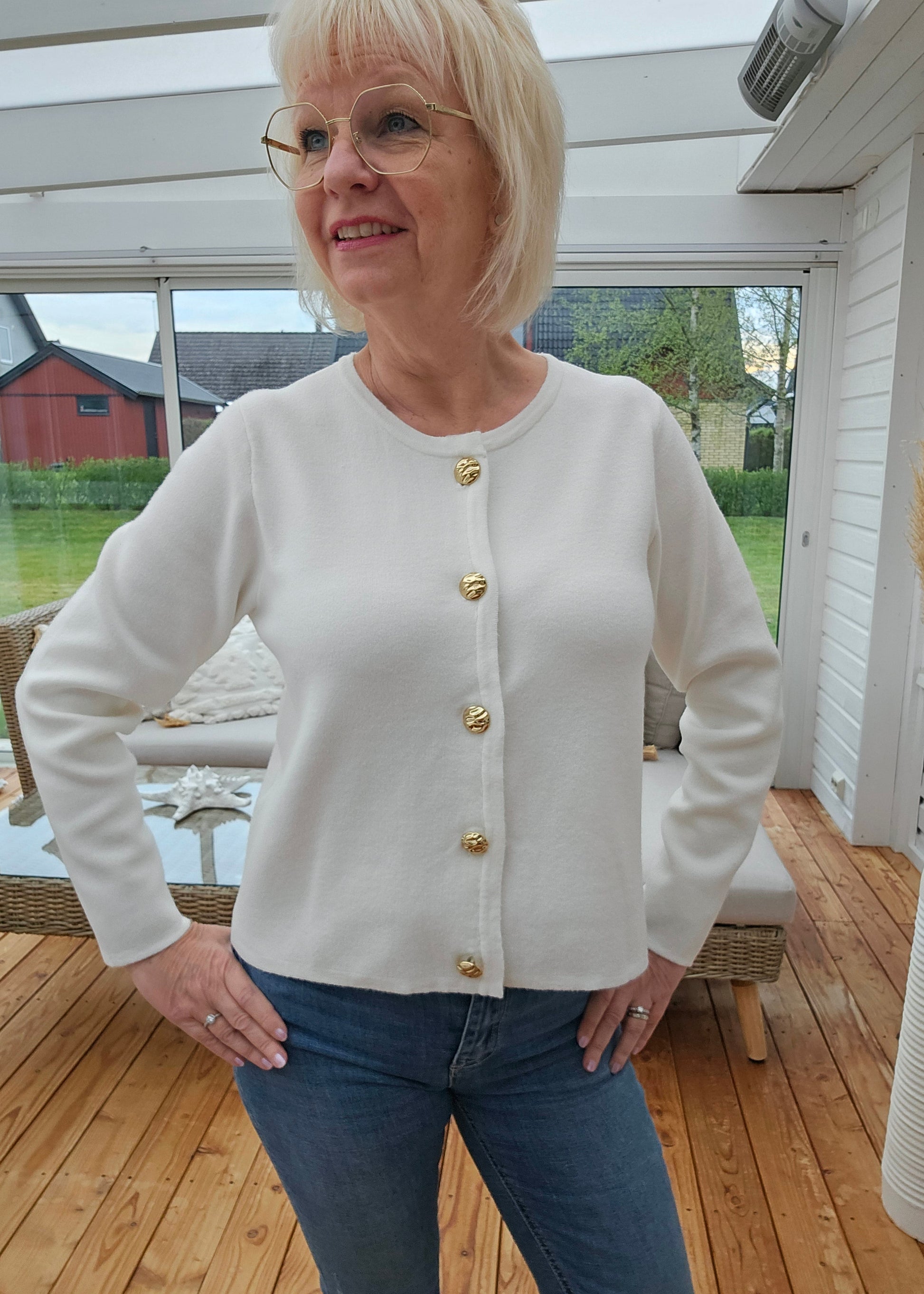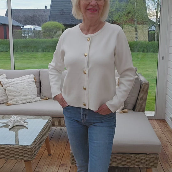 Produktbeskrivning: Cream färgad mjuk och härlig kofta med rund halsringning och lång ärm. Snygga guldfärgade knappar hela vägen fram. Koftan går att knäppa upp.
